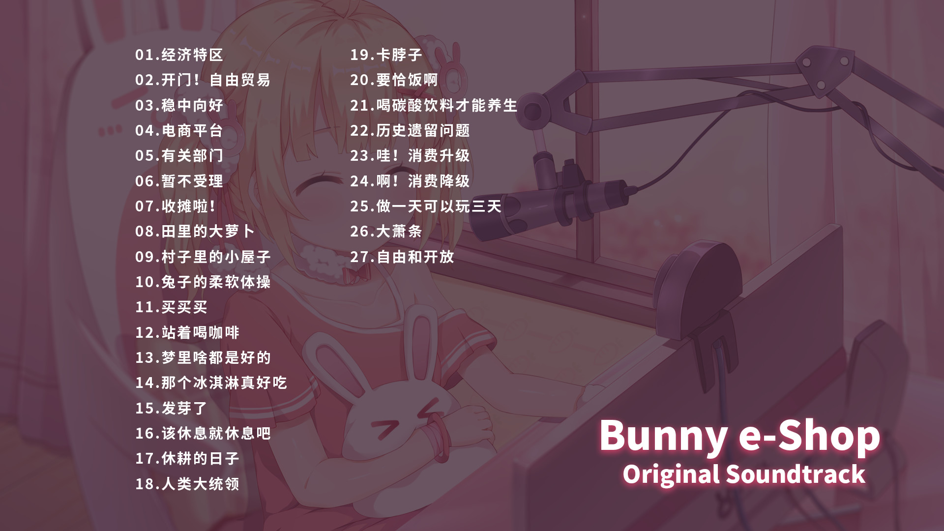《小白兔电商》原声音乐集,由音乐社团 Windbell Project 为本游戏专门打造。格式为mp3(192kbps和320bps)。本音乐集包含以下曲目:01.经济特区02.开门!自由贸易03.稳中向好04.电商平台05.有关部门06.暂不受理07.收摊啦!08.田里的大萝卜09.村子里的小屋子10.兔子的柔软体操11.买买买12.站着喝咖啡13.梦里啥都是好的14.那个冰淇淋真好吃15.发芽了16.该休息就休息吧17.休耕的日子18.人类大统领19.卡脖子20.要恰饭啊21.喝碳酸饮料才能养生22.历史遗留问题23.哇!消费升级24.啊!消费降级25.做一天可以玩三天26.大萧条27.自由和开放28.爱打工的小动物(主题曲) Далее