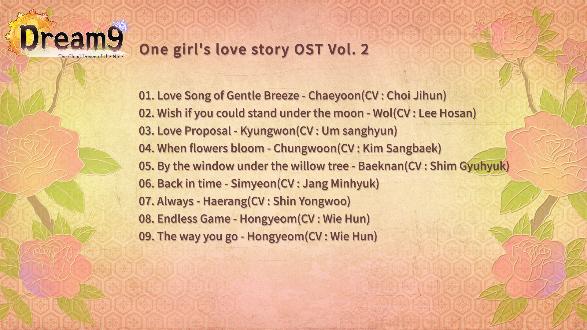 You can listen to the background music from the main episode of The Cloud Dream of the Nine and the theme song containing the individuality of each character.In addition, in line with the addition of Hongyeom's scenario, a new theme song of Hongyeom has been added!Enjoy this exciting and romantic story through the vivid and rich melodies used as backgrounds of the main story and special theme songs of the characters. This is a DLC that can be purchased while possessing the main game.The OST can be played in the game.One girl's love story OST Vol. 1. 01. One girl's love story02. Dreaming girl03. First love04. Moonlight ball05. The first date06. Gentle breeze07. BIRDKISS08. Noblesse09. An elegy10. Sparkling whisper11. Lovely you12. Anxiety13. Light steps14. Sadness15. Sneak up16. Crossing17. Crisis18. Moving forward19. War hero20. Lamentation21. Time to rest22. A happy afternoon23. Honey, sweety, candy24. The fruit of love25. To the girl who dreams26. Celestial harmony27. Dreaming girl (twinkle version)28. First love (remembrance version)29. Moonlight Ball (fantasia version)30. First date (lullaby version)31. Noblesse (melancholy version)32. Sparkling whisper (dreaming version)33. Sadness (weeping version)34. Story of the Star and the Moon - Chaeyoon (CV: Choi Jihun)35. The Story of the Star and the Moon (off vocal version)36. The Story of the Star and the Moon (piano version)37. FarewellOne girl's love story OST Vol. 2. 01. Love Song of Gentle Breeze - Chaeyoon(CV : Choi Jihun)02. Wish if you could stand under the moon - Wol(CV : Lee Hosan)03. Love Proposal - Kyungwon(CV : Um sanghyun)04. When flowers bloom - Chungwoon(CV : Kim Sangbaek)05. By the window under the willow tree - Baeknan(CV : Shim Gyuhyuk)06. Back in time - Simyeon(CV : Jang Minhyuk)07. Always - Haerang(CV : Shin Yongwoo)08. Endless Game - Hongyeom(CV : Wie Hun)09. The way you go - Hongyeom(CV : Wie Hun) Далее