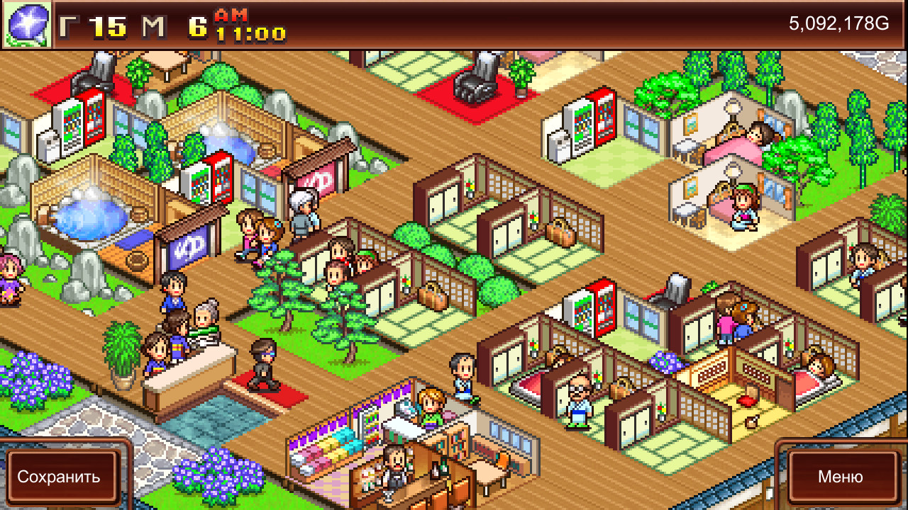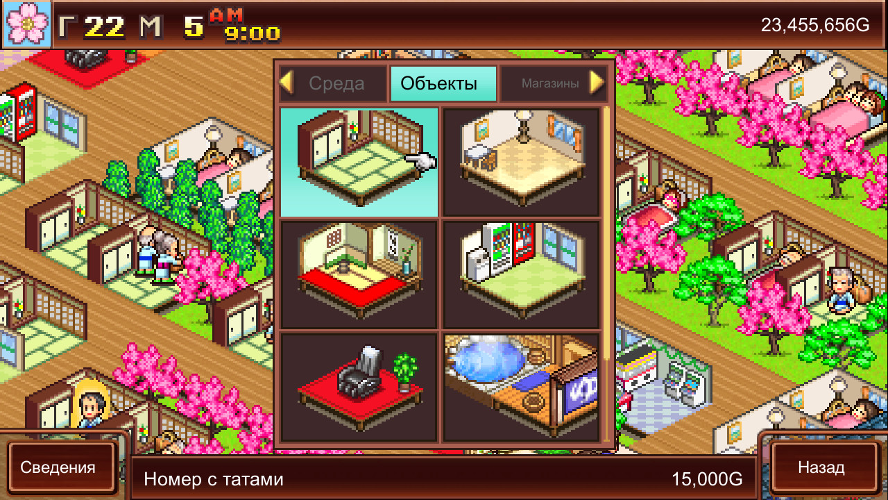 "Постройте собственный курорт и приведите его к процветанию буквально одним касанием! Комнаты, рестораны, игровые автоматы и бани — размещайте их так, чтобы привлекать посетителей в свой курорт с горячими источниками и повышать его известность! Создайте идеальный японский сад с фонарями, соснами и азалиями, чтобы привлекать особых клиентов, вроде поп-звезд и писателей. Первым может быть только один! Сможете добиться успеха? -- Чтобы увидеть все наши игры, выполните поиск по запросу «Kairosoft»!" Далее