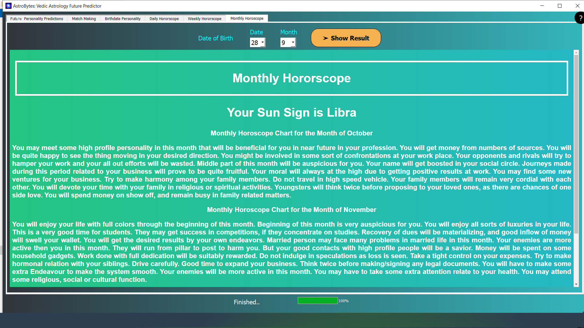 AstroBytes: Vedic Astrology Predictor is your personal software for getting your future predictions of life or check your compatibility with others based on Indian Vedic Method; which utilizes your date & place of birth to generate birth charts and predictions. AstroBytes helps users to have a better life and future. It allow them to know the future of a person and his life, usually we need to check his Horoscope. This Vedic Horoscope software allow its users to delve deeper into the past, present, and future events in their lives in relation to all facets of human life. Knowing the usual Horoscope Predictions in advance can assist a person in anticipating, preparing for, and surviving. With the help of astrobytes, you can forecast Horoscopes for Education; Profession; Promotion; Sudden Rise and Fall; Name, Fame, and Popularity; Finance and Wealth; Foreign Travels; Fortune (Luck); Life-Span; Marriage or Multiple Marriages; Health, Diseases; Old Age Life; Popularity, House Properties; Children; Conveyance/Vehicle, and Death. You can get your complete Vedic Astrology report with precise predictions about your life, including future predictions for each of your consecutive years. You can get predictions related with Finance, Personality, Relationship, Numerology, Lucky points etc along with it it allows your to check your relationship compatibility with your other partners. Note: The predictions from this software is quantitative (are are sometime prone to errors) and should be taken as for guidance only. It requires commitment, dedication and love from both the partners in a cordial relationship, Intense handwork is mandatory for changing your destiny or life around with a partner. Hence, users are advised to take this predictions for advice only and not to be taken as a sole ruler to judge themselves and there people around. Далее