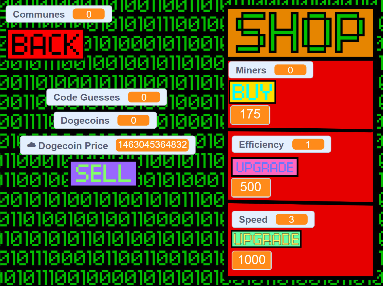 Communist Clicker is more than just a clicker game! You can buy stonks from the stonks market which will go up and down over time in addition to the player also being able to affect it, you can even mine dogecoin and have miners try to crack the code so you can sell the coins, and you can even pay a visit the secret black mar.. Never mind. You can also upgrade your clicks to gain more money for each click, and you can also buy and upgrade workers who will click the hammer and sickle for you!