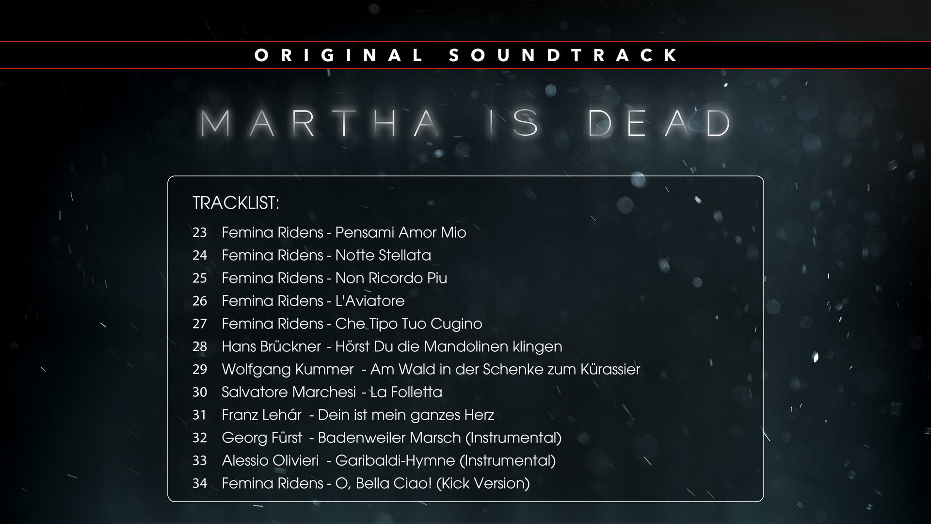 Прочувствуйте в полной мере дух Martha Is Dead с помощью саундтрека из игры: почти два часа завораживающей эклектичной музыки, которая одновременно напоминает об историческом периоде, в который происходит действие, и усиливает зловещую атмосферу. Саундтрек включает в себя в том числе подводную музыку группы Between Music из проекта Aquasonic, мрачные, но завораживающие мелодии Aseptic Void, композитора The Town of Light, а также переосмысленные версии классических композиций и оригинальные треки, написанные и исполненные Франческой Мессиной, звездой диско 90-х, известной под псевдонимом Femina Ridens. Далее