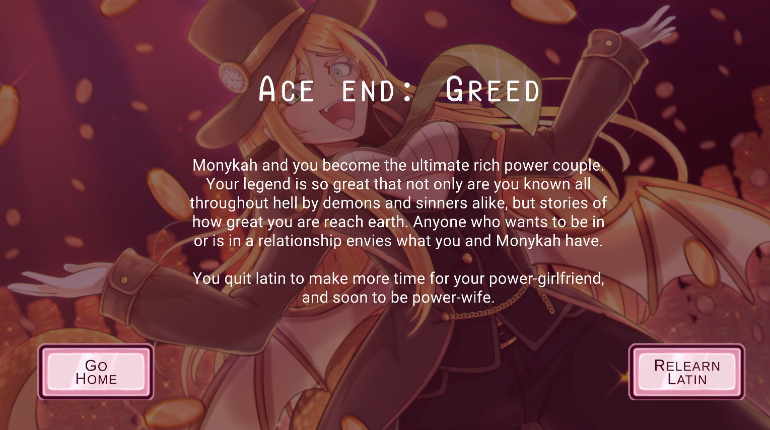 What's the Right Sin For You?. You've studied latin for a few months and you accidentally read a passage from your textbook which lands you in a demon speed dating bar. Unsure of how to get home, you decide to ride it out and see how things go. Maybe you'll even find a date! Or maybe you'll find death? Who knows..Features. Type: Visual NovelLanguage: EnglishGenre: Comedy, Romance, Slice of LifeDuration: Approximately 3-4 hoursPlatforms: Windows, MacOver 30 endings!7 CGs!7 completely different demon bachelorettes!And my will to live!Note: Latin textbooks not included. Must be purchased separately. Далее