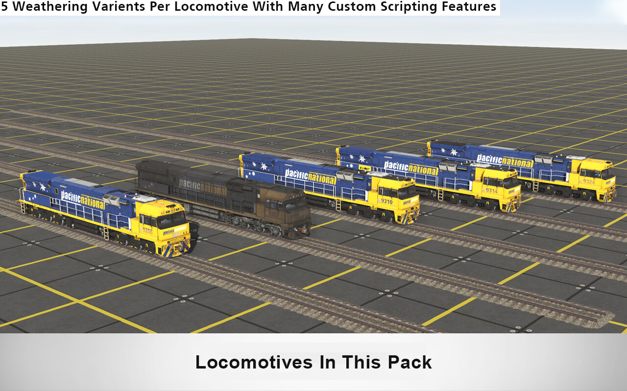 The C44aci is a model of Australian heavy duty diesel electric locomotive designed by UGL Rail and built at the Broadmeadow factory. It is operated by a number of rail freight operators. The design is based on the National Rail NR class but with some modifications and upgraded features. The C44aci has become the new baseline standard product of Australian Locomotives with many operators ordering these locomotives. These Locomotives Feature: -Full PBR Texturing -Highly Detailed Custom Cab -Animated Doors -Animated Windows -Number Board and External Light Toggles -Custom Scripting -Emissive Lighting -Custom Dynamic Brake Sounds -Custom Locomotive Brake Sounds -Custom Traction Motor Sounds -Blinds Lowered/Raised Toggle -Coupler Flag On/Off Toggle -Dynamic Break Throttle Credits: Credit to S301, Scratchy, H222, lesley & itzmejane for beta testing these locomotives and providing feedback Credit to S301, GDennish and 3DZug for providing the locomotive with advanced scripting and features. Credit to Graham Baker and Aaron Hobson for providing locomotive reference photos, locomotive information and helpful resources Credit to Azervich for providing realistic locomotive engine physics Credit to all others who helped during production of this locomotive. Pack includes the following locomotives: PN 92 08+ PN 93 23+ PN 92 23+ PN 93 12+ PN 93 18+ Далее