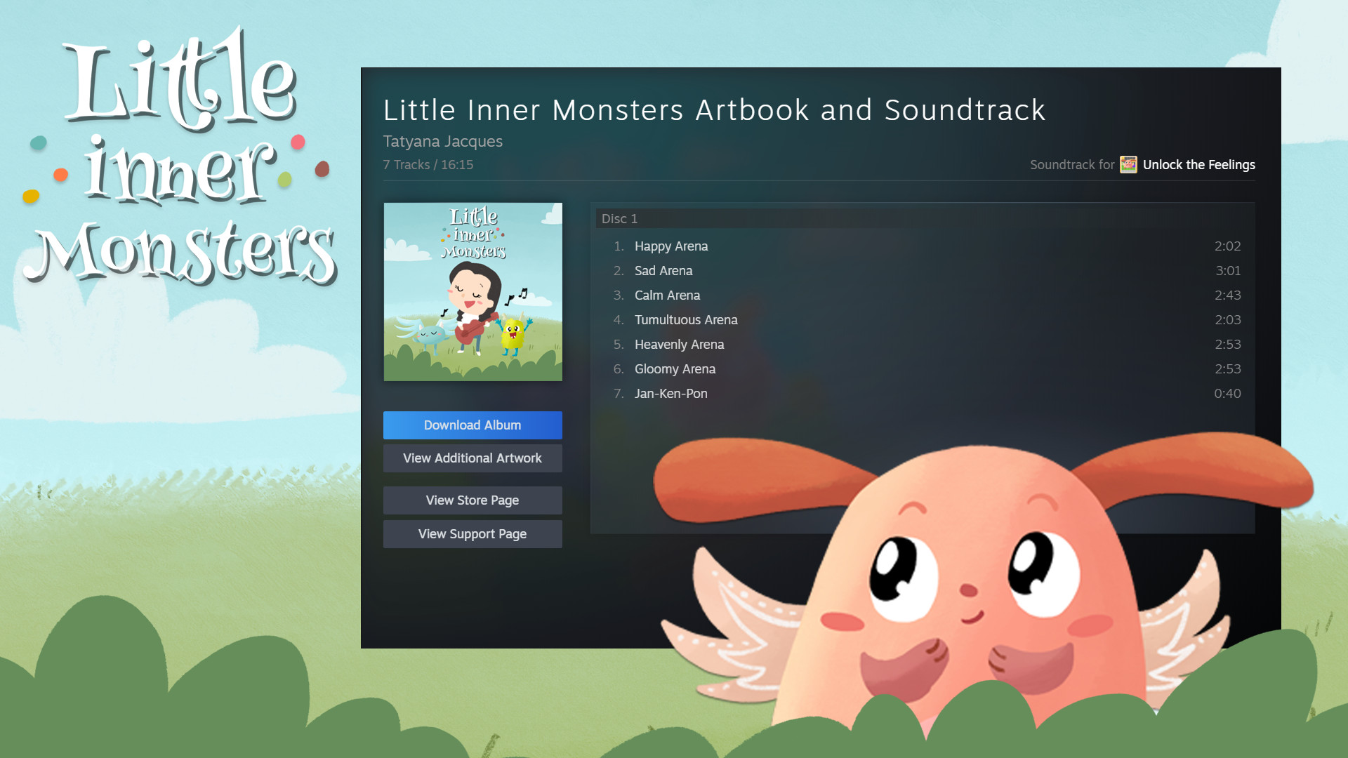 Get familiar with the Little Inner Monsters. They are the feelings we deal with on a daily basis, portrayed as cute monsters.They are present in Little Inner Monsters - the Card Game - and are also in Unlock the Feelings.This is extra content to those games, where you get:- Artbook including the inspiration for creating the monsters, and initial drafts of the art from artist Katia Numakura. In PDF format (English and Brazilian Portuguese versions).- Printable versions of the Cards for you to play a simplified physical version of the card game. In PDF format.- The soundtrack with six arrangements, fit for different moods. In MP3 format.Purchasing this will greatly support our studio to keep creating more games!Thanks in advance!To get the PDF file, after downloading the content, go to the soundtrack page on the Steam Library and click the "Browse Local Files" button. Далее