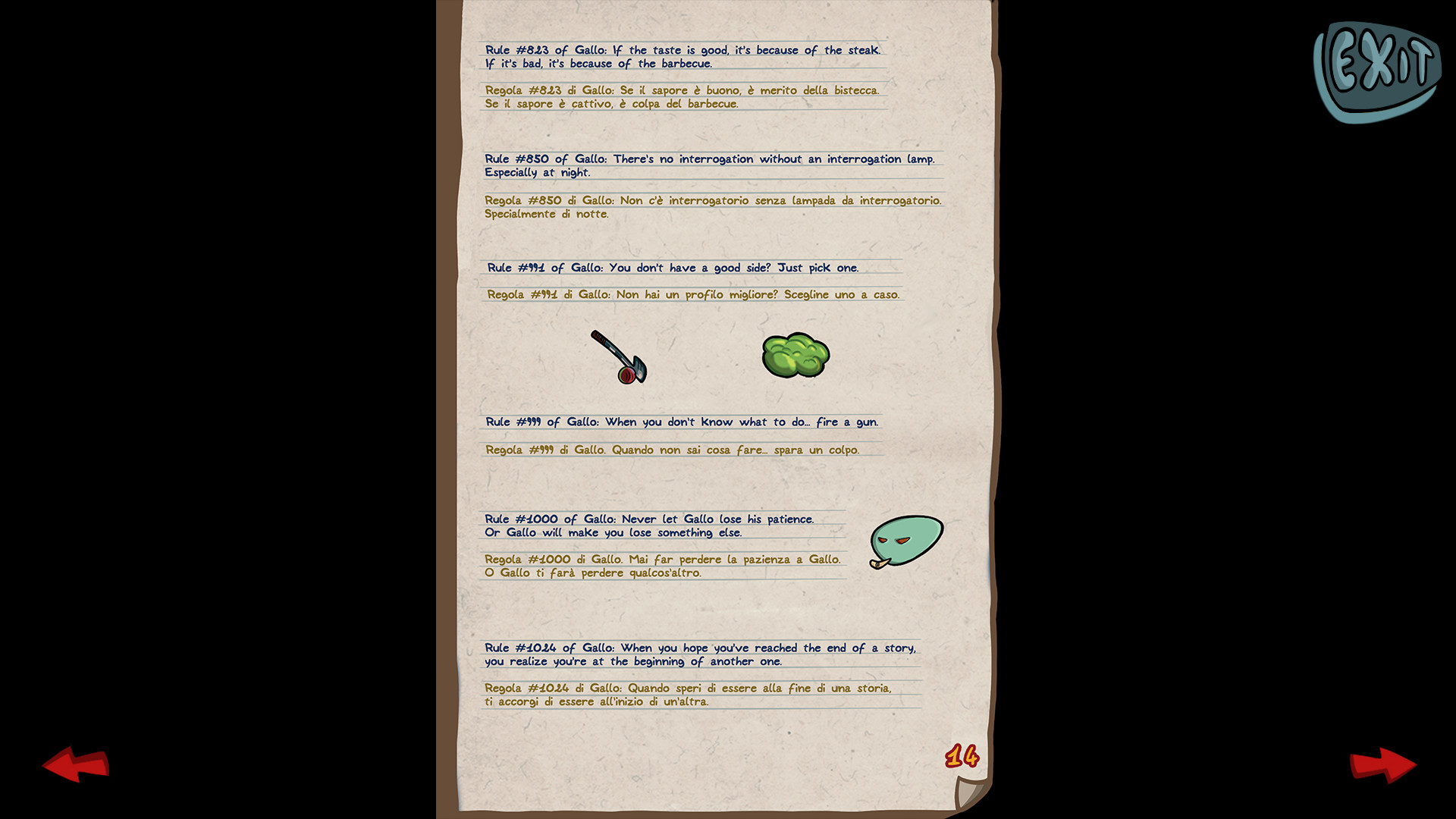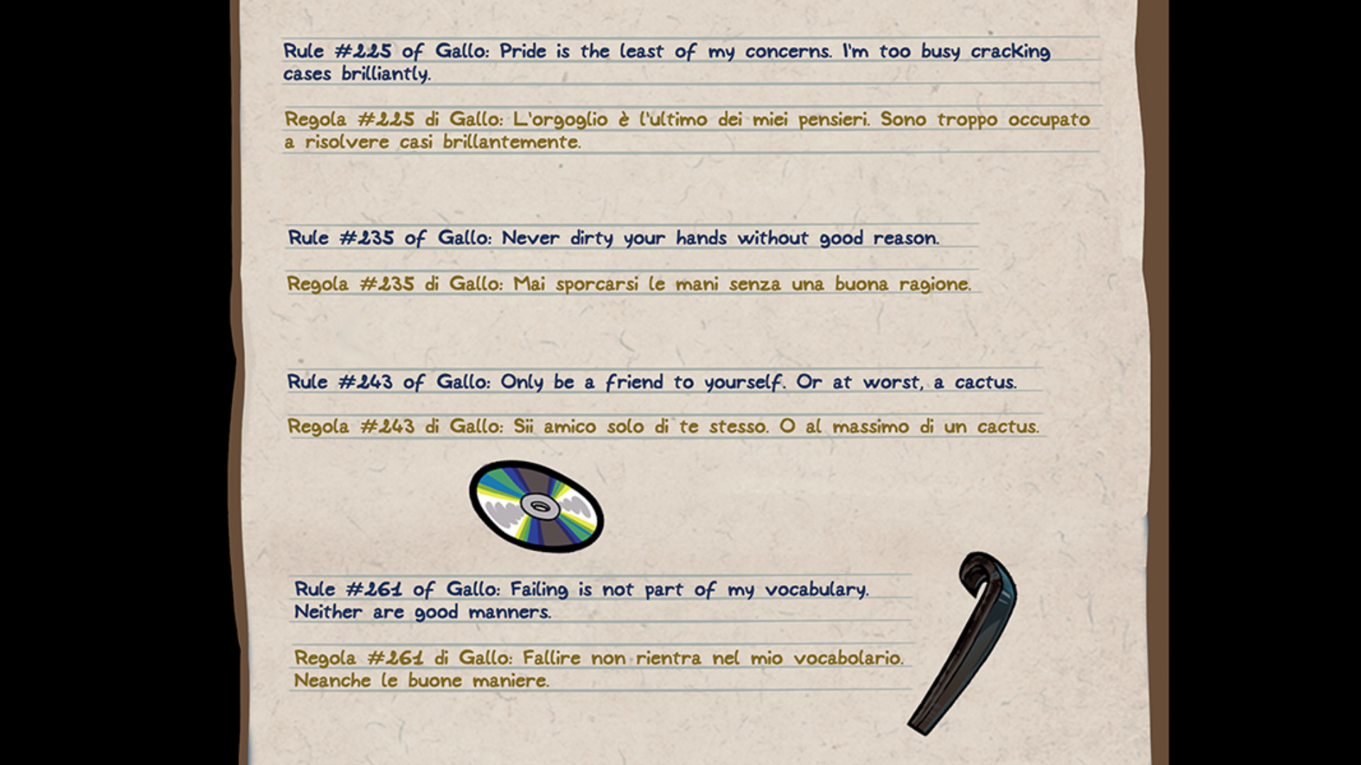 Detective Gallo is, to all appearances, a detective who plays the tough guy. But in reality he's a sociopath who undertook the career of investigator to overcome his biggest frustrations and innate repressed violence in a creative way. This is the list of self-imposed regulations that Gallo created to channel his hate for the world in a sarcastic cynicism which characterizes every moment of his life. This DLC can be found in your Steam folder in: SteamsteamappscommonDetective GalloDetective...Detective Gallo is, to all appearances, a detective who plays the tough guy. But in reality he's a sociopath who undertook the career of investigator to overcome his biggest frustrations and innate repressed violence in a creative way. This is the list of self-imposed regulations that Gallo created to channel his hate for the world in a sarcastic cynicism which characterizes every moment of his life. This DLC can be found in your Steam folder in: SteamsteamappscommonDetective GalloDetective Gallo - RulesДалее