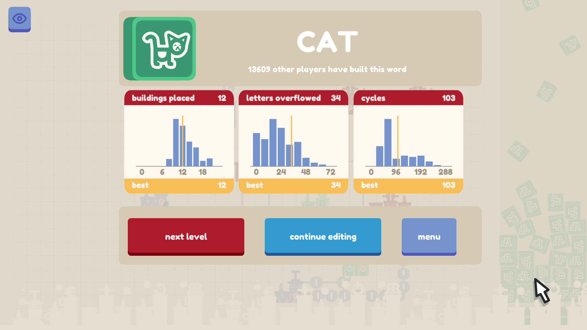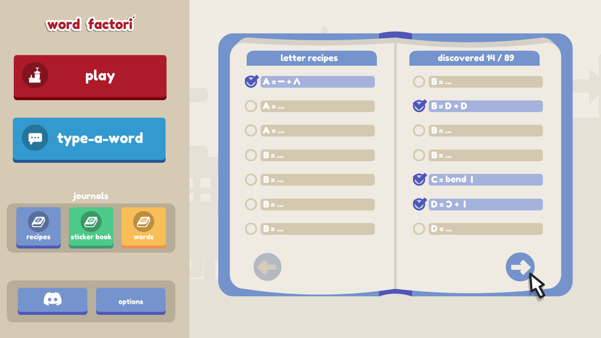 Word Factori is a word-building game where your only resource is the letter "i". Build a chain of factories to bend, rotate, reflect, and merge "i" into more complex letters. Discover secret letter recipes, unlock hidden word art, and optimize your factory chains for high scores.BUZZ. "Might be the best brain-teaser since Wordle"PC Gamer"Done with alarming proficiency" Mark Brown (GMTK)"A short factory game with a beautiful concept" AliensrockCHAIN FACTORIES. Connect factories to bend, merge, rotate, and reflect the letter "i". Bend "i" into a "C". Reflect the "C", and merge it with another "C" to make an "O". Use your intuition to build the full alphabet.COMPLETE YOUR RECIPE BOOK. Many letters have multiple recipes. Experiment with different factory chains to build letters (and more?) in new ways. Discover all of them to fill your recipe book!COLLECT STICKERS. Building certain words will unlock stickers to fill your scrapbook. Play the word of the day and try typing your own words to discover letter art, built entirely from the game's font.OPTIMIZE. Optimize your factory chains for high scores, competing on 3 metrics. Or, ignore optimization and focus on the visual aesthetic of your builds.FEATURES. Build entire words with nothing but the letter "i" and a chain of factoriesConquer unique challenge levels that restrict your resourcesPlay player-shared words, build the word of the day, or type your own wordsFill your recipe journal by discovering new ways to make each letterCollect stickers in your scrapbook by building special wordsOptimize your builds, competing on three metrics Далее