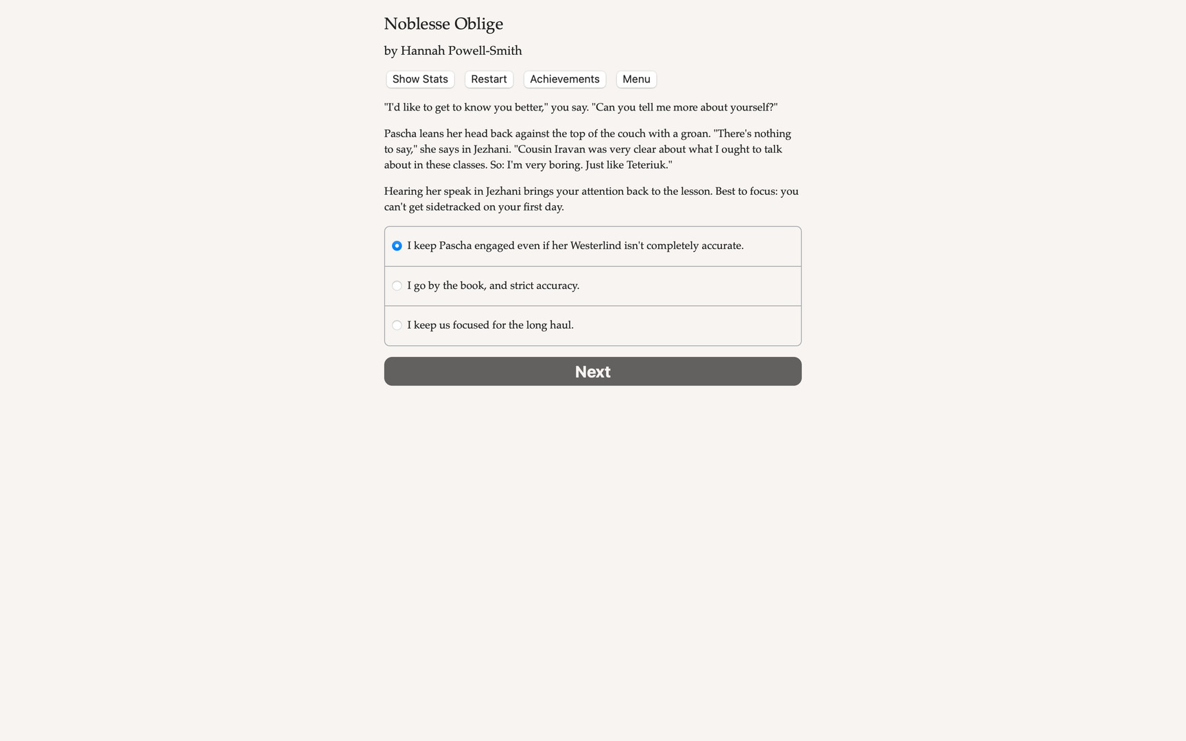Spark romance amid secrets in a crumbling mansion! What will you sacrifice for love? Can you trust your own heart?Noblesse Oblige: a Crème de la Crème Adventure is a 137,000-word interactive Gothic romance novella by Harris Powell-Smith, a standalone story in the Crème de la Crème universe. It's entirely text-based, without graphics or sound effects, and fueled by the vast, unstoppable power of your imagination.On a windswept island, far from the mild shores of Westerlin, stands the estate that is your new home. You have been hired to work as a conversation partner for a lonely aristocrat. It is a profitable opportunity, and your impoverished upbringing and middling university education leave you few others. But secrets lurk in every darkened corridor, and nothing is what it seems. Why does your young charge go wandering in the middle of the night, haunted and mourning? What is in the letters that the charming new secretary constantly writes? Why is your employer so intent on keeping outsiders from prying into the family's business?Attend grand balls, ride through fast-paced fox hunts, spend jovial evenings with the servants, teach diligent lessons to your charge, and observe - or take part in - this northern land's religious rituals. Meanwhile, there are webs of deceit for you to unravel, and deep mysteries to explore. When you reach the end, will you bring justice to those who deserve it, or keep their secrets buried forever? And, of course, there is love: midnight trysts, stolen moments, and sweet warmth amid the cold. Your job on this remote island has just begun: will you work hard for a secure future or abandon everything to follow your heart? Play as male, female, or non-binary; gay, straight, or bisexual; monogamous or polyamorous; asexual and/or aromantic. Romance the forthright, flirtatious housekeeper who works hard and plays hard; your intense, zealous conversation partner desperate for tales of the outside world; or a charming, cultured stranger offering excitement and luxury but risking danger. Connect with those outside the estate to make a future elsewhere. Secure a shining reputation in your household, or shroud yourself in suspicion. Build steadfast bonds of loyalty - or shatter them.Can you trust your own heart? Далее