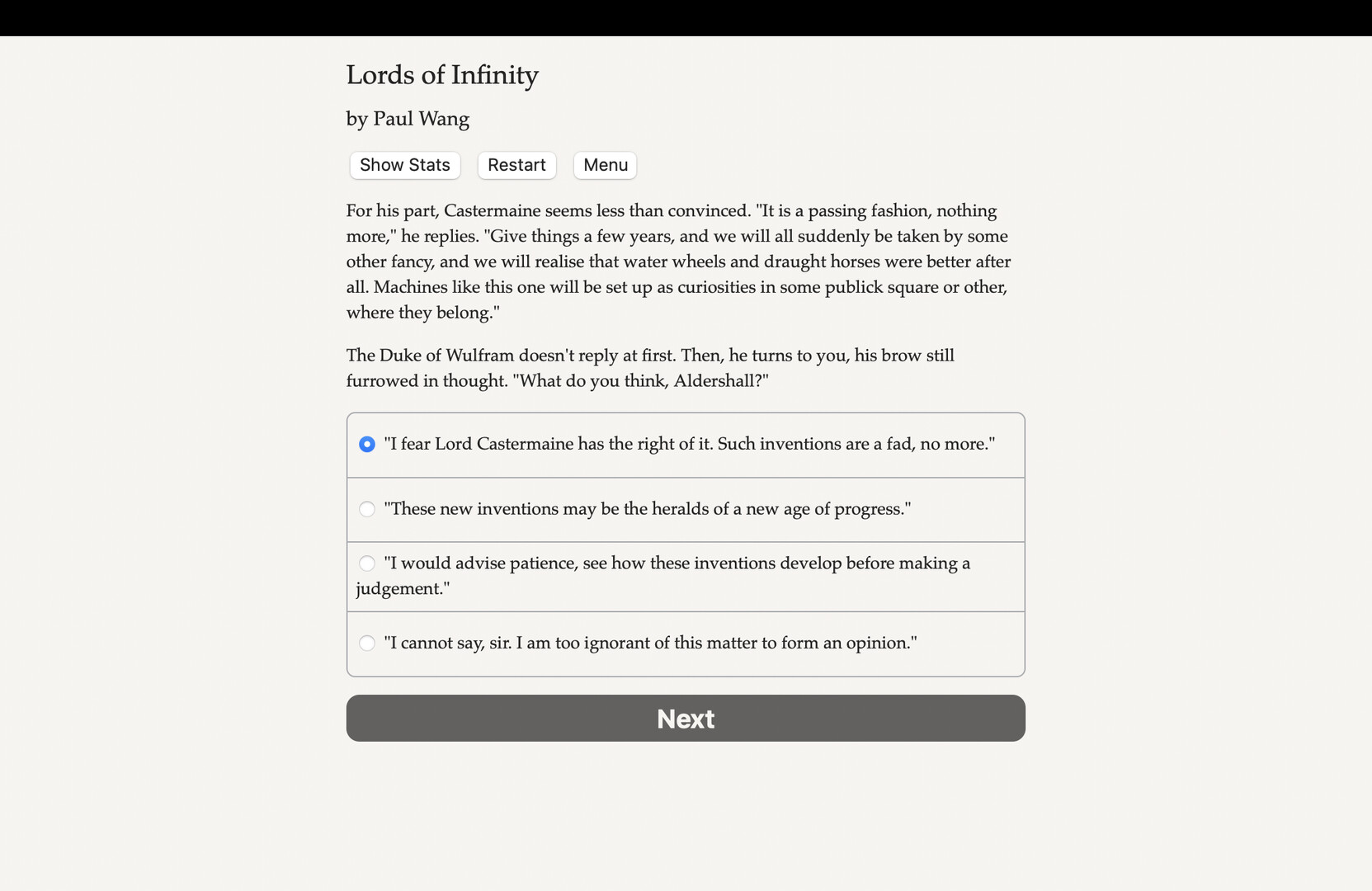 Take your place at the head of a noble house in a kingdom on the verge of ruin. Seek your fortune as a politician, industrialist, rabble-rouser, or conspirator to bring wealth and power to your family – or to save the realm from itself. The choice is yours in the long-awaited sequel to 2016's Guns of Infinity.Lords of Infinity is an immense 1.6-million-word interactive novel by Paul Wang, author of Sabres of Infinity, Guns of Infinity, Mecha Ace, and The Hero of Kendrickstone. It's entirely text-based—without graphics or sound effects—and fueled by the vast, unstoppable power of your imagination.Will you use corruption and intrigue to secure your position amongst the aristocracy, or use the power in your hands to protect those weaker than you? Will you stand for the old ways? Or blaze a trail to an uncertain future. Will you take advantage of an age of disorder to enrich yourself, or risk everything to create a better world? Will history remember you as a paragon? A hero? An opportunist? Or a traitor?Become a member of the Unified Kingdom of Tierra's political elite and navigate the intricacies of the Cortes – the Tierran Parliament.Manage your noble estate and bring peace and prosperity to your tenants – or squeeze them dry to fund your grand ambitions.Embark on sweeping plans to bring industry and commerce to your lands.Immerse yourself in the social life of the Tierran capital – a world of exclusive clubs, glittering balls, and high-stakes gambling.Balance the affections of family members, friends, lovers, and enemies.Conspire with lords, firebrands, and the agents of foreign powers.Use your wits, your charm, or your proficiency for violence to protect your interests, your fortune, and your honour.Seek romance in the most unlikely places – or look for happiness in an arranged marriage.Fight duels, hunt poachers, face bandits, and live the life of a country nobleman.Amass influence, wealth, and allies – and use them to determine the very fate of the Unified Kingdom.Will you find yourself crushed by the intrigues of the bold, the idealistic, and the desperate? Or will you take your place among them as one of the Lords of Infinity? Далее