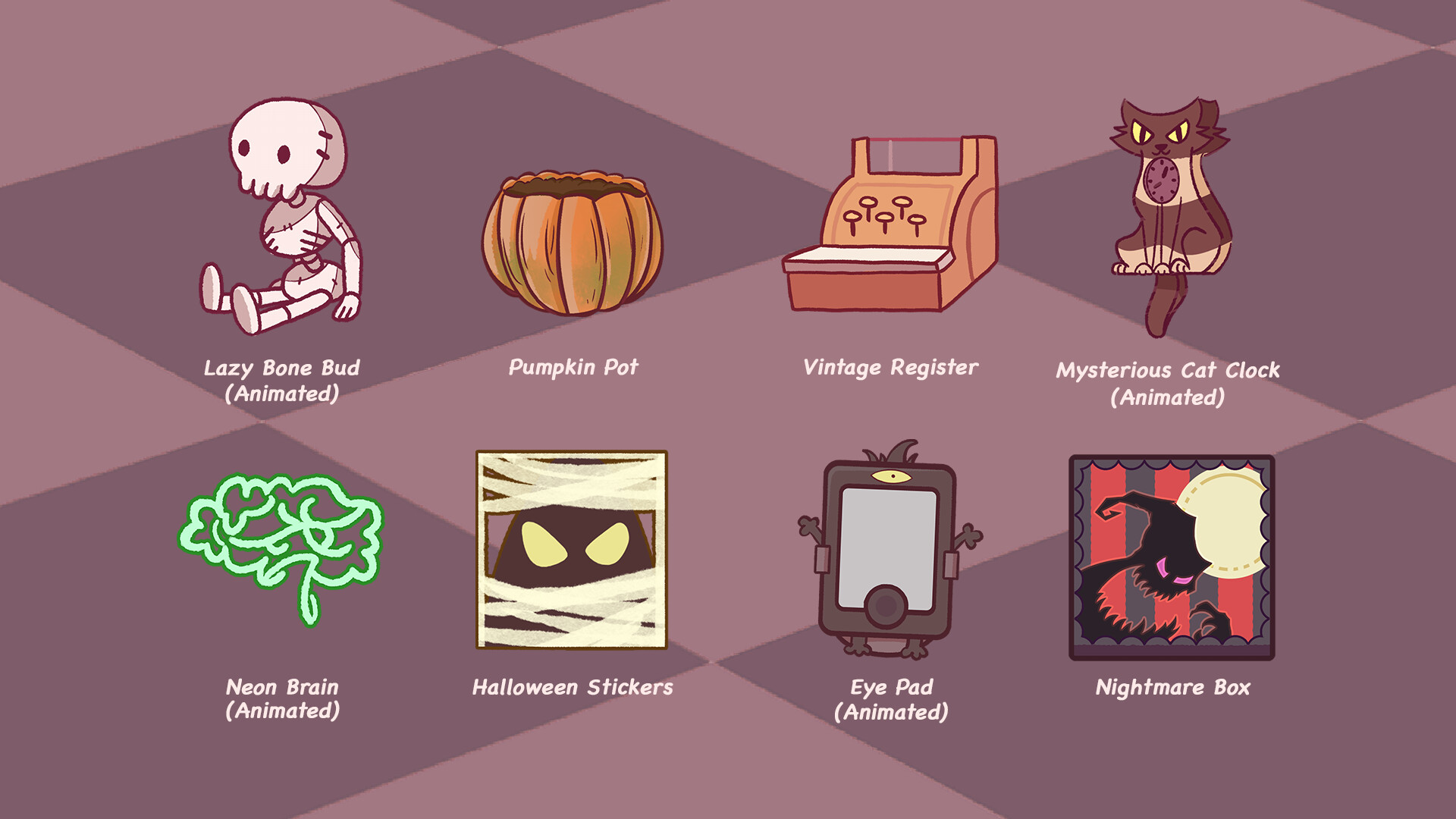 Don't want to grind? Get all Halloween 2020 decorations for a slight bargain with this DLC!Included Items:- Vintage Register- Mysterious Cat Clock (Animated)- Halloween Stickers- Pumpkin Pot- Lazy Bone Bud (Animated)- Neon Brain (Animated)- Eye Pad (Animated)- Nightmare Box**PLEASE NOTE: If you already own any item from the list, purchasing this DLC will not provide you an extra set/ duplicate nor be discounted off of the final price. You will only receive the items you have yet to obtain.
