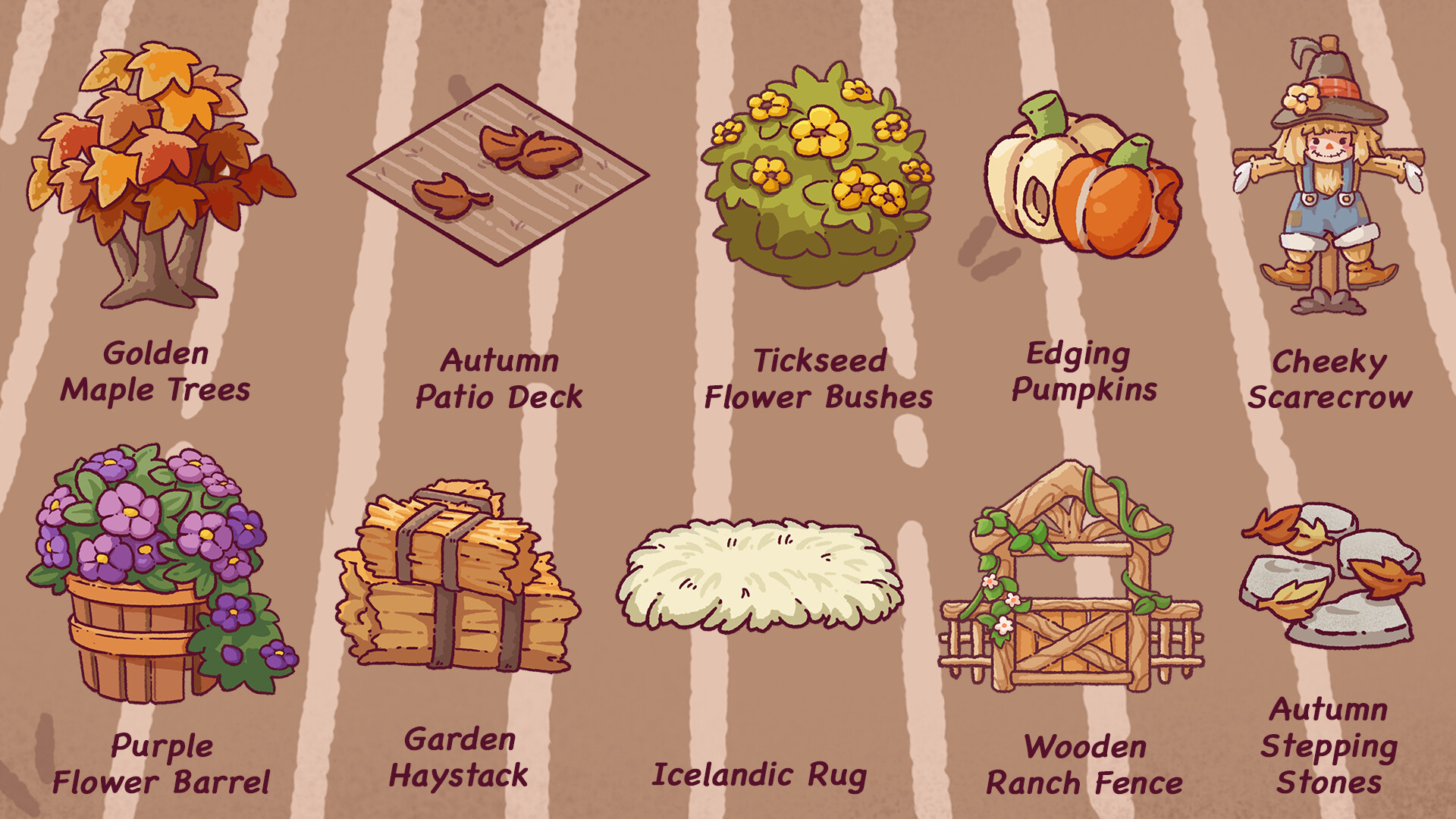 Don't want to grind? Get all Autumn 2021 Garden decorations for a slight bargain with this DLC! Included Items: - Tickseed Flower Bushes - Golden Maple Trees - Cheeky Scarecrow - Garden Haystack - Purple Flower Barrel - Edging Pumpkins - Wooden Ranch Fence - Icelandic Rug - Autumn Patio Deck - Autumn Stepping Stones **PLEASE NOTE: If you already own any item from the list, purchasing this DLC will not provide you an extra set/ duplicate nor be discounted off of the final price. You will only...Don't want to grind? Get all Autumn 2021 Garden decorations for a slight bargain with this DLC! Included Items: - Tickseed Flower Bushes - Golden Maple Trees - Cheeky Scarecrow - Garden Haystack - Purple Flower Barrel - Edging Pumpkins - Wooden Ranch Fence - Icelandic Rug - Autumn Patio Deck - Autumn Stepping Stones **PLEASE NOTE: If you already own any item from the list, purchasing this DLC will not provide you an extra set/ duplicate nor be discounted off of the final price. You will only receive the items you have yet to obtain.Далее