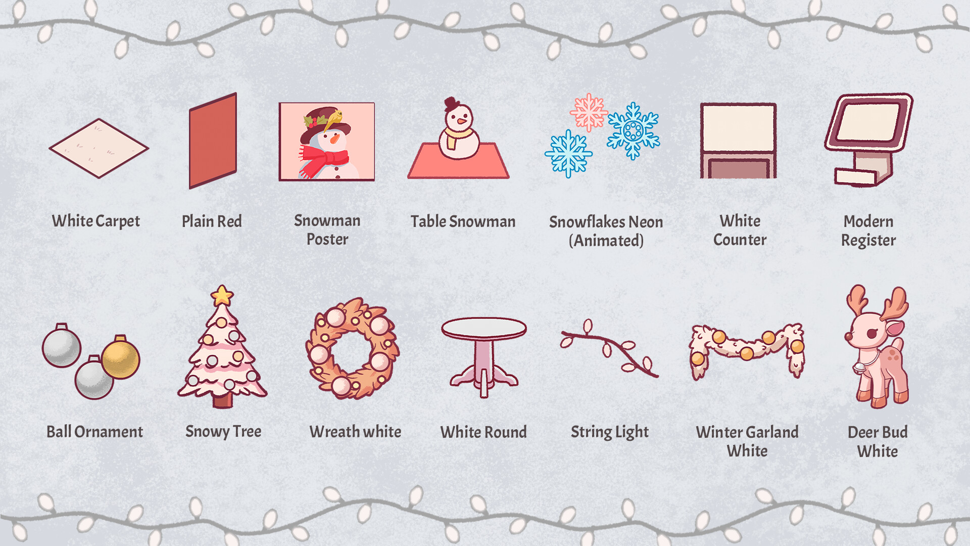Don't want to grind? Get all decorations for a slight bargain with this DLC!Included Items:White CarpetPlain RedSnowman PosterTable SnowmanSnowflakes Neon (Animated)White CounterModern RegisterBall OrnamentSnowy TreeWreath WhiteWhite RoundString LightWinter Garland WhiteDeer Bud White**PLEASE NOTE:If you already own any item from the list, purchasing this DLC will not provide you an extra set/ duplicate nor be discounted off of the final price. You will only receive the items you have yet to...Don't want to grind? Get all decorations for a slight bargain with this DLC!Included Items:White CarpetPlain RedSnowman PosterTable SnowmanSnowflakes Neon (Animated)White CounterModern RegisterBall OrnamentSnowy TreeWreath WhiteWhite RoundString LightWinter Garland WhiteDeer Bud White**PLEASE NOTE:If you already own any item from the list, purchasing this DLC will not provide you an extra set/ duplicate nor be discounted off of the final price. You will only receive the items you have yet to obtain.Далее