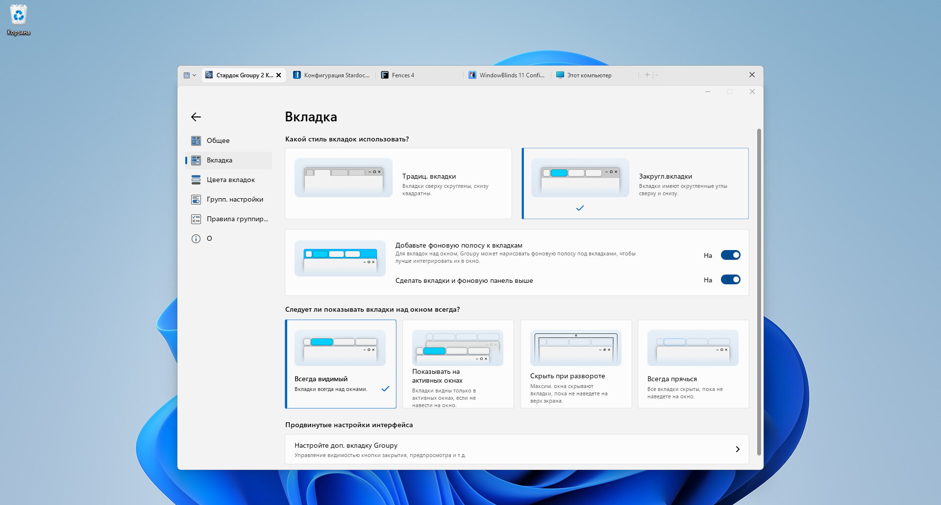 Groupy 2 предназначен для Windows 10 и Windows 11. После установки создавать группы с помощью приложения очень просто: перетащите окно в другое окно, которое объединяется в одно окно с вкладками, отображаемыми в строке заголовка. Чтобы разгруппировать приложения, перетащите вкладку за пределы группы. Новая функция группировки для Groupy 2 позволяет пользователю сохранять группу приложений вместе, закреплять их на панели задач, а затем запускать их все сразу - вместе с вкладками и готовы к работе - одним щелчком мыши. Новая функция «Акценты» упрощает процесс добавления цвета на вкладку, позволяя легко связать конкретную задачу или задание с определенным цветом.Groupy 2 для геймеров. Организуйте все свои игровые лаунчеры в одном окне. Сгруппируйте потоковые приложения по назначению, чтобы было проще взаимодействовать с сообществом. Добавьте цвета на вкладки, чтобы упростить идентификацию игровых приложений или приложений для повышения производительности. Особенности. Добавляйте вкладки практически в любое приложение - Groupy упрощает организацию открытых окон, добавляя вкладки во фрейм приложения. Автоматическая группировка - Сохраняйте автоматическую группировку всех экземпляров одного и того же приложения. Повысьте свою производительность с помощью уникальных функций - Groupy быстрее вернет вас в поток. Группировки упрощают работу с приложением - Одним щелчком мыши запустите несколько приложений с панели задач.Цветной до совершенства - Добавляя акцент на вкладки, легко упорядочивайте открытые приложения по типу, проекту или назначению. Идеально подходит для настольного компьютера - Groupy 2 разработан, чтобы органично сочетаться с вашим рабочим столом. Несколько вариантов дизайна - Благодаря нескольким различным макетам Groupy 2 позволяет настраивать работу с вкладками. Модернизировано с нуля - Groupy 2 поддерживает встроенные функции Windows 11 и оптимизирована для работы с Windows 10. Далее
