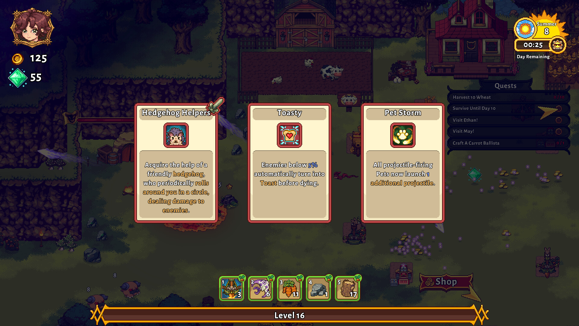 Откройте для себя новый мир, расположенный в альтернативной временной линии Sun Haven, где герой так и не появился. Без героя, который мог бы спасти положение, Дайнус, Лунный Дракон, завоевал земли, и теперь вам предстоит героически выстоять против его монстров. Выполняйте задания, чтобы получить больше власти, знакомьтесь и дружите с соседями и даже влюбляйтесь и женитесь! Займите свое место в битве против заходящего солнца.Играйте за Дария, недавно коронованного короля демонов Уизергейта, Люсию, архимага Сан-Хейвена, и Джаса, мастера-саммонера, или Артемиса, охотника за головами Амари.С помощью более 13 уникальных способностей защитите свой дом от полчищ причудливых, но опасных монстров, используя оружие и заклинания, такие как:Мечи, луки и пусковые установки для снежковОгненные шары, магические ауры и молнииВонючие яичные пушки, пронзительные морковные баллисты и молочные пулеметыЩенки, драконы и даже красивые лучники-ящерицыУлучшайте свое оружие, навыки, питомцев и способности, получая карты навыков, которые разыгрываются каждый раз, когда вы повышаете уровень.После каждого поражения обязательно используйте стойку для оружия и наковальню, чтобы разблокировать и постоянно улучшать характеристики и способности всех 4 персонажей! Растите в силе, создайте свое идеальное телосложение и отправьте монстров в атаку!Используйте свои ограниченные дневные часы с умом, чтобы заниматься ремеслом, собирать ресурсы и посещать магазин - иначе вас могут заполонить монстры. В течение дня вы будете сталкиваться с постоянными волнами врагов, а после захода солнца борьба становится еще более ожесточенной!Собирайте ресурсы для создания более 35 ремесленных предметов.Выращивая и продавая урожай, руду и продукты животноводства, вы можете заработать золото для покупки заклинаний, оружия и улучшений способностей! Улучшения, приобретенные за деньги, накапливаются бесконечно!Сможете ли вы победить Дайнуса и его полчища монстров, пока не стало слишком поздно? Далее