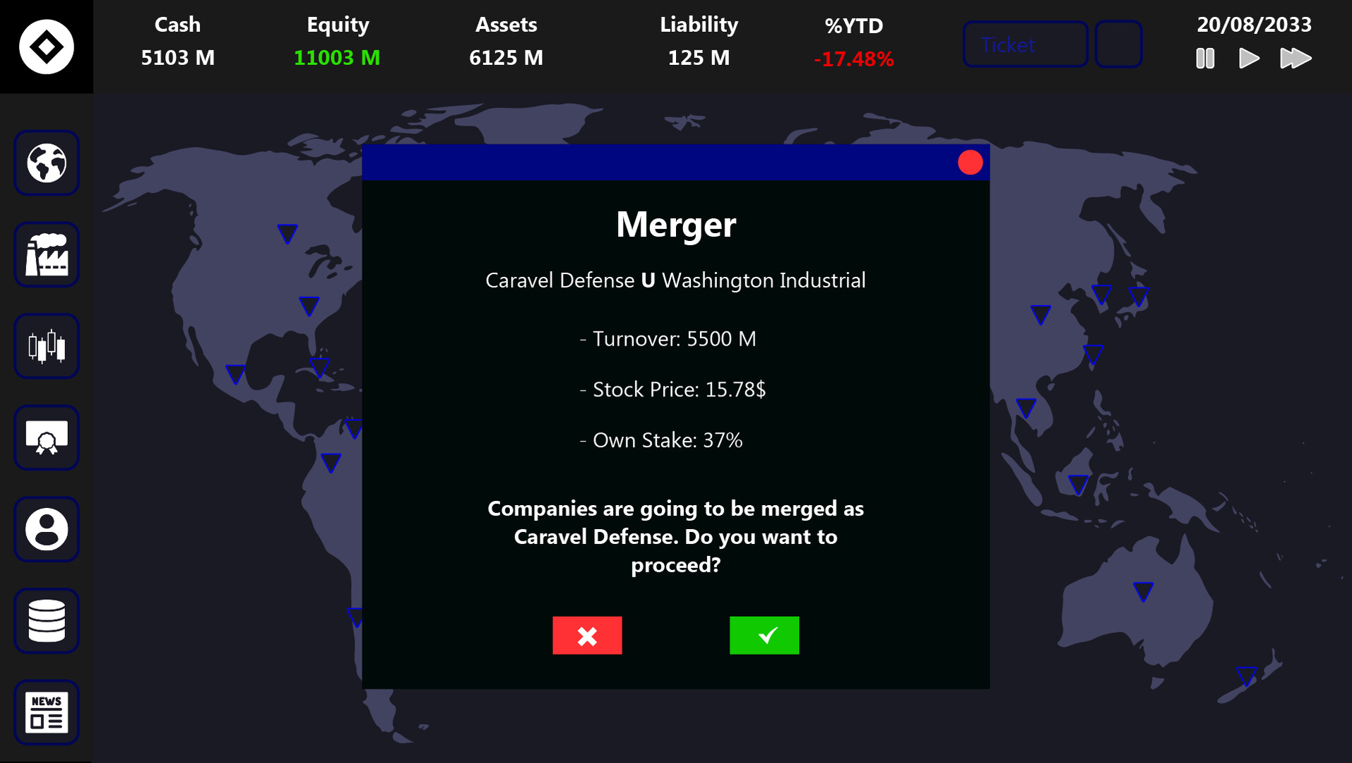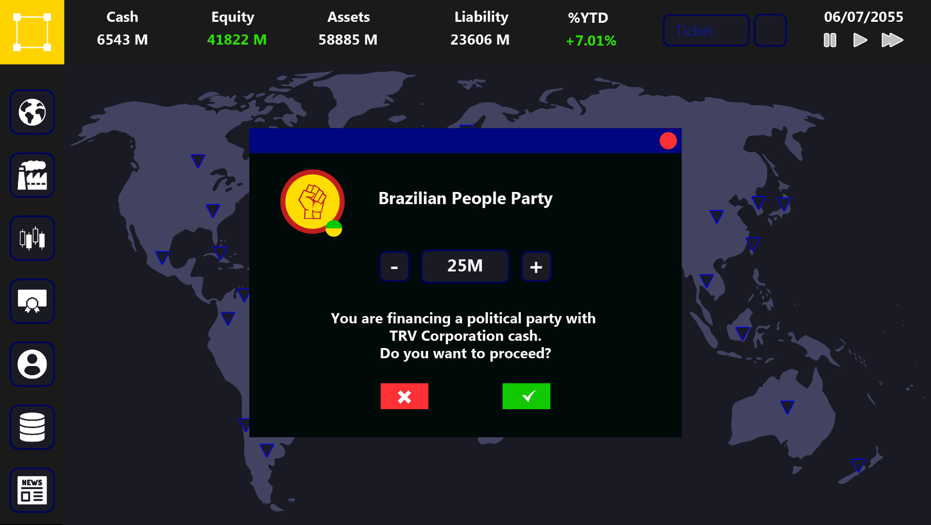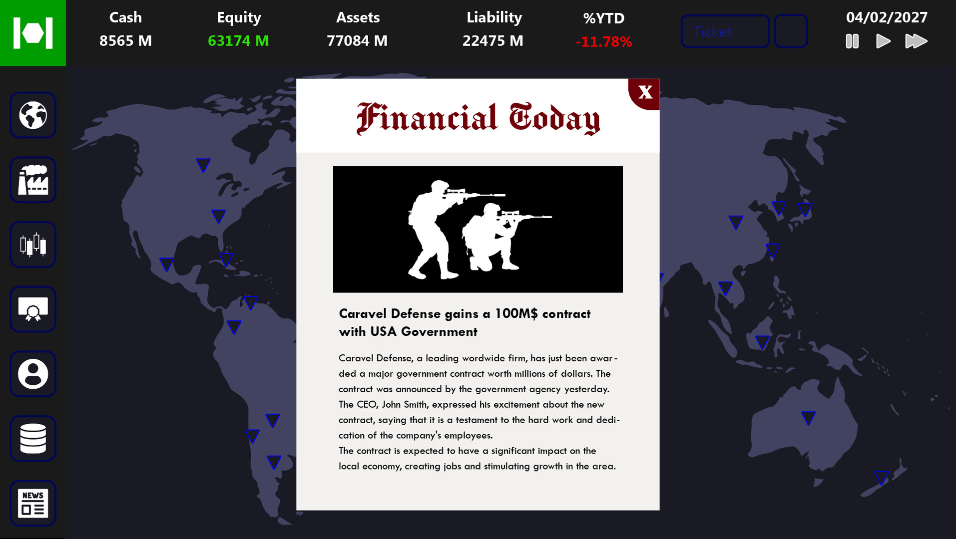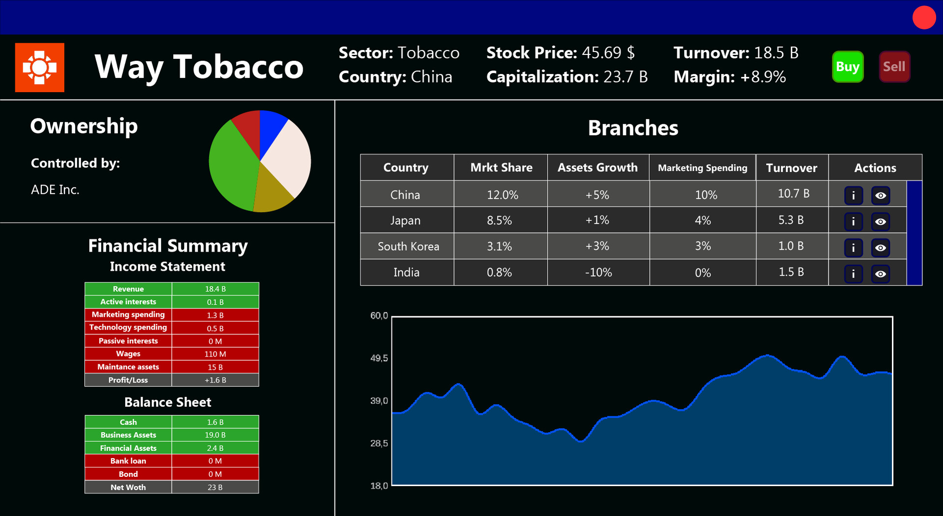Step into the cutthroat world of high finance with this tycoon-simulation game. The goal is to become the richest hedge fund in the world. In a market where the stakes are high and the competition is fierce, you'll need to be strategic, aggressive, and willing to take risks to come out on top.Buy and Sell. You'll have access to a wide range of financial tools to help you make the most of every opportunity. From stocks and bonds to derivatives and options, you'll have the tools you need to make smart investments and maximize your returns.Manage multi-billion Corporations. But simply having access to the right tools isn't enough. In order to succeed in this game, you'll need to be willing to manage billion-dollar corporations, take calculated risks, and be aggressive in your pursuit of wealth. As you build your empire, you'll need to manage your assets and make strategic decisions to ensure your continued success. You'll have to keep an eye on the markets, track your profits and losses, and adjust your strategy as necessary.Whether you're looking to dominate a particular market or diversify your portfolio, you'll need to be constantly on the lookout for new opportunities and be ready to act when they arise.Use power and corruption. And when the going gets tough, you'll need to be willing to use your power and influence to bend the rules in your favor. Whether you're engaging in insider trading, manipulating the market, or using your connections to gain an edge, you'll need to be bold and unafraid to push the boundaries of what's legal if you want to make it to the top.Be ruthless. But be careful, your opponents will also be doing everything they can to outsmart you. So you'll need to stay one step ahead, be always informed, and make the right decisions at the right time. As you amass wealth and influence, you will be able to engage in corrupt deals and backroom negotiations to gain an unfair advantage over your rivals. But be careful, as these actions will also come with consequences.With realistic market simulations, engaging gameplay, and endless opportunities for wealth and power, this game will keep you hooked for hours on end. The competition is fierce, but with the right strategy and a bit of luck, you can become the wealthiest hedge fund manager in the world. Далее