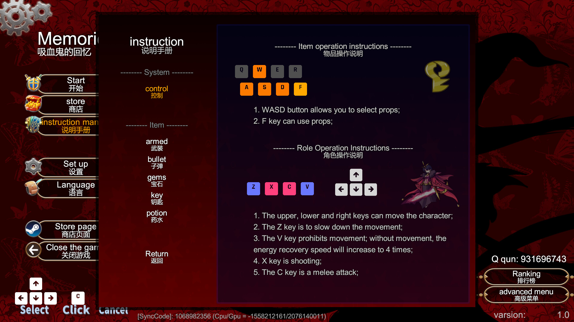 --------------------------------------введение в игру--------------------------------------. Это вы также можете просто начать, технические требования не высокие стрельба (SHMUP / STG);Все пули уничтожают друг друга, то есть, пока вы нажимаете клавишу стрельбы, вам почти не придется беспокоиться о том, что вы будете убиты противником;Благодаря этому механизму вы испытаете опыт летающей стрельбы, которого вы до сих пор не испытывали;Это игра с практически недраматическим шоу, исключительно для того, чтобы испытать освежающий процесс стрельбы;Игра имеет простую и легкую эксплуатацию, игра поддерживает ручки;В игре внедрена функция Steam Workshop, которая позволяет игрокам свободно разрабатывать моды;Q群: 931696743В пробной версии можно играть всего 10 минут;--------------------------------------игровые операции--------------------------------------. в: как управлять меню?о: вверх и вниз клавиши направления влево и вправо, чтобы выбратьо: введите ключ для подтвержденияв: как движется персонаж?о: вверх и вниз левая и правая клавиши для перемещенияв: как вы управляете навыками и атаками?A: W, A, S, D, F, Z, X, C, V клавиатуры для управления;A: эти девять клавиш расположены в левом нижнем углу клавиатуры, хорошо распознаваемы;в: есть ли какие-либо слова о том, что ключ имеет определенное использование?Кнопки A: Z предназначены для замедления движения персонажа;A: X ключи, предназначенные для базовых атак на персонажейA: C кнопка, предназначенная для атак Ближнего боя персонажамиКнопка A: V, временно не обрабатывается;Кнопка A: W, предназначенная для выбора вверх панели элементов персонажа;A: Кнопка A, предназначенная для выбора влево в панели элементов персонажа;Кнопки A: S, предназначенные для выбора вниз в строке элементов персонажа;Кнопки A: D, предназначенные для выбора вправо панели элементов персонажа;Кнопки A: F, предназначенные для использования панели предметов персонажа;--------------------------------------Игровые схемы & описание сложности & указание маршрута--------------------------------------. Общая сложность игры сравнительно проста по сравнению с другими Shmup / STG-играми;45 волн - это сложность, которую каждый может увлечься игрой;65 волн - это сложность, предназначенная для всех;85 волны очень сложно проходить таможенную очистку;105 волн - это почти невозможное решение сложности вызова, оставленное для игроков, которые любят вызовы;45 волн:сложность для новичков; 10 минут для таможенного оформления;65 волн:Начиная с 10-й волны босса, если не победить босса в течение 10 секунд, появятся особые враги, после победы можно открыть 65 волн сложности;За 15 минут можно пройти таможенную очистку;85 волн:Начиная с 50-й волны босса, если не победить босса в течение 10 секунд, появятся особые враги, после победы можно открыть 85 волн сложности;- пропуск через 20 минут;105 волн:Необходимо удовлетворить условия использования желтой, синей и красной флейты, после 70 волн использование красной флейты, можно открыть 105 волн; 30 - 40 минут можно пройти таможенную очистку;Желтая флейта:после пятой волны использовать еще одну желтую флейту, чтобы попасть в первый слой леса; после десятой волны использовать еще одну желтую флейту, чтобы получить синюю флейту;Синяя флейта:Используя синюю флейту, можно попасть во второй слой леса; если после 50-й волны использовать синюю флейту, можно получить красную флейту;Красная флейта:Используя красную флейту, вы можете попасть в лес на третьем уровне; если использ