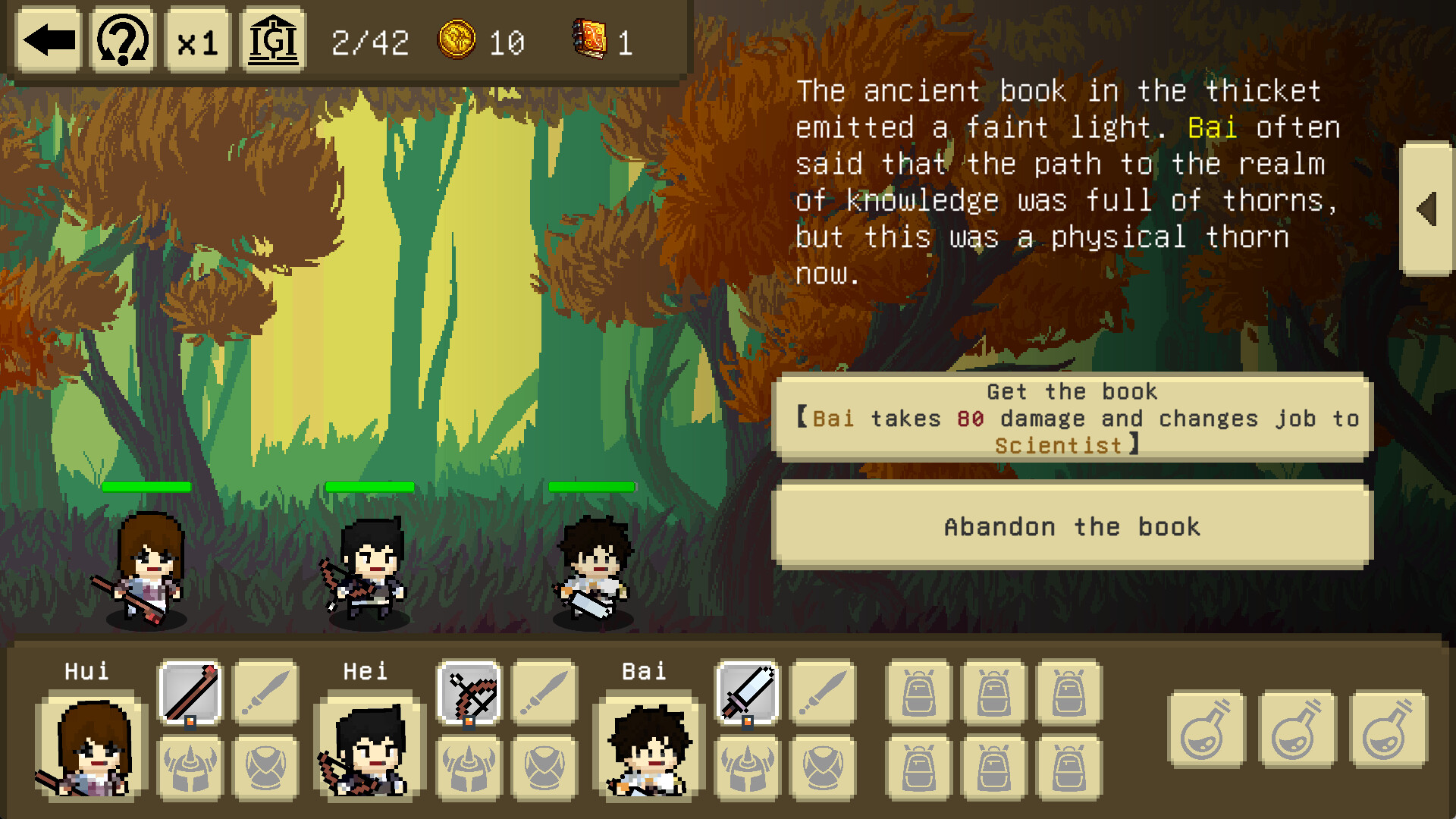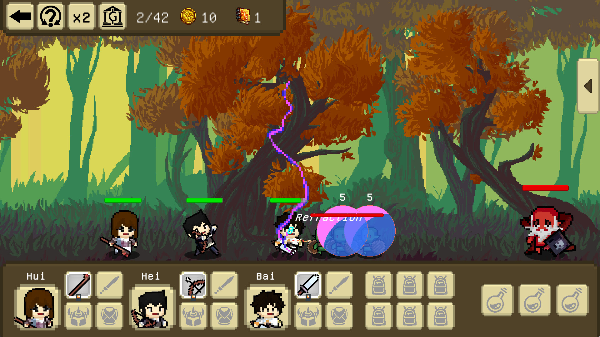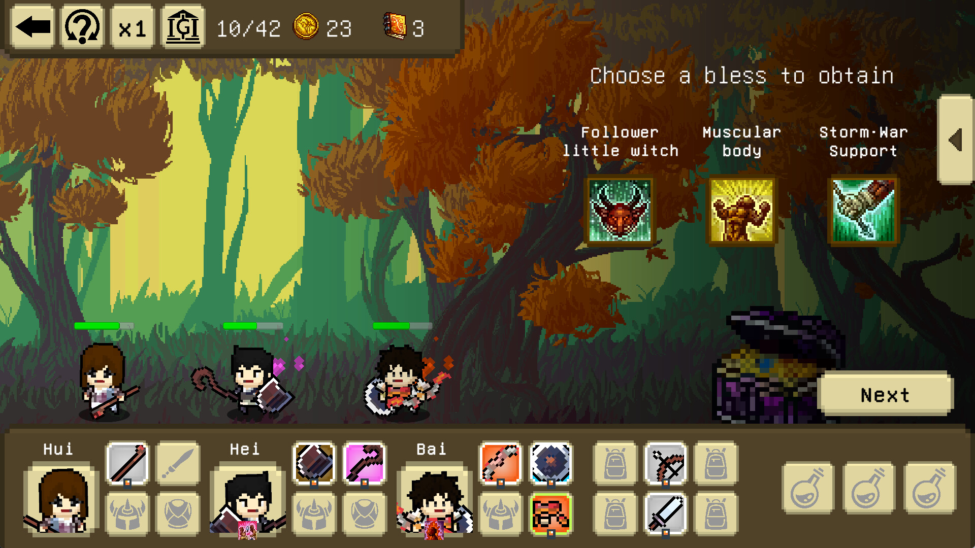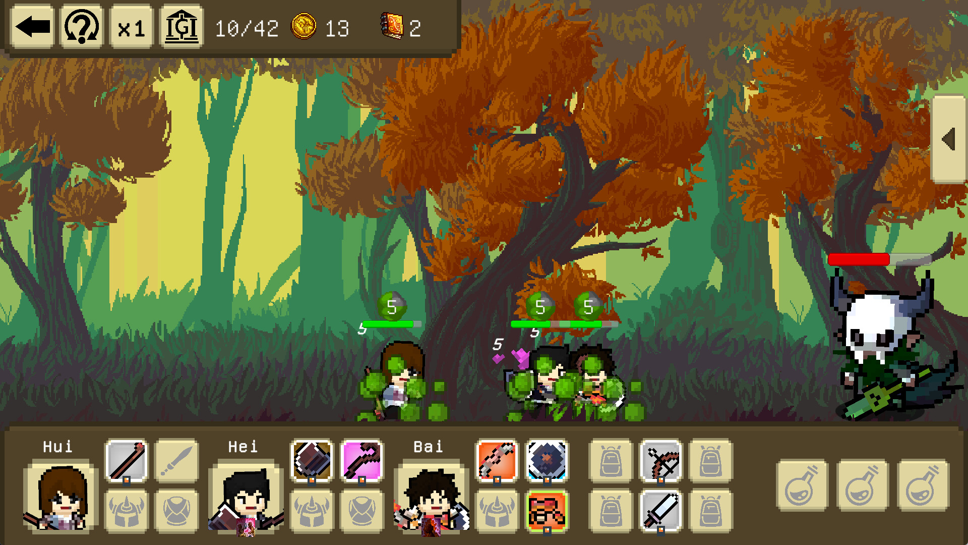In the mysterious jungle, there are many secrets hidden..It seems that the monsters are whispering..But the brave three warriors will definitely guard this forest!Now, towards that forest, let's go, BATTLE!Any monster will eventually be brought to justice!Form your own three-person team to fight against the enemies in the forest!Collect equipment, use the bonds of the equipment, and make the warriors gain powerful bond skills!Choose your adventure route on the map and define your own direction of progress!Use the powerful blessings encountered along the way to guide yourself to form bonds and overcome difficulties!The forest contaminated by evil will occasionally give you some negative effects, so be careful!Don't be complacent after passing through the forest once, there are 20 difficulties waiting for you! Далее