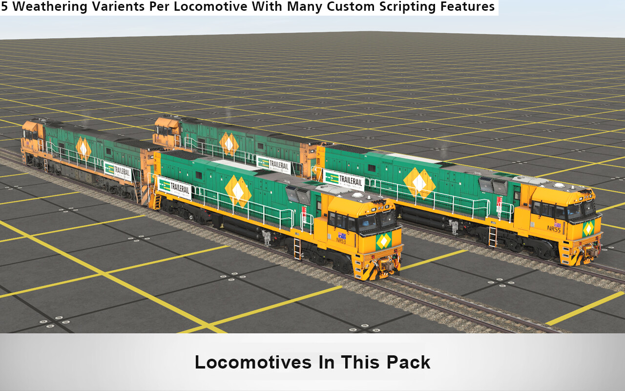 In September 1995, National Rail awarded a contract to A Goninan & Co for 80 locomotives, which later became 120. NR1–NR60 were built at Broadmeadow, and NR61–NR120 were constructed at Bassendean. The frames were built at Hexham and the bogies at Goninan's Lansdowne Engineering subsidiary in Taree. The first locomotive to be completed was NR61, which was trialled on 18 September 1996. The first Broadmeadow-built unit ran on 23 September 1996. The early units were delivered without National...In September 1995, National Rail awarded a contract to A Goninan & Co for 80 locomotives, which later became 120. NR1–NR60 were built at Broadmeadow, and NR61–NR120 were constructed at Bassendean. The frames were built at Hexham and the bogies at Goninan's Lansdowne Engineering subsidiary in Taree. The first locomotive to be completed was NR61, which was trialled on 18 September 1996. The first Broadmeadow-built unit ran on 23 September 1996. The early units were delivered without National Rail branding or logos, but later put into the full livery. Testing was carried out on the NSW Main Northern line between Werris Creek and Maitland, using ballast wagons and 442 class locomotives. Each locomotive was required to accumulate 10,000 kilometres of trouble-free running before being accepted. The final unit was delivered from Broadmeadow in February 1998. Pacific National announced in September 2022 that the company had committed more than $160M AUD towards the overhauling of the company's NR class units. In 1996 NR3 was involved in a fatal rail accident and was later re-numbered NR121, NR121 re-entered service in 2000. In 2019 NR80 was involved in a fatal rail accident and was later re-numbered NR122, NR122 re-entered service in 2021. These Locomotives Feature: -Full PBR Texturing -Highly Detailed Custom Cab -Animated Doors -Animated Windows -Number Board and External Light Toggles -Custom Scripting -Emissive Lighting -Custom Dynamic Brake Sounds -Custom Locomotive Brake Sounds -Custom Traction Motor Sounds -Blinds Lowered/Raised Toggle -Coupler Flag On/Off Toggle Credits: Credit to S301, Scratchy, H222, lesley & itzmejane for beta testing these locomotives and providing feedback Credit to S301 and GDennish for providing the locomotive with advanced scripting and features. Credit to Graham Baker and Aaron Hobson for providing locomotive reference photos, locomotive information and helpful resources Credit to Azervich for providing realistic locomotive engine physics Credit to all others who helped during production of this locomotive. Pack includes the following locomotives: kuid:804089:109691 NRC NR TR 97+ kuid:804089:109727 NRC NR TR 99+ Далее