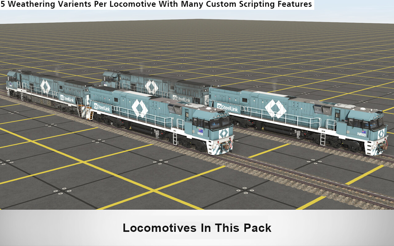 In September 1995, National Rail awarded a contract to A Goninan & Co for 80 locomotives, which later became 120. NR1–NR60 were built at Broadmeadow, and NR61–NR120 were constructed at Bassendean. The frames were built at Hexham and the bogies at Goninan's Lansdowne Engineering subsidiary in Taree. The first locomotive to be completed was NR61, which was trialled on 18 September 1996. The first Broadmeadow-built unit ran on 23 September 1996. The early units were delivered without National...In September 1995, National Rail awarded a contract to A Goninan & Co for 80 locomotives, which later became 120. NR1–NR60 were built at Broadmeadow, and NR61–NR120 were constructed at Bassendean. The frames were built at Hexham and the bogies at Goninan's Lansdowne Engineering subsidiary in Taree. The first locomotive to be completed was NR61, which was trialled on 18 September 1996. The first Broadmeadow-built unit ran on 23 September 1996. The early units were delivered without National Rail branding or logos, but later put into the full livery. Testing was carried out on the NSW Main Northern line between Werris Creek and Maitland, using ballast wagons and 442 class locomotives. Each locomotive was required to accumulate 10,000 kilometres of trouble-free running before being accepted. The final unit was delivered from Broadmeadow in February 1998. Pacific National announced in September 2022 that the company had committed more than $160M AUD towards the overhauling of the company's NR class units. In 1996 NR3 was involved in a fatal rail accident and was later re-numbered NR121, NR121 re-entered service in 2000. In 2019 NR80 was involved in a fatal rail accident and was later re-numbered NR122, NR122 re-entered service in 2021. These Locomotives Feature: -Full PBR Texturing -Highly Detailed Custom Cab -Animated Doors -Animated Windows -Number Board and External Light Toggles -Custom Scripting -Emissive Lighting -Custom Dynamic Brake Sounds -Custom Locomotive Brake Sounds -Custom Traction Motor Sounds -Blinds Lowered/Raised Toggle -Coupler Flag On/Off Toggle Credits: Credit to S301, Scratchy, H222, lesley & itzmejane for beta testing these locomotives and providing feedback Credit to S301 and GDennish for providing the locomotive with advanced scripting and features. Credit to Graham Baker and Aaron Hobson for providing locomotive reference photos, locomotive information and helpful resources Credit to Azervich for providing realistic locomotive engine physics Credit to all others who helped during production of this locomotive. Pack includes the following locomotives: kuid:804089:109722 NRC NR SL 97+ kuid:804089:109726 NRC NR SL 99+ Далее