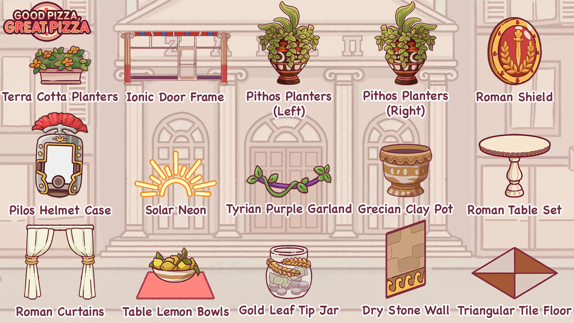 Не хотите заморачиваться? Получите все украшения по небольшой цене с этим дополнением!Включенные предметы: Терракотовые Кашпо Одиночная Дверная Рама Керамический Пифос (Слева) Керамический Пифос (Справа) Римский Щит Чехол Шлем Пилос Солнечная Вывеска Тирская Пурпурная Гирлянда Греческий Глиняный Горшок Римский Столовый Набор Римские Занавески Настольные Тарелки с Лимоном Баночка с Сусальным Золотом Высохшая Каменная Стена Треугольный Плиточный Пол**ВНИМАНИЕ:Если у вас уже есть какой-либо предмет из списка, покупка этого дополнения не предоставит вам дополнительный набор/дубликат или скидки от окончательной стоимости. Вы получите только те предметы, которых у вас нет. Далее