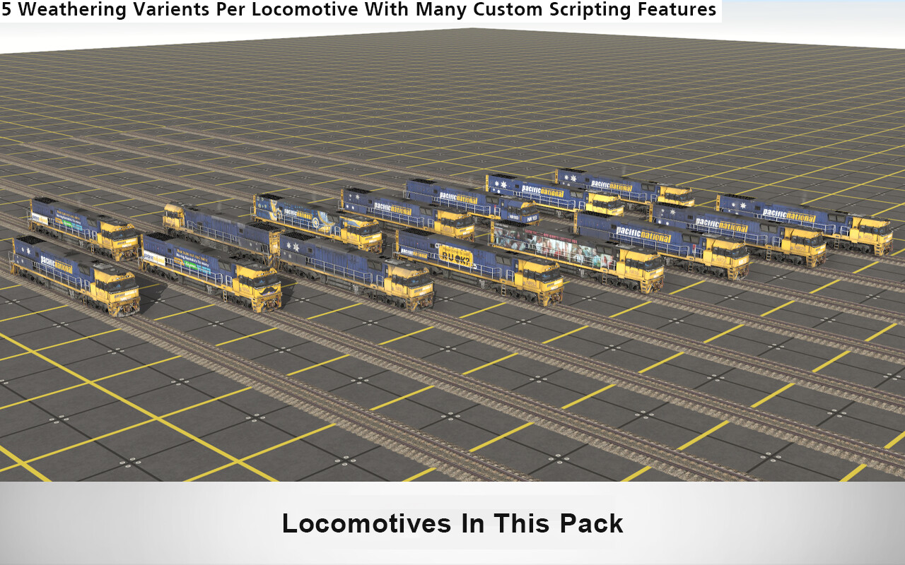 In September 1995, National Rail awarded a contract to A Goninan & Co for 80 locomotives, which later became 120. NR1–NR60 were built at Broadmeadow, and NR61–NR120 were constructed at Bassendean. The frames were built at Hexham and the bogies at Goninan's Lansdowne Engineering subsidiary in Taree. The first locomotive to be completed was NR61, which was trialled on 18 September 1996. The first Broadmeadow-built unit ran on 23 September 1996. The early units were delivered without National Rail branding or logos, but later put into the full livery. Testing was carried out on the NSW Main Northern line between Werris Creek and Maitland, using ballast wagons and 442 class locomotives. Each locomotive was required to accumulate 10,000 kilometres of trouble-free running before being accepted. The final unit was delivered from Broadmeadow in February 1998. Pacific National announced in September 2022 that the company had committed more than $160M AUD towards the overhauling of the company's NR class units. In 1996 NR3 was involved in a fatal rail accident and was later re-numbered NR121, NR121 re-entered service in 2000. In 2019 NR80 was involved in a fatal rail accident and was later re-numbered NR122, NR122 re-entered service in 2021. These Locomotives Feature: -Full PBR Texturing -Highly Detailed Custom Cab -Animated Doors -Animated Windows -Number Board and External Light Toggles -Custom Scripting -Emissive Lighting -Custom Dynamic Brake Sounds -Custom Locomotive Brake Sounds -Custom Traction Motor Sounds -Blinds Lowered/Raised Toggle -Coupler Flag On/Off Toggle Credits: Credit to S301, Scratchy, H222, lesley & itzmejane for beta testing these locomotives and providing feedback Credit to S301 and GDennish for providing the locomotive with advanced scripting and features. Credit to Graham Baker and Aaron Hobson for providing locomotive reference photos, locomotive information and helpful resources Credit to Azervich for providing realistic locomotive engine physics Credit to all others who helped during production of this locomotive. Pack includes the following locomotives: Далее