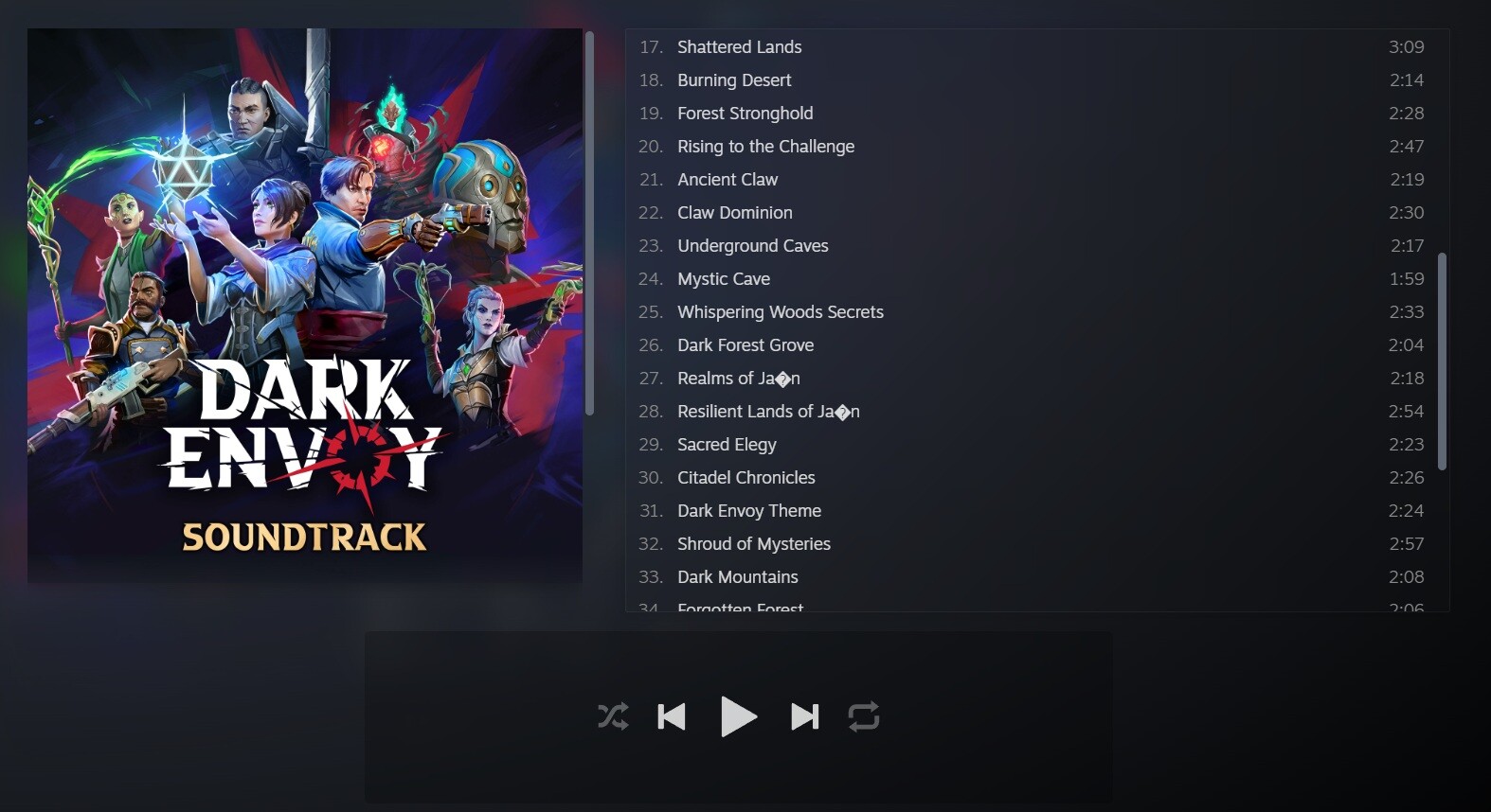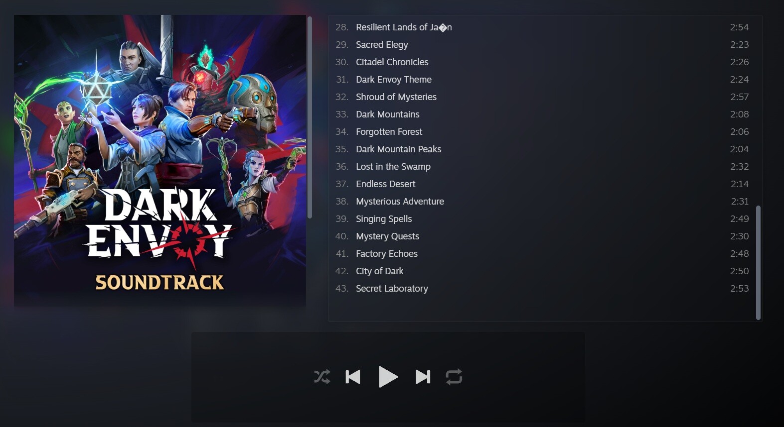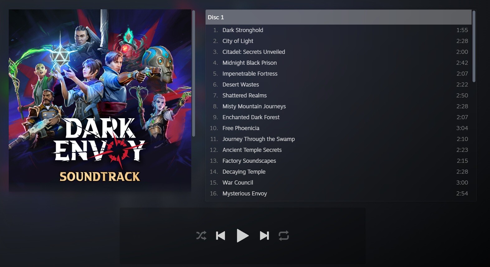 Original Game Soundtrack for Dark Envoy by Dawid Majewski.43 tracks and more than 90 minutes of music composed and produced for Dark Envoy, which is mostly a combination of orchestral sounds and electronic music, spiced with original ethnic instruments from around the world.Asian and African bamboo flutes, Indian Sarangi, Mongolian Morin Chuur, Chinese Banhu, Armenian Duduk, medieval Hurdy Gurdy and many more - all these instruments were recorded live in the studio to create an even more realistic experience.The principle ‘less is more' is our motto here. The aesthetic is mostly minimalist. We decided to go with a spacious, ambient approach when it comes to creating musical landscapes. However, you will also hear punchier, sometimes even disturbing sounds that we used to create a matching atmosphere for combat scenes.If you listen carefully, you can find inspiration from such composers as Sarah Schachner, Lorne Balfe, Jesper Kyd or Greg Dombowski. Далее