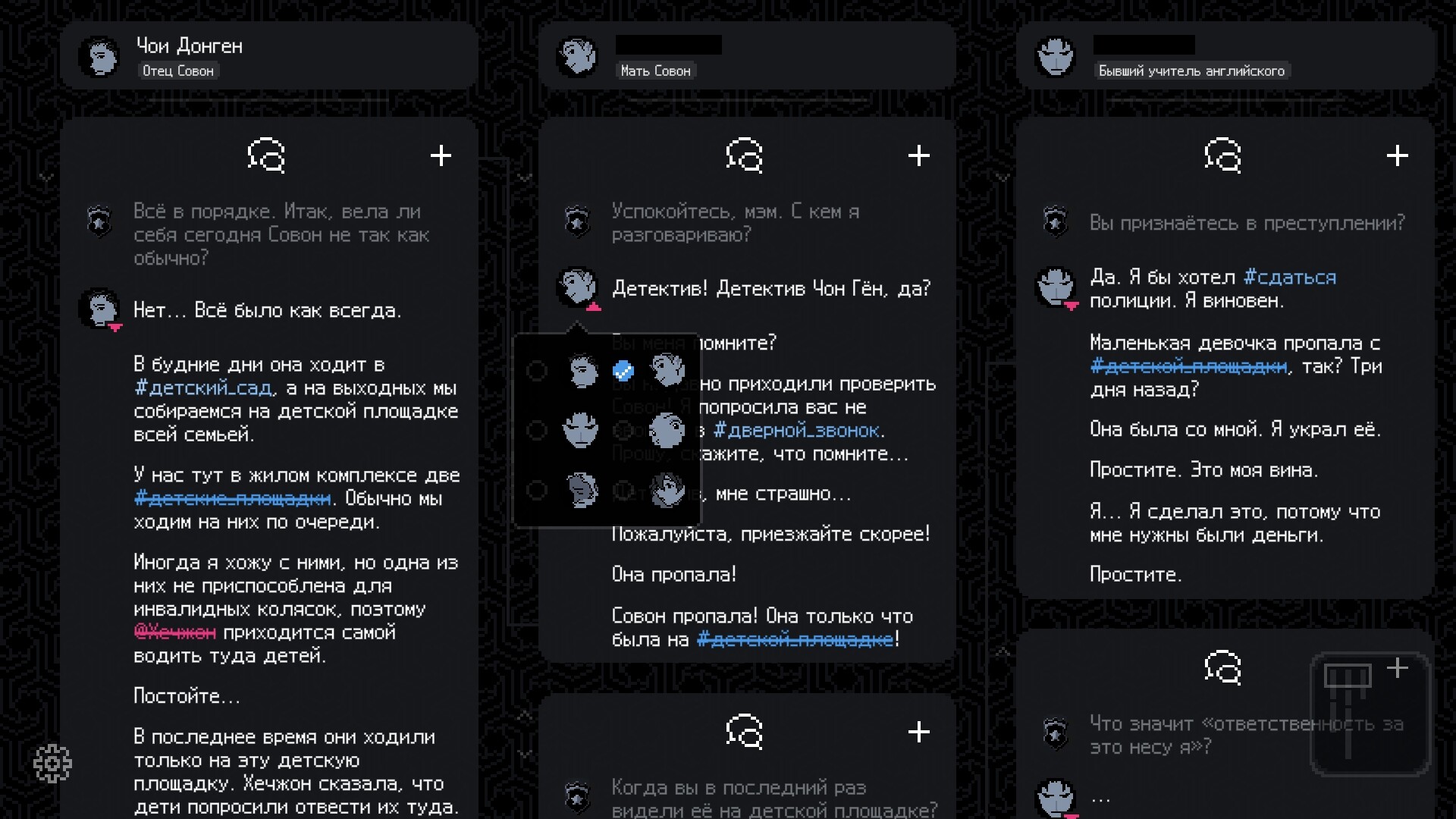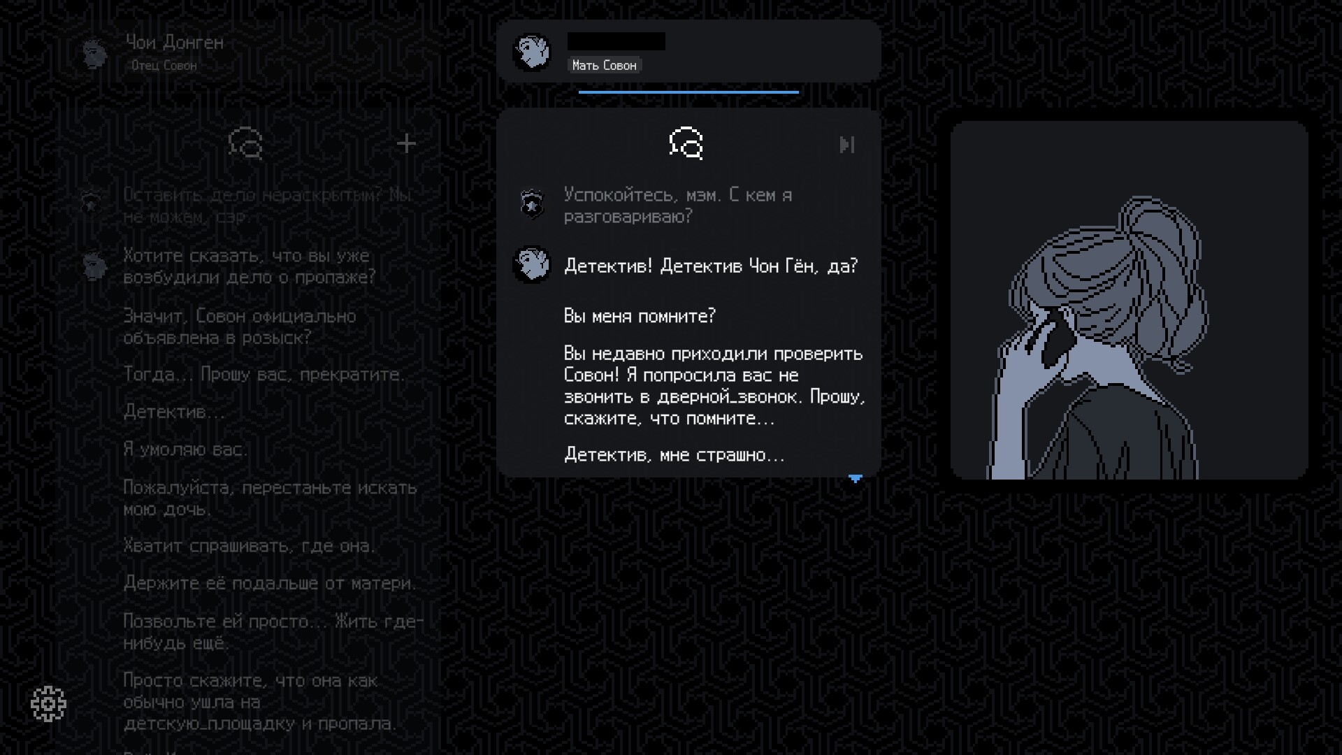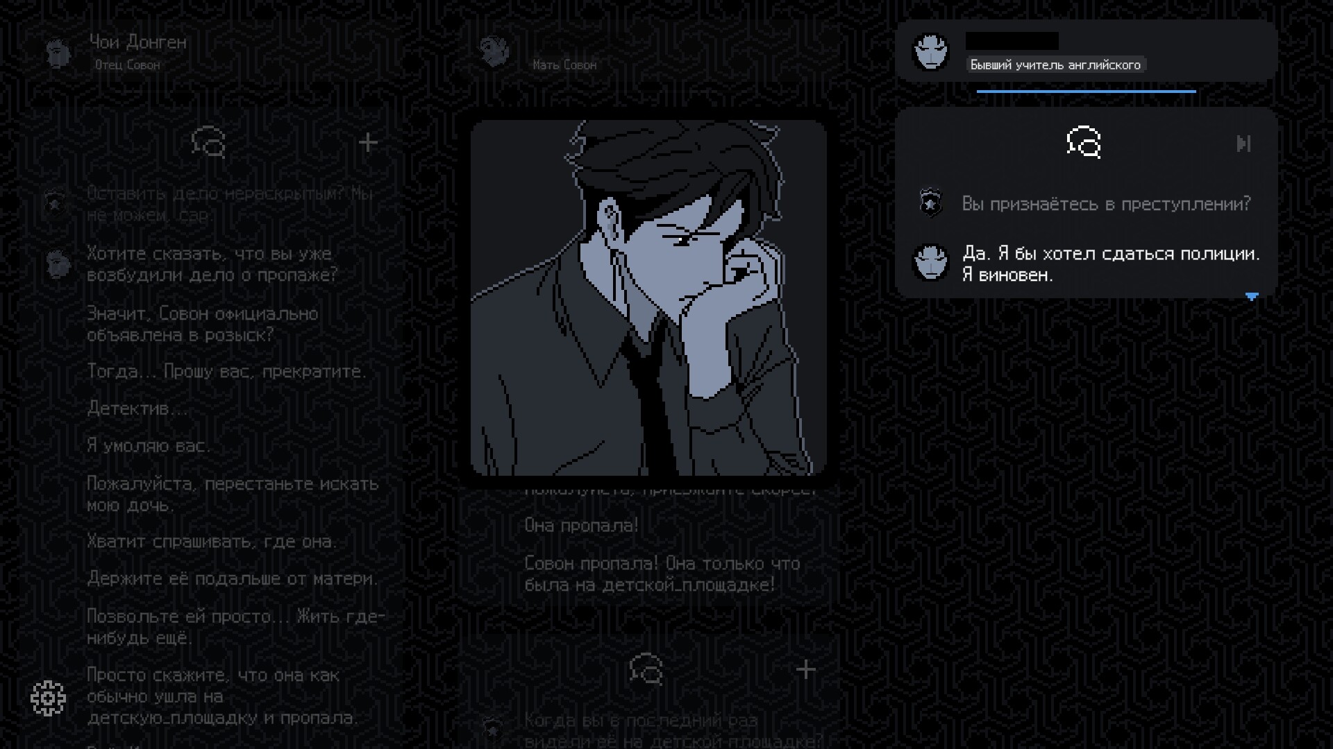 "Помню, как я удивилась, когда впервые увидела это дело. Каждый, кто был вовлечён, лгал по той или иной причине".#No_Case_Should_Remain_Unsolved (#Каждое_Дело_Должно_Быть_Раскрыто) — это игра-детектив, в которой игроки ищут и собирают воедино фрагменты воспоминаний, чтобы раскрыть давно забытое дело о пропаже девочки. Собирайте улики и показания свидетелей вместе с бывшим детективом Чон Гён и докопайтесь до истины.#Каждое_Дело_Должно_Быть_Раскрыто. 5 февраля, 2012. Маленькая девочка Совон объявлена пропавшей с детской площадки. Полиция опрашивает свидетелей и подозреваемых, но дело до сих пор не раскрыто.Спустя 12 лет после отставки старшего инспектора Чон Гён, её посетил молодой офицер полиции: девушка, которая умоляет пересмотреть дело Совон.Но с каждым новым воспоминанием одна вещь становится ясна: все, кто был причастен, лгали.Особенности игры. Испытайте своё творческое мышление, в котором игроки собирают воспоминания, как части пазла.Раскройте пароли, ключи, 54 диалога и 2 скрытых истины.В течение 2-3 часового прохождения, игроки узнают, почему исчезновение Совон - единственное дело, которое Чон Гён оставила нераскрытым.При участии оригинального саундтрека SeongYi Yi, композитора Legal Dungeon и The Wake! Далее