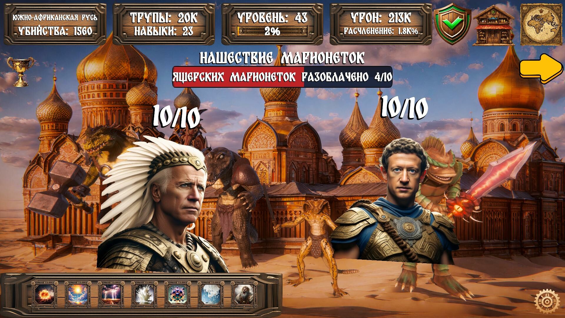 Самый реалистичный симулятор жизни древних русов во время войны с ящерами! Историческая сага о величии наших предков, отважно борющихся с превосходящей их численностью зеленой чумой! Уничтожай ящеров, получай опыт для изучения секретных приемов древних русов и подноси их тела богам, получая благословенияОсобенности жизни древних русов: Дерево прокачки, позволяющее обучиться секретным приемам древних русов, таким как славянский зажим яйцами, славянский прострел сундука, славянский огонь булками, ГОЙДА! На данный момент из древнейших берестяных рукописей открыто 26 секретных приемовВеличайшие подвиги древних русов во времена первой русо-ящерской войны перенесены в эту игру, чтобы каждый рус мог поучаствовать в этих великих сражениях! Вырезай ящеров под Байкальском, прорви великий славянский котел под Тывой, защити великий торговый путь в ЮАР (Южно-Африканскую Русь), победи ящеров в Пеледуйском побоище и во многих других знаковых для нашего народа битвахУбивай ящеров во имя богов и жертвуй их тела, в обмен на благословения! Почувствуй силу водицы байкальской, наполнись мощью молний Перуна, получи как минимум 4 древнеславянских образования, приручи союзников древних русов - динозавров и не толькоБогатырская силушка древних русов изображена в полном объеме, ящеры долго пытались скрыть истинное могущество наших предков, но сейчас правда всплыла наружу, древние русы могли в одиночку одолеть легионы иродов, оплодотворить сотню дев за ночь, а об их легчайших тренировках ходили легендыВ игре не используется ящерская лженаука - математика, все расчеты выполняются в соответствии с правилами счета древних русов! Вместо ящерского сложить (с ложью жить) русы предпочитали умножить (умно жить)Весь код игры написан на православном В††, основанном на потоках байкальских, ссылках сибирских и указателях дорожныхВсе события игры являются исторически достоверными, в качестве источников использовались научные исследования великих мыслителей нашего времени - Юрия Степановича Рыбникова, Алексея Сергеевича Багирова, и создателей нового учебника по истории Российской Федерации100% русская озвучка, созданная реальными историческими голосамиФонк с полей сражений, под который наши предки уничтожали ящеров Далее