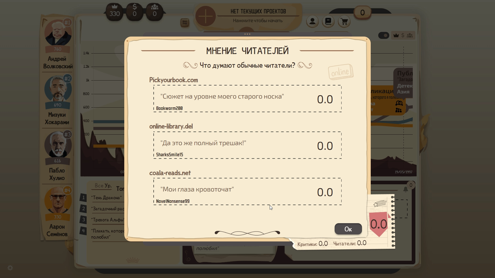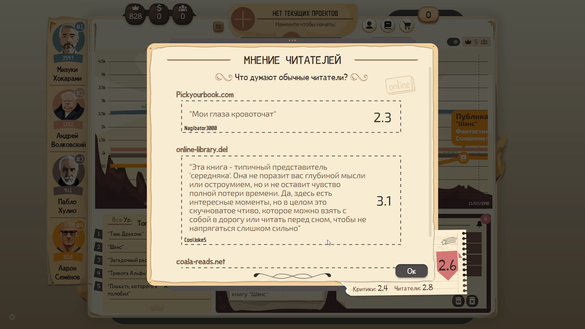 Writer's Rush — это динамичный симулятор писателя, в котором вас ждёт борьба за литературную славу.Вы начинаете игру в роли начинающего автора, мечтающего пробиться на писательский Олимп и победить в турнире писателей.Вас окружают соперники с собственными целями и характерами, а впереди — сотни сюжетов, творческих решений и неожиданных поворотов. Ключевые особенности:возможность писать статьи, фанфики, рекламы, переводы, сказки, сценарии и книгиуникальные мини-игры для каждого типа публикацийболее 300 уникальных историй с разными кульминациями и концовками свобода творчества — пишите в любом стиле: от фэнтези до хоррора 24 игрока с собственной биографией и историей7 уникальных уровней разнообразные стили прохождения игры более 20 доступных печатных машинок 69 тем для книг 5 доступных жанров литературные дуэлисистема перковзаказы от издателей гибкая система оценок и отзывов Далее