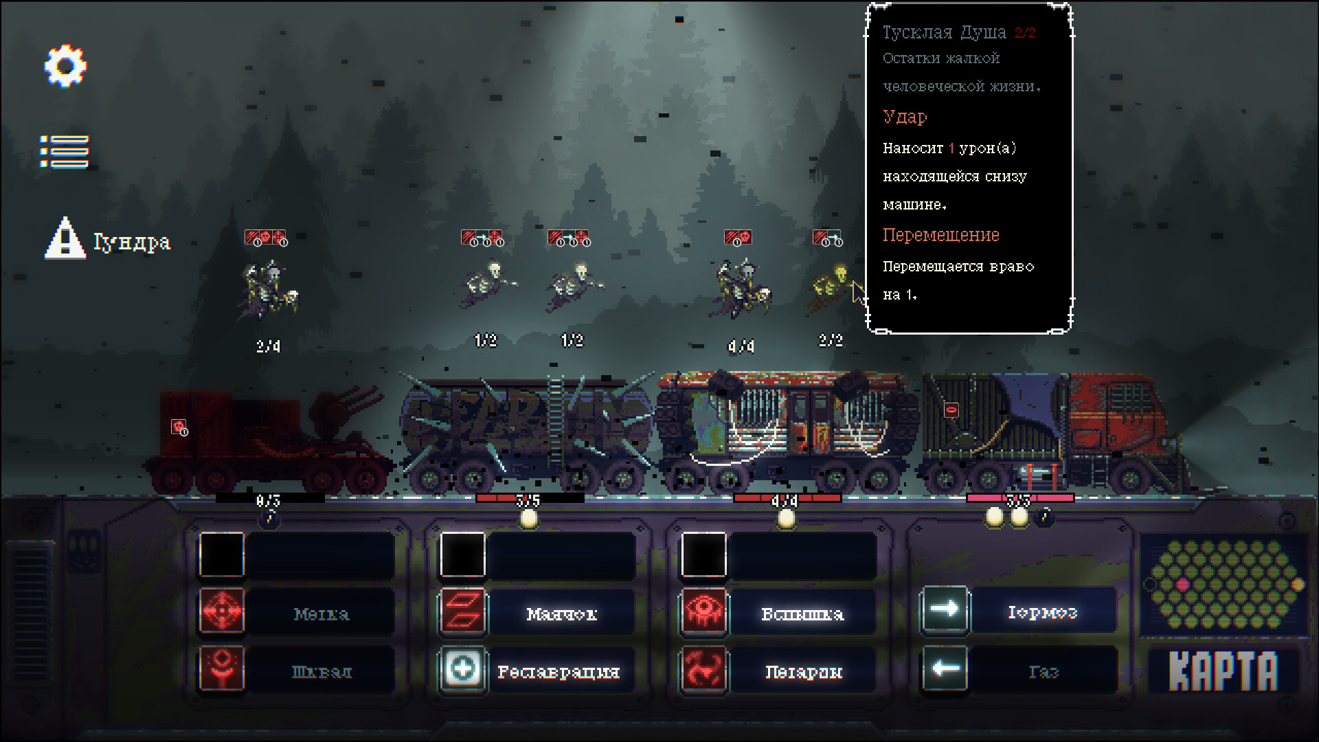 Особенности игры: Стратегия выживания:: В игре реализована уникальная пошаговая боевая система, где от скорости вашего конвоя зависит расположение ваших врагов.Власть урагана: Пробирайтесь сквозь кислотный дождь, сильный ветер, град и множество других погодных эффектов.Путешествие в стиле rogue-lite: Сражайтесь с различными Душами, которые с каждым разом становятся всё сильнее и сильнее.Управляйте своим конвоем: Меняйте расположение своих машин, чтобы реализовать свои личные стратегии. Каждая машина обладает уникальными способностями и преимуществами.Лаконичный сюжет: Успешное прохождение игры занимает от 30 до 60 минут. Пройдите сквозь Ураган Душ и узнайте его истинную природу.Геймплей: Пошаговая погоня по пустынному постапокалипсису. Регулируйте скорость, защищайте ваш конвой, старайтесь выстроить ваших врагов в ряд, чтобы активировать оружие и уничтожить их раз и навсегда.История: Проснувшись 3 года назад, я обнаружил, что совершенно ОДИН. Моя семья пропала, город опустел - все исчезли без следа.Однажды ночью, пытаясь заснуть, я услышал ИХ. Миллионы шёпотов взывающих друг к другу. Взглянув по сторонам, я понял, что на меня надвигается УРАГАН ДУШ, замораживая деревья и засыпая всё на своём пути чёрным, как ночь, снегом.За последние несколько дней я СОБРАЛ конвой из машин, в котором было достаточно оружия и припасов, чтобы продержаться несколько недель.Но с каждым днем ураган подбирается всё ближе, я начинаю осознавать истину.Я совершенно беспомощен, от него не скрыться.Если и есть какая-то надежда, то она заключается в том, чтобы добраться до самого конца. Моя задача - пройти СКВОЗЬ Ураган Душ.Там то мы и встретимся. Далее