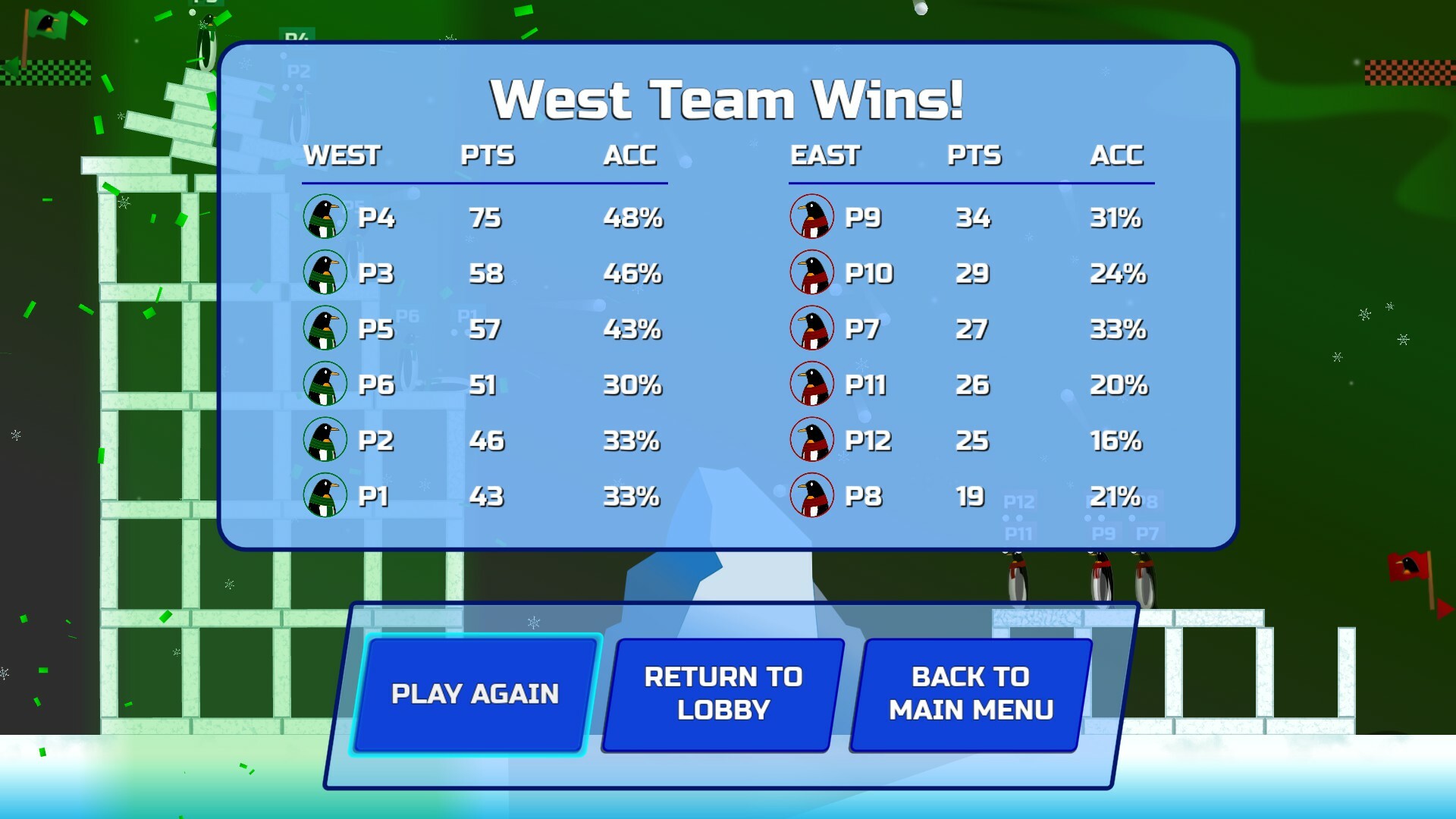 Gather up to 12 friends, family, or rivals for a fast-paced snowball showdown! Pick your penguin team, West or East, and face off to determine the champions of the ice! SnowDown is a party game played on a shared PC screen, where players use their phones or other internet-connected devices as controllers. Simply pull back on the snowball and release to send it flying to the other side! Throw snowballs to build up your TURBO meter over time, landing hits on your opponents and their fort for maximum gain. When the time is right, simply activate and pull back!Don't forget to keep an eye out for presents from above! Targeting these can bring your team a special surprise to turn the tide of the match. Knock 'em down, get knocked down, get back up again! Try to keep your team's fort standing against the onslaught of snow and the forces of gravity as you both race to the top with increasing speed. One throw can make the difference between victory and defeat! Shared-screen Multiplayer - Host games for up to 12 players using their own devices, no app installation or setup required. Simply visit the website in a browser to join! Physics-based Action - Hone your aim and find the weak points of your opponent's structure. The right hit can bring everything down! Randomized Power-Ups - Keep each round unique with a variety of power-ups to provide maximum snow fort destruction. CPU Players - Computer-controlled players with adjustable difficulties can be added to either team to add balance or a co-operative challenge.(Requires a broadband internet connection for the PC and player devices. An unstable or poor connection may adversely affect gameplay.) Далее