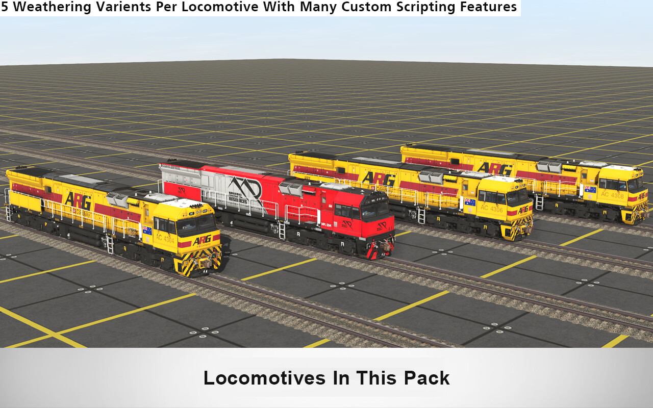 The C44aci is a model of Australian heavy duty diesel electric locomotive designed by UGL Rail and built at the Broadmeadow factory. It is operated by a number of rail freight operators. The design is based on the National Rail NR class but with some modifications and upgraded features. The C44aci has become the new baseline standard product of Australian Locomotives with many operators ordering these locomotives. These Locomotives Feature: -Full PBR Texturing -Highly Detailed Custom Cab...The C44aci is a model of Australian heavy duty diesel electric locomotive designed by UGL Rail and built at the Broadmeadow factory. It is operated by a number of rail freight operators. The design is based on the National Rail NR class but with some modifications and upgraded features. The C44aci has become the new baseline standard product of Australian Locomotives with many operators ordering these locomotives. These Locomotives Feature: -Full PBR Texturing -Highly Detailed Custom Cab -Animated Doors -Animated Windows -Number Board and External Light Toggles -Custom Scripting -Emissive Lighting -Custom Dynamic Brake Sounds -Custom Locomotive Brake Sounds -Custom Traction Motor Sounds -Blinds Lowered/Raised Toggle -Coupler Flag On/Off Toggle -Dynamic Break Throttle Credits: Credit to S301, Scratchy, H222, lesley & itzmejane for beta testing these locomotives and providing feedback Credit to S301 and GDennish for providing the locomotive with advanced scripting and features. Credit to Graham Baker and Aaron Hobson for providing locomotive reference photos, locomotive information and helpful resources Credit to Azervich for providing realistic locomotive engine physics Credit to all others who helped during production of this locomotive. Pack includes the following locomotives: Далее