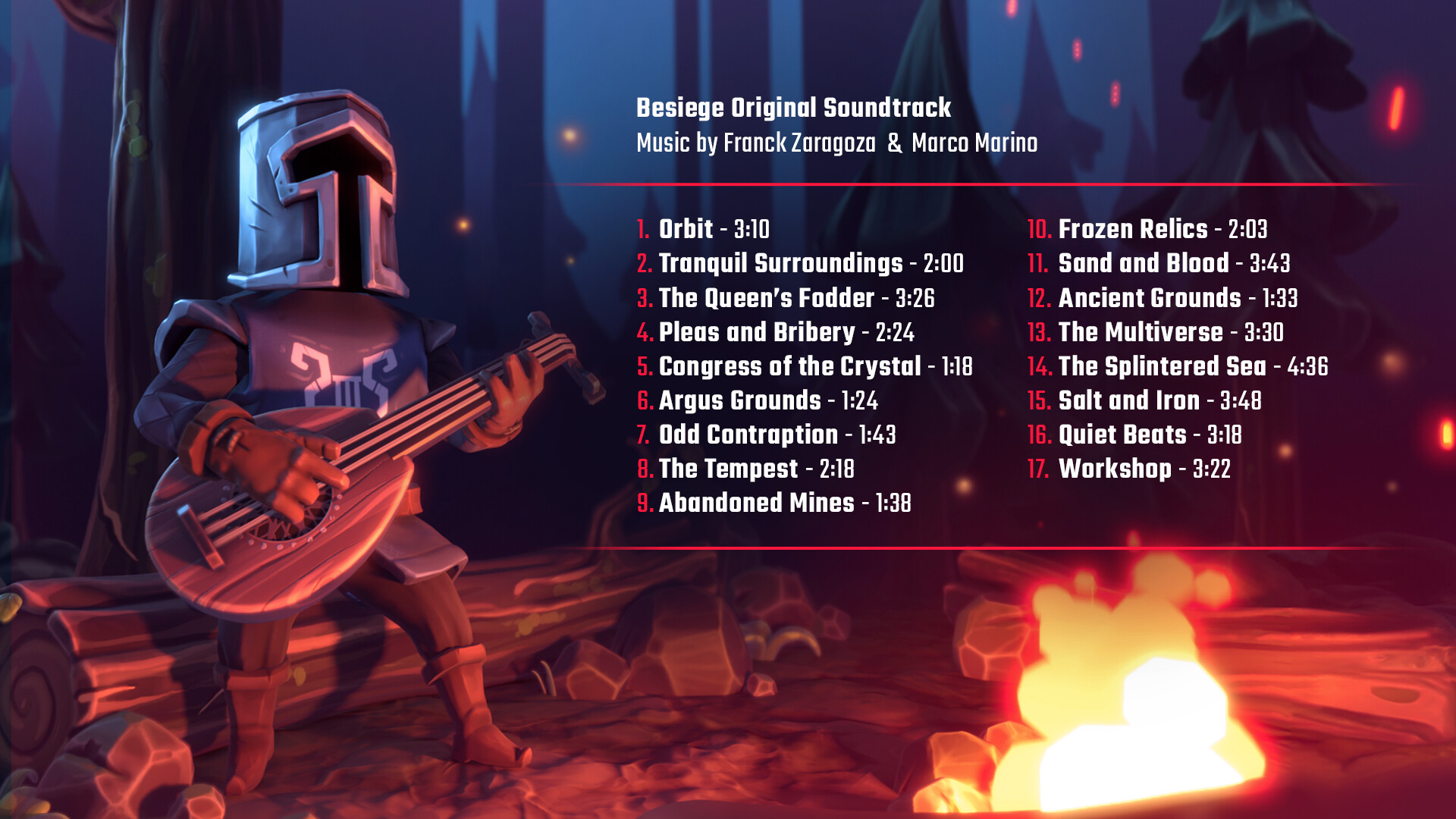 Погрузитесь в неповторимую атмосферу Besiege с полной коллекцией музыки из основной игры и дополнения The Splintered Sea. Все композиции тщательно сведены, чтобы обеспечить идеальное качество звука на любом устройстве! Оригинальный саундтрек доступен в составе комплекта Supporter Edition, созданного для игроков, которые хотят дополнительно поддержать Spiderling и разработку Besiege. Далее