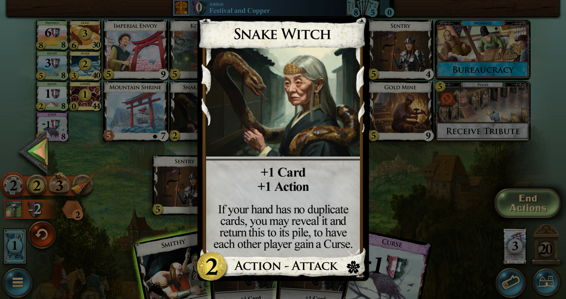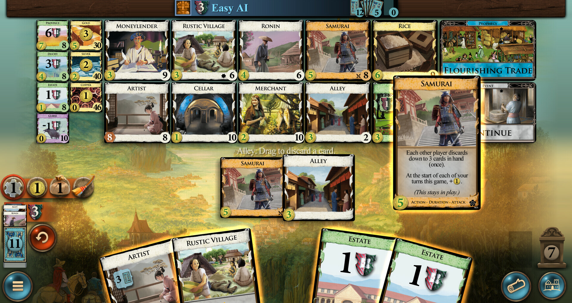 The feudal Japan expansion. Debt returns, now with on-play debt; Events also return. Prophecies are rules changes that will happen sometime in the future, after enough Omens are played; Shadow cards can leap into play from the bottom of your deck.Shadows can be played from your deck. Playing a card from the deck works just like playing one from your hand.Omens provide a way to tick down time until the Prophecy. Omen cards remove Sun Tokens from the Prophecy. When there are no more Sun tokens, the Prophecy takes effect. If any Kingdom cards have the Omen type, one Prophecy is included in the game. Prophecies are rules that can eventually apply to the game.Flavor. We journey now to the islands to the east – or west, depending on where you are relative to them. Here your title is Emperor. They tell you you're just a figurehead, though you can still order whatever breakfast you want. They may be right; you did get that breakfast. Your ceremonial sword and armor are made of paper. The samurai never let you into their tea parties, and the ninjas are always tying your shoelaces together. And the epic poem they wrote about you is only 17 syllables long. Rice has been adopted as currency, and no-one seems to even be trying to get your face onto the grains. But when you wake up each morning and look out over the land, life doesn't seem so bad. Now, what's for breakfast?-- Donald X. VaccarinoFeatures. 25 Kingdom cards9 using Debt6 Omens5 Shadows15 Prophecies10 EventsHigh complexity Далее