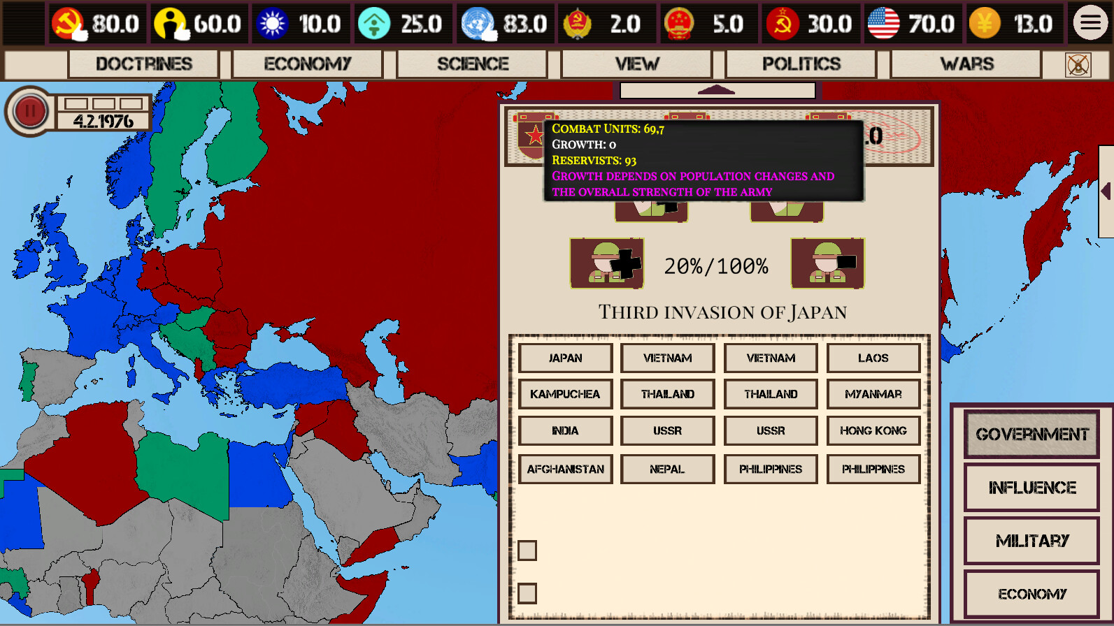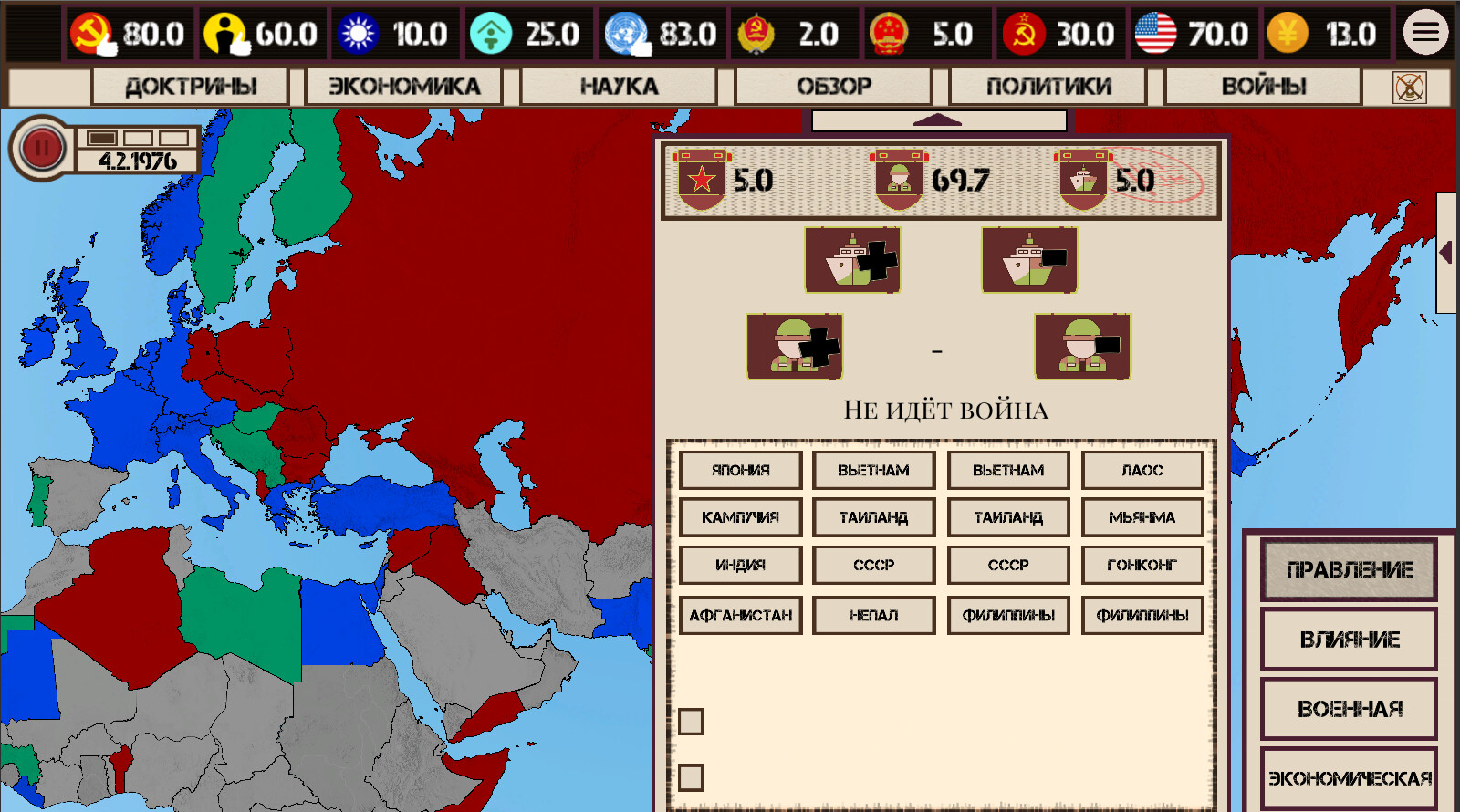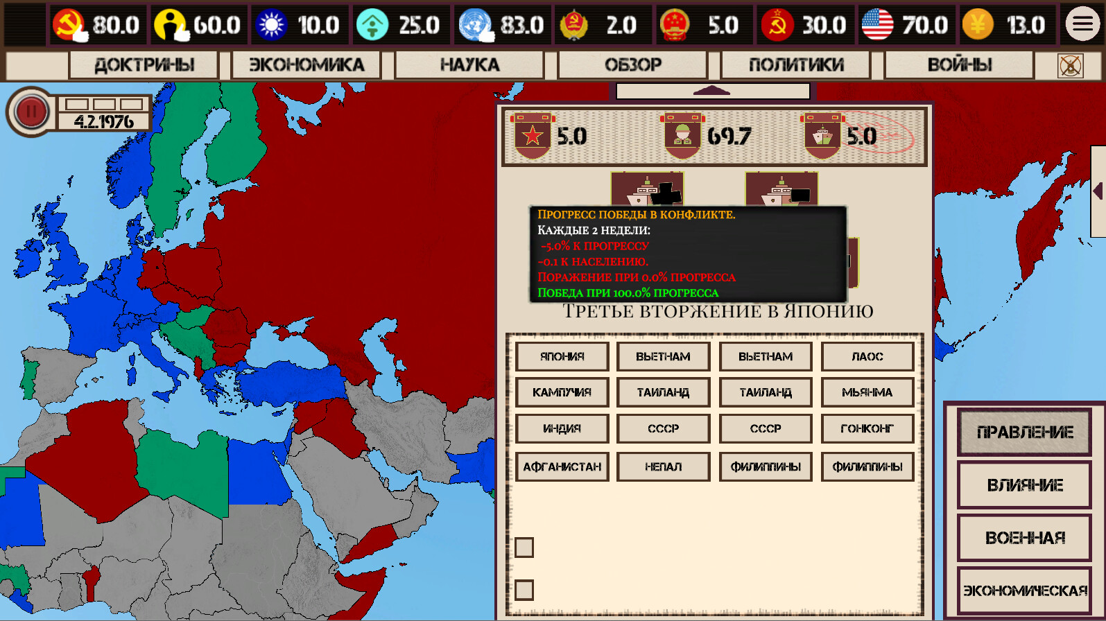 Не надоело ли Вам постоянно вмешиваться в уже идущие конфликты лишь со стороны? Или провоцировать их, но даже тут не имея возможности напрямую вмешаться и ввести войска, покончив с врагами раз и навсегда? А может быть вы просто хотите старое-доброе расширение жизненного пространства? Ну что ж, пришло ваше время: - напрямую насаждайте нужные вам режимы среди соседей или приводите там своих друзей - расширьте не просто зону влияния, а свои территориальные границы за счёт Юго-Восточной Азии - создайте самое большое государство - Восточно-Азиатскую Федерацию - покажите Советскому Союзу всю мощь китайской армии и даже восстановите китайскую юрисдикцию над островом Черного Дракона - устройте успешное морское вторжение в Японию, дабы их Божественный Ветер больше никогда не смог помочь им - и другие 16 возможных прямых войн - а также новые концовки и достижения Приятной игры! Далее