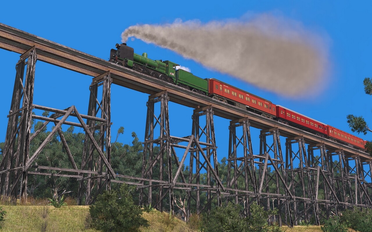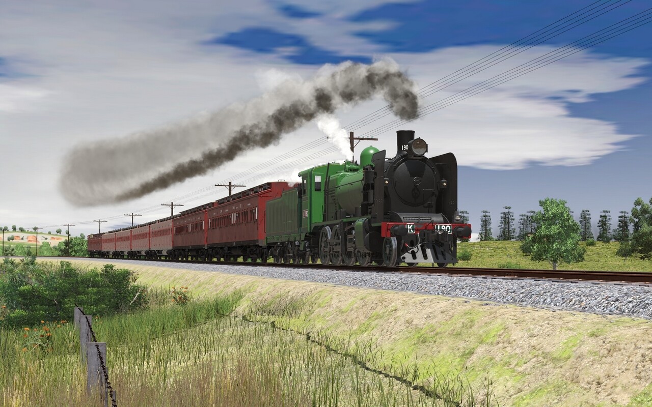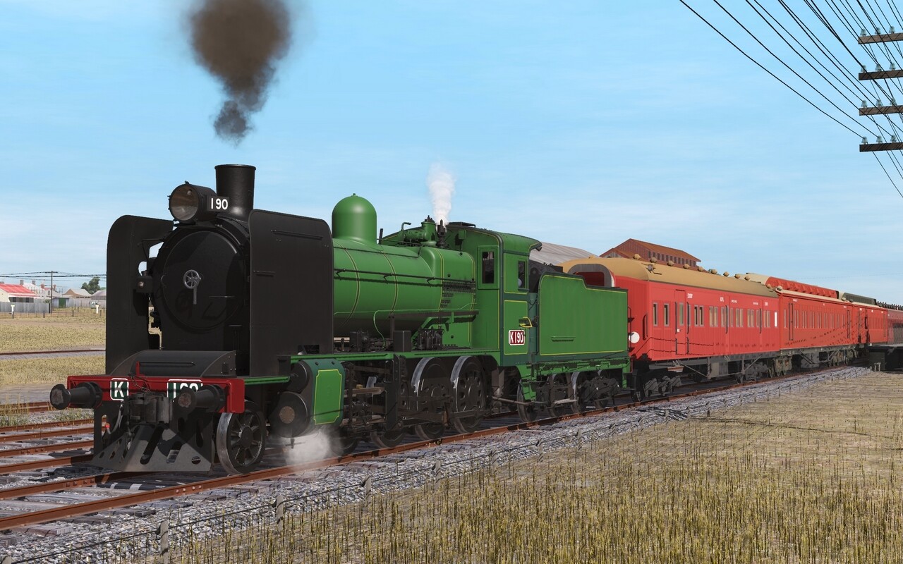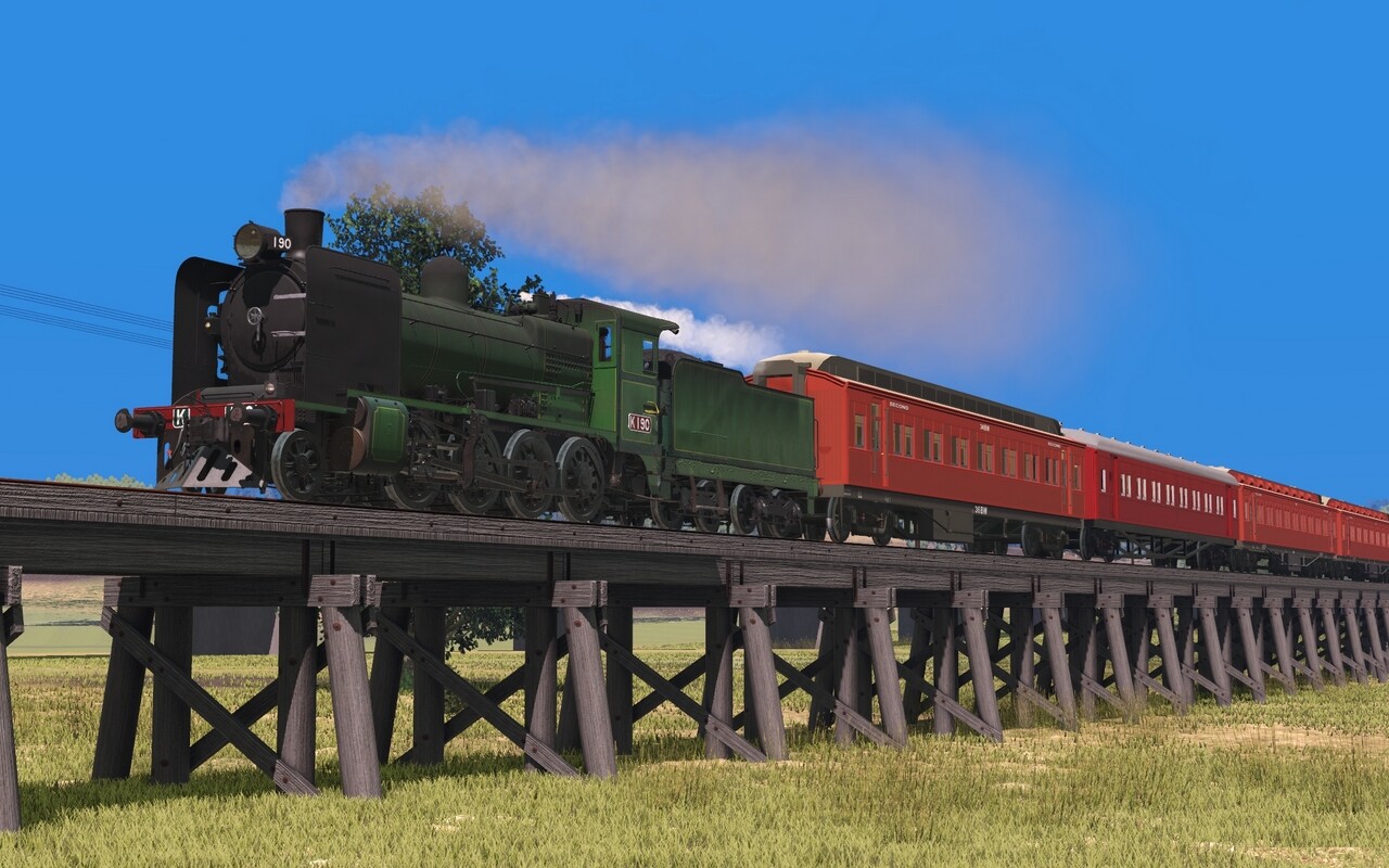 The Victorian Railways K class was one of the most successful classes of locomotive built for the Victorian Railways, built in several batches in 1922/23 (for the first series), and 1940-1946 for later versions, resulting in a class of 53 with a few variations. These versatile 2-8-0 Consolidation locomotives were designed for use on the light branchlines in Victoria, but saw use in all sorts of service, from branchline freight, mixed and passenger trains, through to mainline roadside goods service, yard shunters, and some mainline passenger use. This class saw use until the end of steam on the Victorian Railways and beyond, with K162 operating as the North Ballarat workshops pilot (shunter) until 1979. Now there are 4 currently preserved operational (3 on the mainline), these being K153, K183 and K190 with Steamrail Victoria, K163 at Mornington Railway, plus K160 under overhaul/restoration for the Victorian Goldfields Railway and many others statically preserved, stored, or under restoration around the state. This pack features 4th series K class (single cab window, and boxpok wheels), K190, as preserved between 1979 and 1993 in 2 tone green with yellow lining in 4 variants to cover changes to the livery and details on the loco and tender over this period. These models are designed for broad gauge (5ft3in gauge) track. These locos include the following features: *Texture swapping with "Pristine", "Cleaned", and "Weathered" options, with automatic swapping on the tender to match the loco (randomises the livery when placed). *Scripted exhaust steam/smoke effects that change depending on regulator, cutoff, coal level, season and weather. *Scripted steam effects to change depending on season and weather. *Scripted Cylinder drain steam and sound effects, operated using ALT+D or the cylinder drains lever in the cap. *Other scripted steam and sound effects, including air compressor, brakes, and more. *Working generator for lights, including steam and sound effects, controllable from properties, cab view, and keyboard controls. *Number boards, marker lights and cab lights (in interior view) turn on when the generator is on. *Variable glow on headlight depending on high/low beam and day or night time. *Custom scripted 'quill' and 'pop' whistle options, via secondary and tertiary whistle controls. *Highly detailed PBR materials. *Heightmapped number plates, and other details. *Highly detailed custom interior view, with operational controls, including functional gauge glass valves, and working cylinder drain cocks lever. *Scripted, animated, reverser and valve gear in exterior and interior views. *Animated dual automatic and screwlink couplers, and brake hoses/taps using ACS. *Scripted Marker Lamps and Tail discs, with glow lamps (thanks to Bloodnok) - compatible with the VR Set Train Lamps driver command. *Animated cab door, cab windows, smokebox door, staff exchanger, and tender tank filler lid. *Cab doors, windows, and staff exchanger can be controlled from inside the cab as well as via the properties window. *Deforming coal load animation in tender, giving realistic shape as coal is used. *Light engine consists for each version of the locomotive. Locos and tenders in this pack: VR K190 2tg 79-80 VR K190 2tg 80-83 VR K190 2tg 83-86 VR K190 2tg Ten 79-86 VR K190 2tg 86-93 VR K190 2tg Ten 86-93 Далее