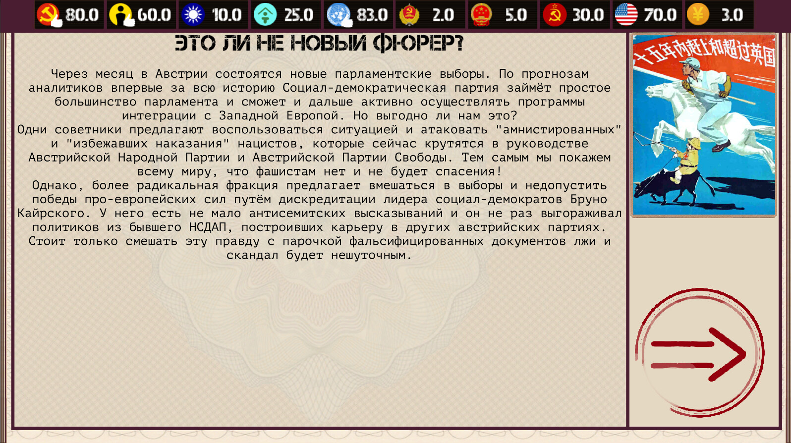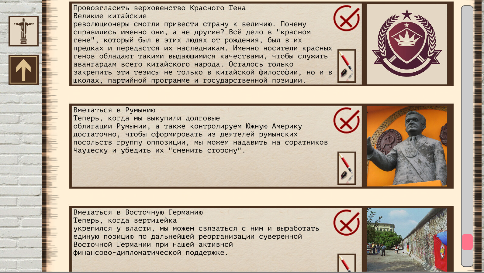 Пришло время настоящему авангарду каждого народа пробудиться и скинуть оковы охлократии! Красный ген не забыт и каждый его представитель каждого народа должен стать единоличной правящей прослойкой. Кто-то может назвать это реставрацией монархии или аристократии, но тут даже нет никакой связи, ведь только наследники революционных кадров несут в себе генетический материал, определяющий их революционный дух! - Утвердите господство теории Красного гена в Китае! - Повлияйте на судьбу Австрии и Венгрии и, возможно, даже реставрируйте Австро-Венгрию! - Реализуйте судьбу красного гена югославов! - Восстановите утерянные пути Румынии! - Защитите идентичность прусского народа от германо-французской экспансии! - Оживите наследие Яна Гуса! - А также вовлекайтесь в новую механику швейцарских тайных счетов, но остерегайтесь их заморозки! «Остановить движение народа, пробудившегося после тысячелетнего сна, невозможно. Но если б царь стал твердо и смело во главе самого движения, тогда бы его могуществу на добро и на славу Государства не было бы меры». Михаил Бакунин. Далее