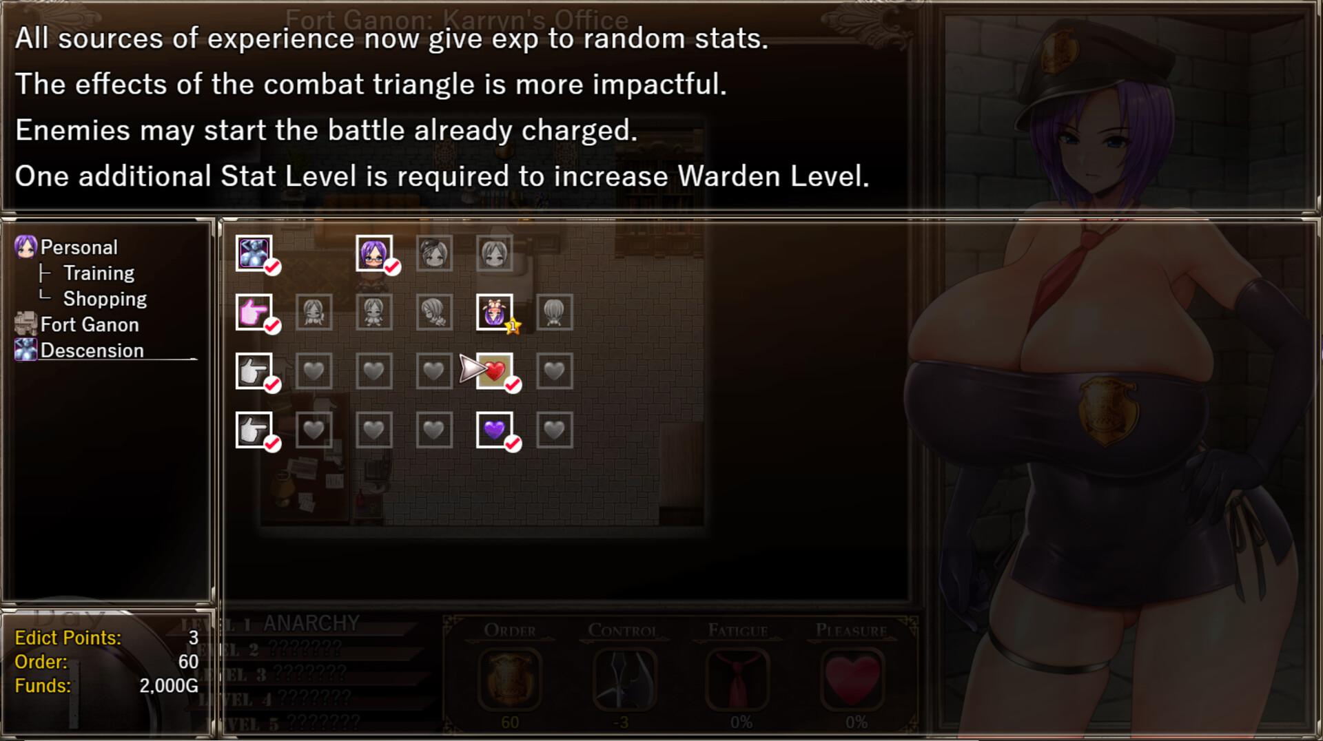 This optional DLC adds a new game mode and cosmetic options for Karryn's Prison!Some have called it a world wonder actually. The marvels of human engineering. The peak of culture. But let's talk about what's actually inside this DLC. The first addition is the titular tits that Karryn can now possess. This is a completely optional cosmetic that took a painstaking and loving year to mound into flesh.The second addition is the all new Descension Runs. After beating the game once, there is now a new option available before starting a new run. Deep in the depths of Karryn's Prison is a new difficulty mode called Descension. A Descension run composes of a series of scenarios.A scenario composes of 'Unique' and 'Carryover' effects that warps normal gameplay.'Unique effects' are only active during that scenario.'Carryover effects' are active for the rest of the Descension run.A scenario is won upon beating the final boss.After beating the scenario, you will return back to the scenario selection.You will then have a choice between continuing the Descension run by picking a new scenario, or quitting the current Descension run.You will also be able to quit the Descension run after getting a Game Over.Descension runs can be played on any difficulty.Doing a Descension run will reset all levels and stats, and cancel any selected Challenge run.The five different scenarios can be picked in any order.There's two different type of obtainable Titles as a reward for doing Descension runs:The first type of Titles is rewarded for beating a scenario for the first time on Warden Mode or higher.It will allow you to enable the Carryover effect of that scenario during any normal run.The second type of Titles is rewarded for beating multiple scenarios on Prisoner Mode.Which means beating a scenario, and then continuing the Descension run to keep descending.How far will Karryn descend in order to complete a full Descension run? Далее