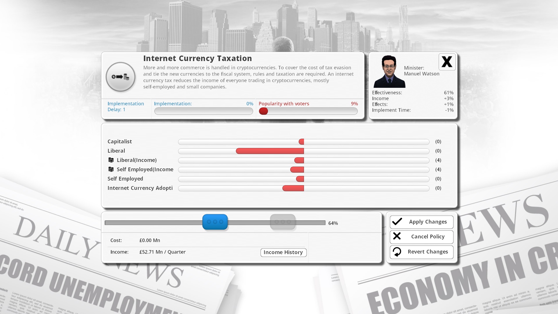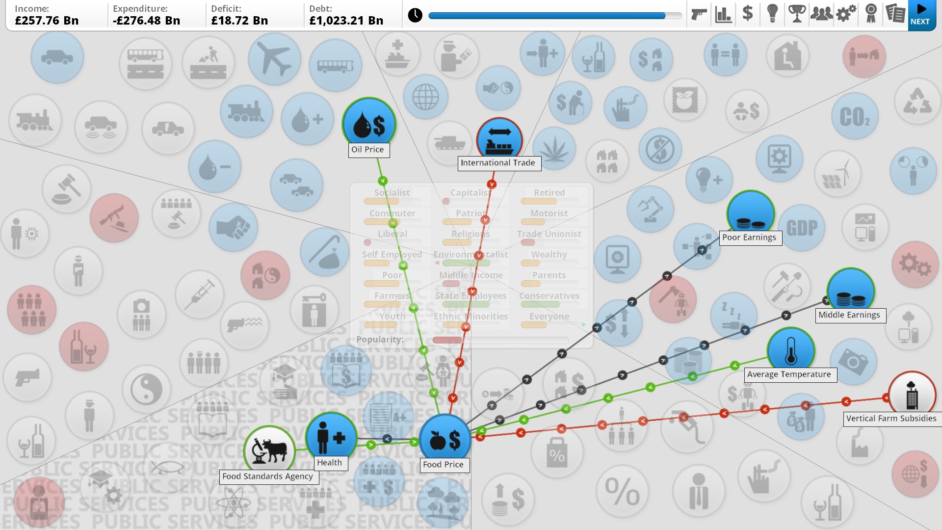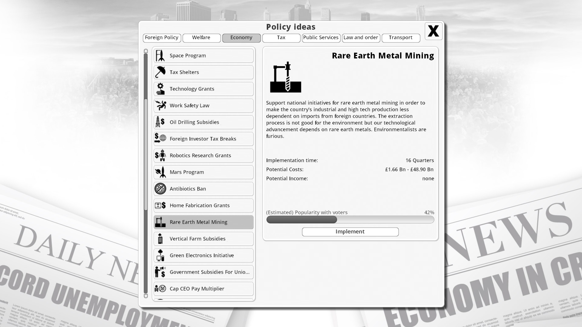 What challenges are to come for the politicians of the future? Mass unemployment due to the automation of factories? or will this lead to a leisure society and equality? Will ubiquitous drones lead to better law enforcement and less traffic congestion or to widespread crime and infringement of privacy? Should we give the go-ahead to human cloning? will climate change cause problems for our country? Are we going to run out of rare earth metals? or oil..? The people look to YOU for leadership in these turbulent times. Can you keep the country happy and prosperous as we head to the 2020s and beyond?Includes..New Policies:Human Cloning Research GrantsDrone Strike ActElectric Cars InitiativeClimate Change Adaption FundOne Child PolicyMars ProgramAntibiotics BanMandatory Microchip Implant Home Fabrication GrantsRare Earth Metal MiningDriverless Car LawsSynthetic Meat Research GrantsInternet Currency Taxation Anti-Gravity Research GrantsVertical Farm SubsidiesElectronic Direct DemocracyGreen Electronics InitiativeInternational Fusion Research ProjectFarmland Acquisition ProgramLimit Automated TradingAutomation TaxNew SituationsCyclonesFood crisisDrone ProtestsRare earth crisisReal estate bubbleLuddite RiotsAntibiotics-Resistant BacteriaWater shortageWeather Prediction TechnologyVirtual Reality Market LeaderPlus new dilemmas, new events and some new simulation data.. Далее
