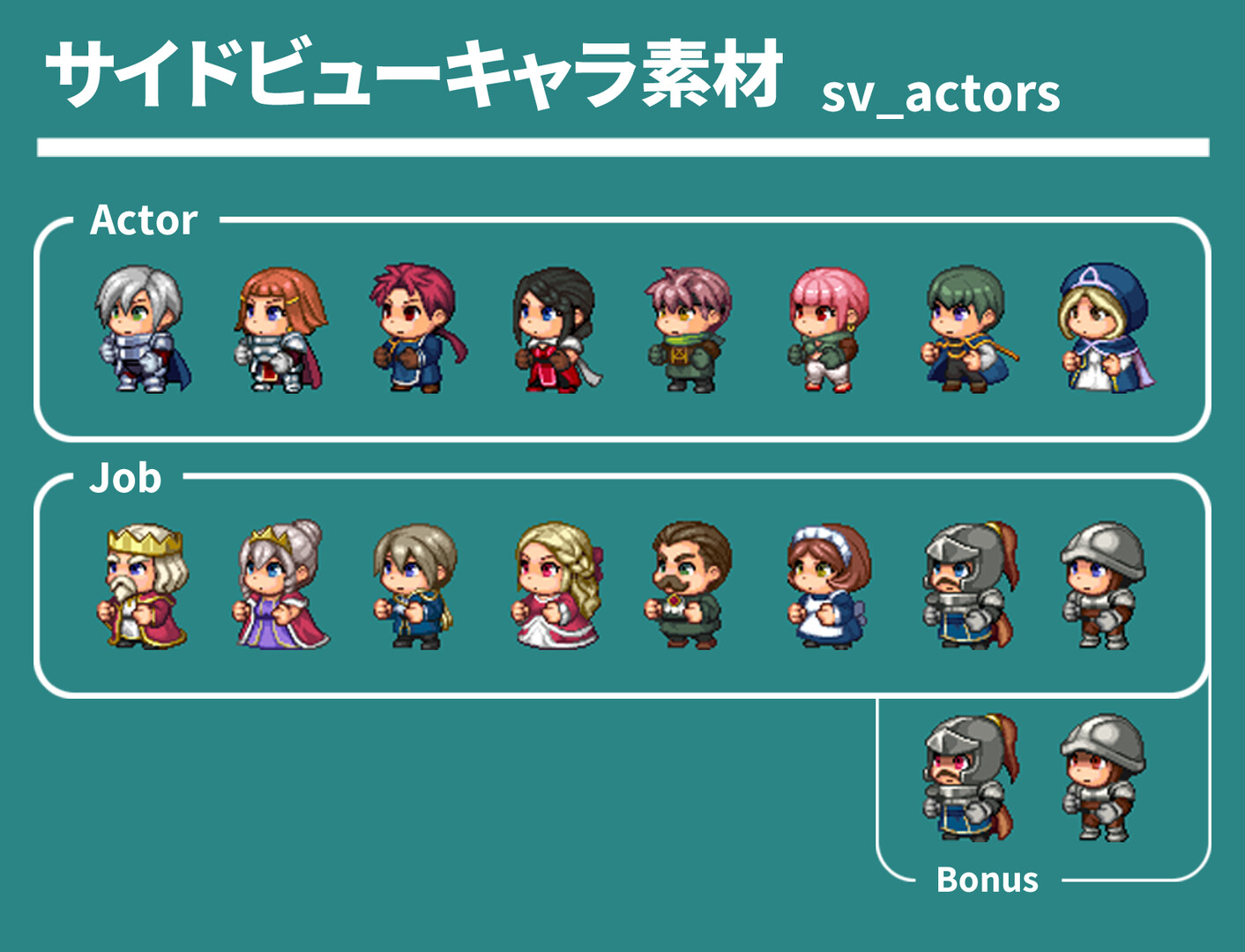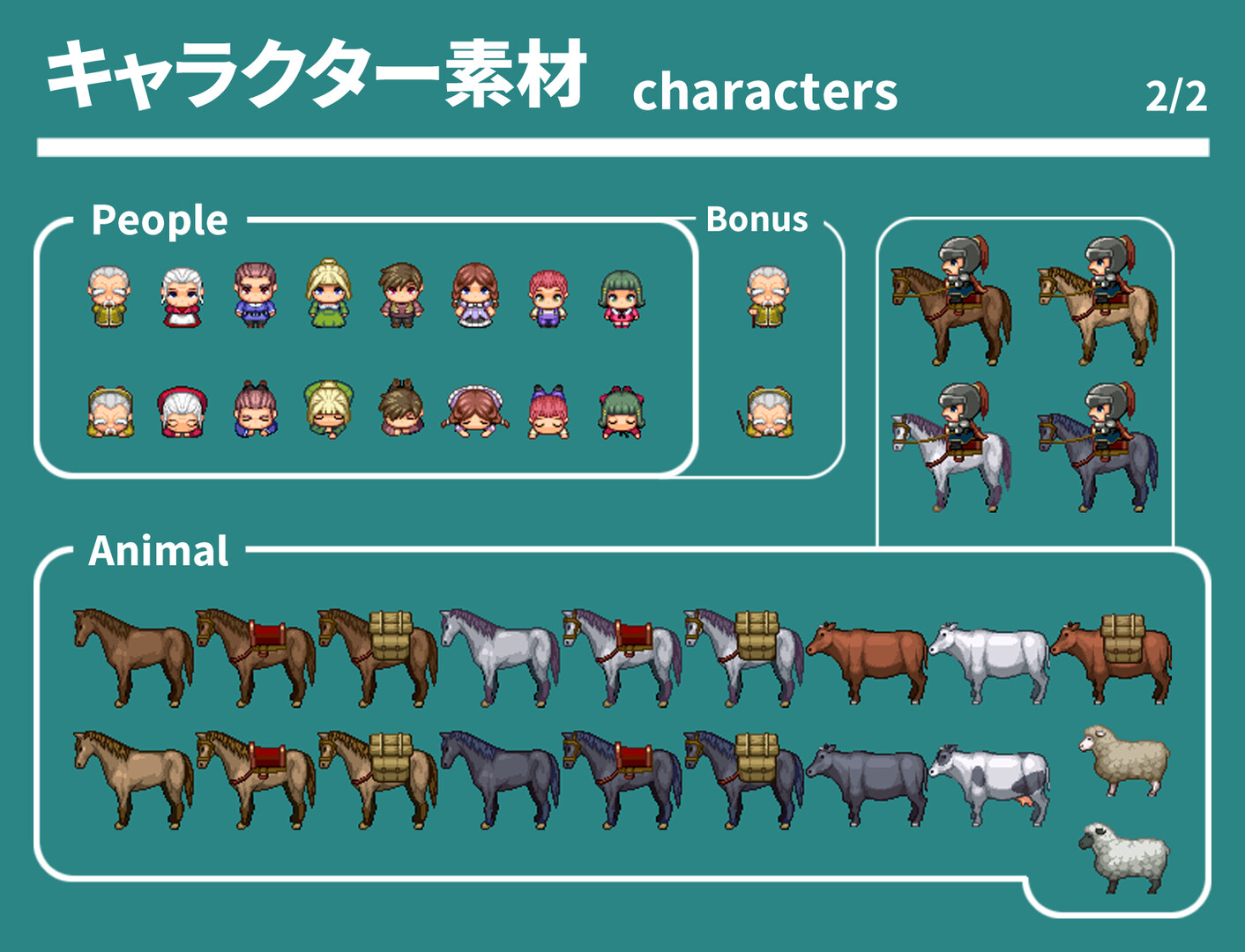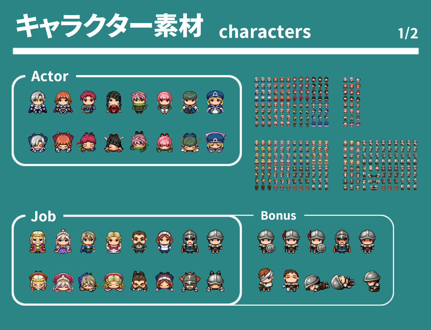 Introducing a new fantasy character asset pack from REFMAP!This collection includes walking character sprites along with corresponding side-view battlers. In Vol. 2, you'll find even more versatile characters that can be used in various settings, just like in Vol. 1.Be sure to try it out alongside Vol. 1 and the default assets!*******************************************Characters: 53Main characters: 8 (8 bodies with collapsing motion)Occupations: 8 characters + 5 arranged versions (9 collapsing motions, 5 special motions)Townspeople: 8 + 1 arranged version (9 collapsing motions)Animals: 19 (4 bodies with collapsing motions)SV: 18 types Main characters: 8 Occupations: 8 types + 1 arranged version*******************************************・This pack is for use in RPG Maker Series or the engine of your choice.・OK to be used in Commercial projects made in RPG Maker・You may modify some of the assets (but not redistribute them) for your own game use only. Далее