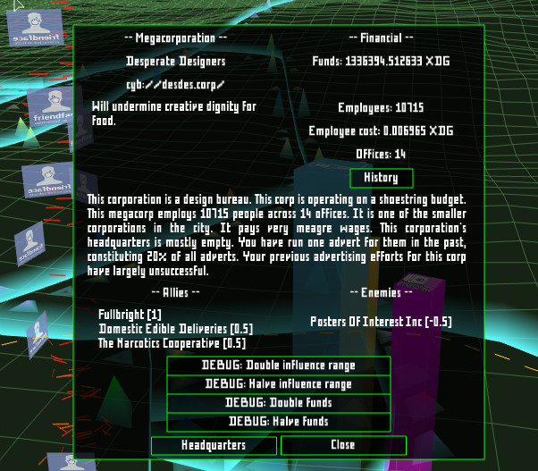 Нет денег? Хочешь работать В НЕБЕ? Присоединяйся к нам в AdvertCity! Огромное, процессуально генерируемое пространство, ожидающее продаж чего угодно от ТЕБЯ!AdvertCity – это киберпанк-игра рекламных магнатов. Исследуй громадный реалистичный город и размещай свою рекламу повсюду. Летай по киберпространству и размещай ссылки онлайн. Наблюдай, как развивается экономика города в результате твоих решений.ХАРАКТЕРИСТИКИ. Огромные процессуально генерируемые города в реалистичном ландшафте.Перемещайся между физическим пространством и виртуальным, чтобы увидеть разные перспективыУправляй империей рекламы, размещая рекламу онлайн и используя физическую рекламу. Осмотрительно выбирай своих клиентов и рекламу, чтобы ты мог публиковать свою репутацию.Оказывай влияние на экономику и рост города своим выбором рекламы.Строй здания и улучшай свой центр управления, чтобы расширить свое влияние.Нанимай работников и открывай новые рекламные технологии.Захватывай мегакорпорации и сделай город своим!Одновременные синхронизированные саундтреки, оригинальная музыка (продолжительностью в час), включая пост-рок, джаз и элементы глитча.Система единовременного сохранения по типу Roguelike.Великолепная графика, но отлично работает на более старых компьютерах – будет работать даже на том старом ноутбуке, где ничто другое не работает!Даунлоуд для Windows, Linux or OS X.САУНДТРЕК. ТЕХНИЧЕСКИЕ ДЕТАЛИ. Полностью индивидуализированный графический движок, разработанный с нуля для Cyberpunk Jam.Звук HDR, с возможностью многодорожечного синхронного перекрёстного затухания между виртуальными деками, и с полной поддержкой для EBU R128 2011.Разработано с учетом VR поддержки с самого начала, первые прототипы апробированы на Oculus Rift.Совместимость с более старыми машинами – без особых требованиях к шейдеру, работает на Windows XP (или Linux или OS X), без требований к библиотеке или.net.Первоначальная версия была создана всего за 7 дней для Cyberpunk Jam. После нашей Alpha версии, мы запустили успешный kickstarter, чтобы довести игру до версии Beta и далее. Год спустя создание игры, наконец, завершено, и она готова к использованию!Скриншоты процесса разработки: Далее