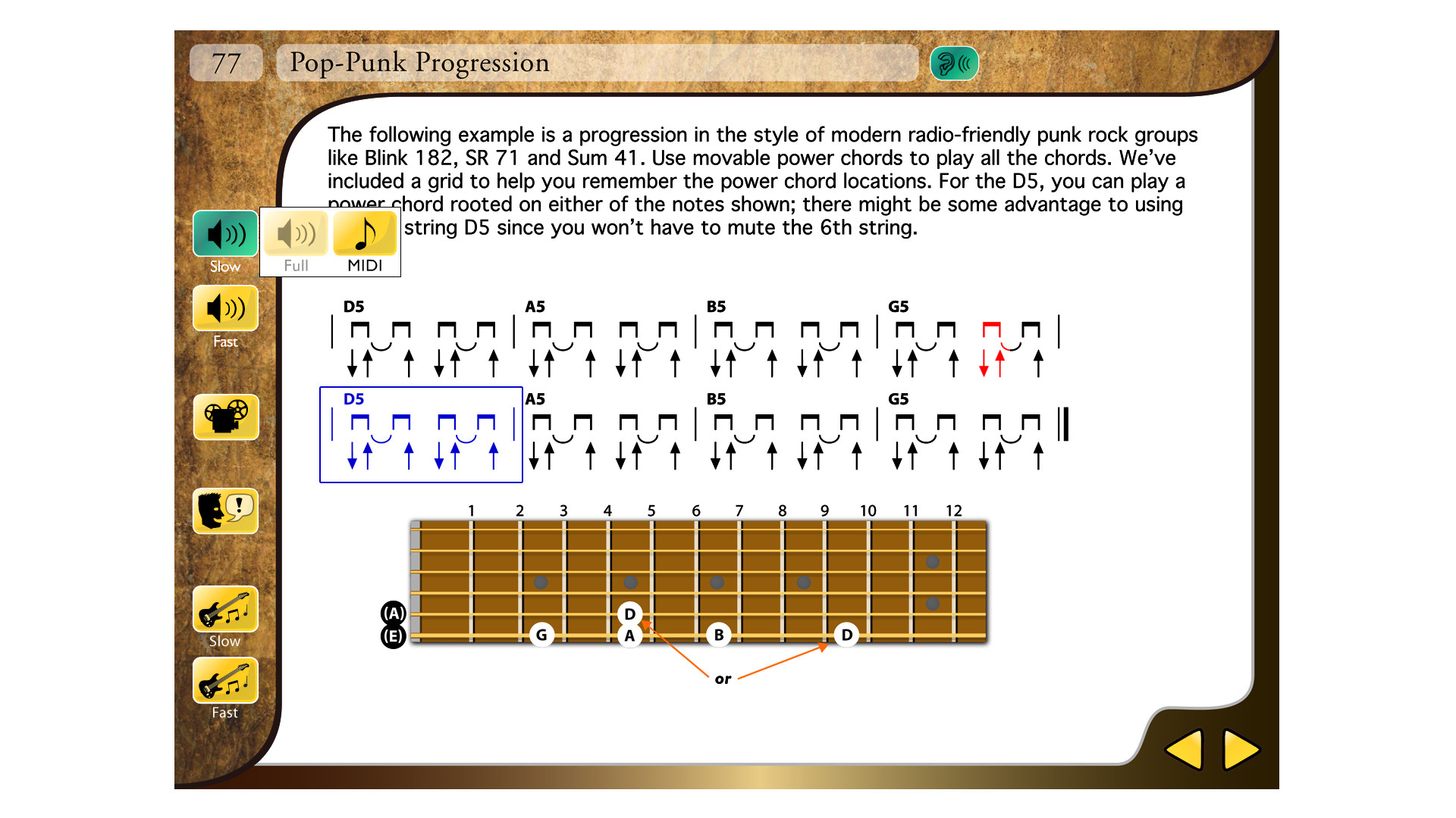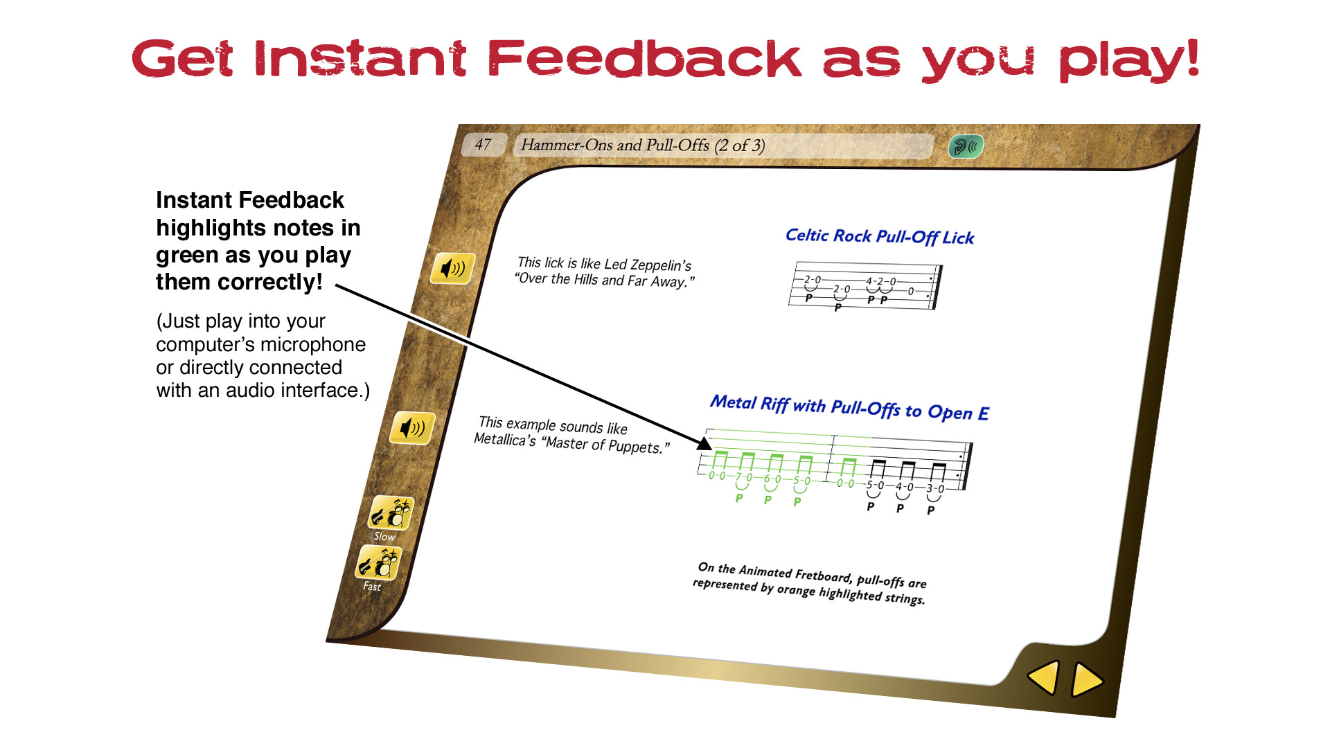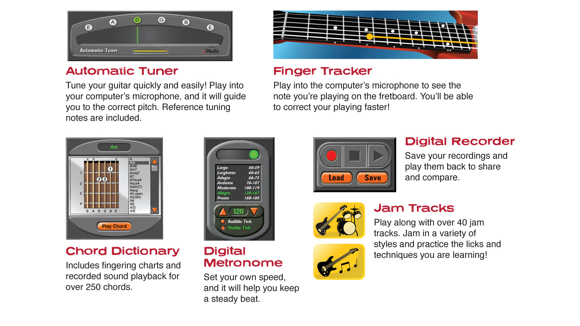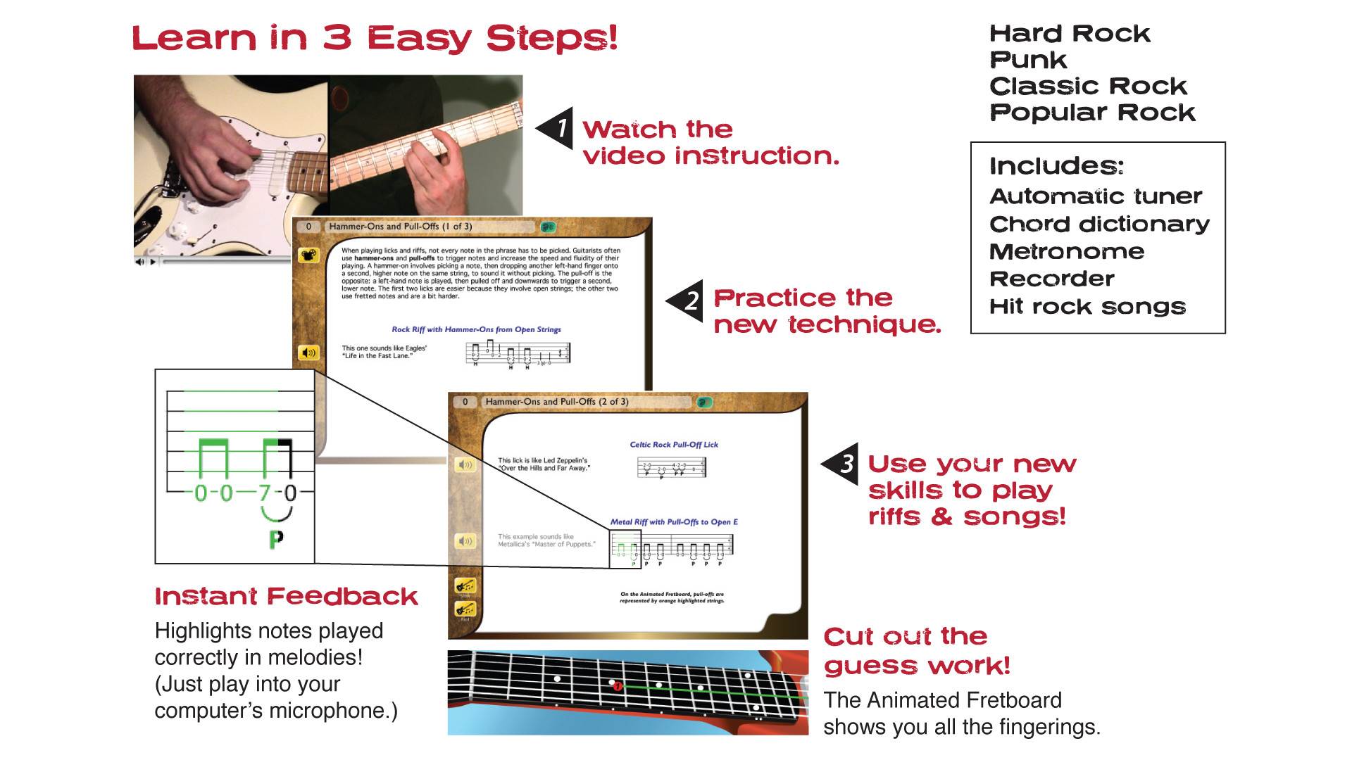 Learn Power Chords, Riffs and Rock Techniques for Rhythm and Lead Guitar. Charles McCrone, graduate of the Guitar Institute of Technology (famous training ground for rock guitarists), delivers over 100 lessons giving a complete overview of rock technique and gear. Learn rock basics like power chords and riffs, plus some lead necessities like the blues scale and string bends. You'll also learn about distortion, chorus, and other popular guitar effects pedals. The Animated Fretboard shows a real-time display of guitar riffs, string bends, and guitar tricks which are hard to see in simpler, video-only guitar lessons. eMedia Instant Feedback technology highlights correctly played notes, which makes learning faster and easier. Classic guitar songs by artists like The Kinks, Green Day, Blue Öyster Cult, Nirvana, and others make guitar practice fun as you master rock, punk, and metal guitar styles.Features Include. More than 50 videos with split-screen view and close-ups of both hands, lets you easily see the techniques used in the lessons. Rhythm guitar lessons with open chords, power chords (both open and moveable), palm muting, and other techniques.Instant Feedback that highlights notes in songs and riffs as they are played correctly (requires computer microphone).Lead guitar techniques such as string bends, vibrato, and hammer-ons, plus major, minor, and blues scales. eMedia's Animated Fretboard to easily see guitar fingerings for chords, guitar riffs, and guitar scales.Integrated guitar software tools, including an automatic guitar tuner, chord chart/dictionary, fingering charts, and metronome.Over 40 Jam Tracks with slow and fast versions and a backing band to make learning fun. Learn the blues scale, and then practice guitar riffs or lead guitar with a band!Hit guitar songs like "Paranoid" (Black Sabbath), "You Really Got Me" (Van Halen/ The Kinks), "Lake of Fire" (Nirvana), "Don't Fear the Reaper" (Blue Öyster Cult), "Tomorrow" (Silverchair), "All Right Now" (Free), and more!Guitar lessons and songs as both audio and MIDI tracks where selections can be looped, slowed down, or sped up. Далее