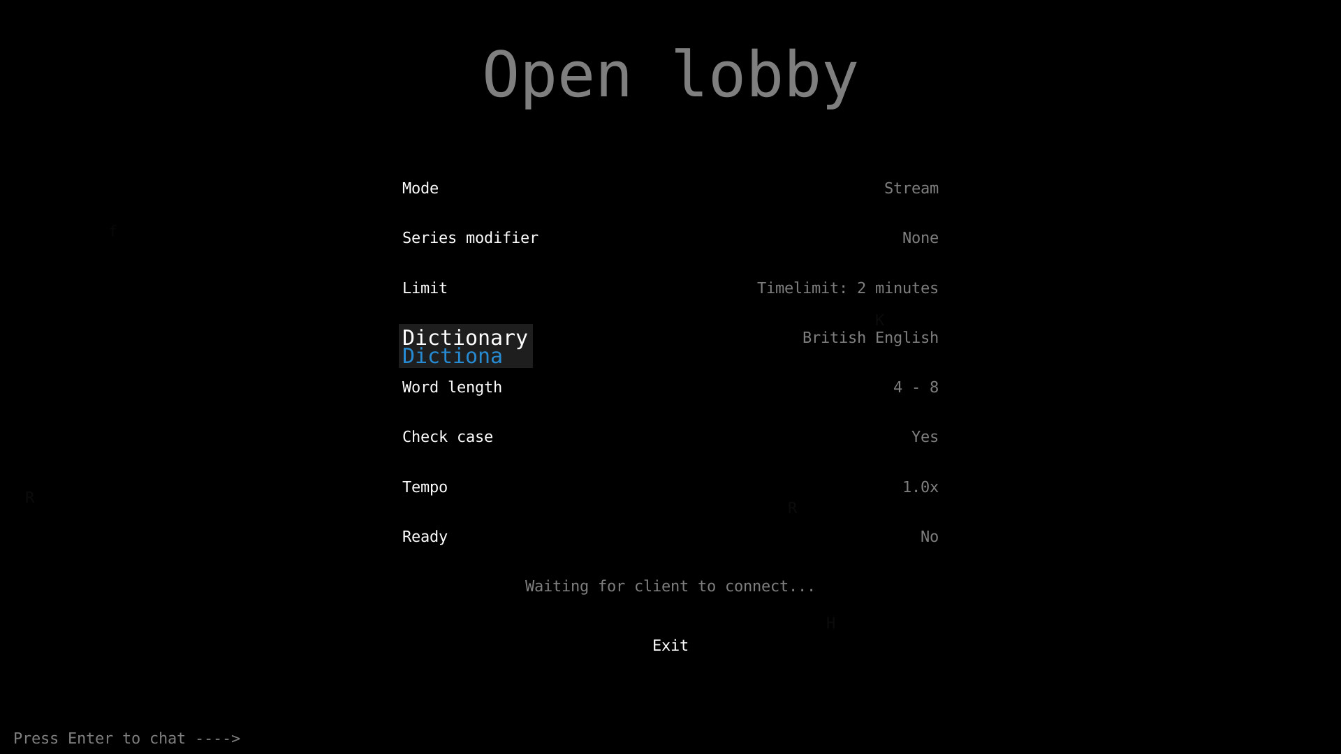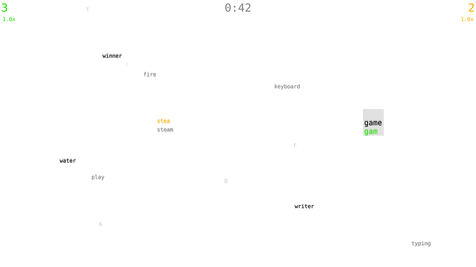 Typefighters is a competitive multiplayer game where two players battle each other using their typing skills. Its variety of modes does not only emphasise typing speed and correctness, but also other skills like reaction time, sustained attention, creativity, tactics and anticipating the opponents moves. Aside from being a tool to settle arguments on who is the best on a keyboard, the game can also be used for training purposes.Features: Show your friends who is the fastest typist! 8 modes requiring a variety of skills aside from typing speed and correctness Online and LAN multiplayer for two players Add your own word lists for additional languages and special challenges Adjustable singleplayer opponent Customizable color scheme Additional benefit of providing typing practiceAdditional features of the Steam Edition: Matchmaking (but please note that the playerbase is pretty small at the moment) Achievements Leaderboards Trading CardsIn regards to Multiplayer, the Steam version is fully compatible with the free version. As the serverlist is a Steam exclusive feature however, the other player needs your IP address to connect directly. Далее