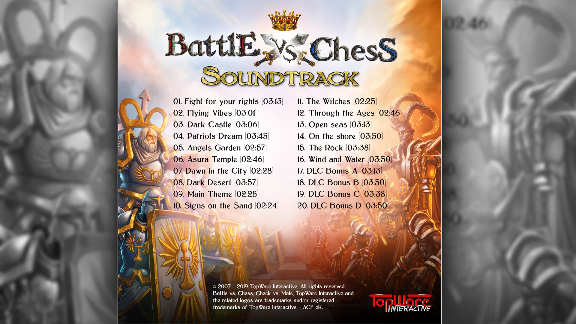 The Battle vs. Chess Art & Music Premium Pack is the perfect expansion for all players and allows deep insights into a fantastic chess universe.This Art & Music Premium Pack brings together the most striking artistic impressions of the game, giving you a fabulously entertaining trip into the wonderful world of Battle vs. Chess. The Digital Artbook and the Official Soundtrack provide an extraordinary opportunity to plunge into a world of breathtaking detail!Digital Artbook (70 pages, PDF) and six 4K Hi-Res Wallpaper. What's that? Ah, so you're into video games and fantasy art? OK, friends, then this elaborately designed art book is right up your street! It has 70 pages ofexclusive insights into the fantastic universe of “Battle vs. Chess”. Unpublished concept sketches straight from the developers, high-resolution rendered works of art and countless other fascinating detailed views already make this book a red-hot collector's edition!Battle vs. Chess Original Soundtrack - Playlist: 01. Fight for your rights -- 02. Flying Vibes -- 03. Dark Castle -- 04. Patriots Dream -- 05. Angels Garden -- 06. Asura Temple -- 07. Dawn in the City -- 08. Dark Desert -- 09. Main Theme -- 10. Signs on the Sand -- 11. The Witches -- 12. Through the Aages -- 13. Open seas -- 14. On the shore -- 15. The Rock -- 16. Wind and Water -- 17. DLC Bonus A -- 18. DLC Bonus B -- 19. DLC Bonus C -- 20. DLC Bonus D -- Далее