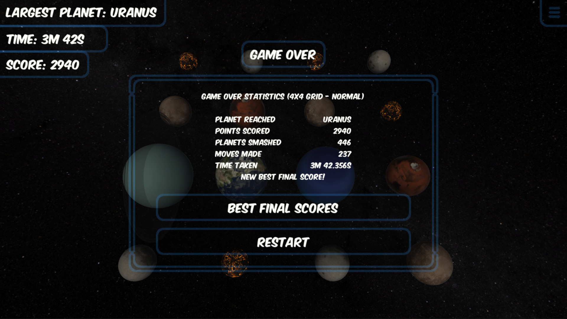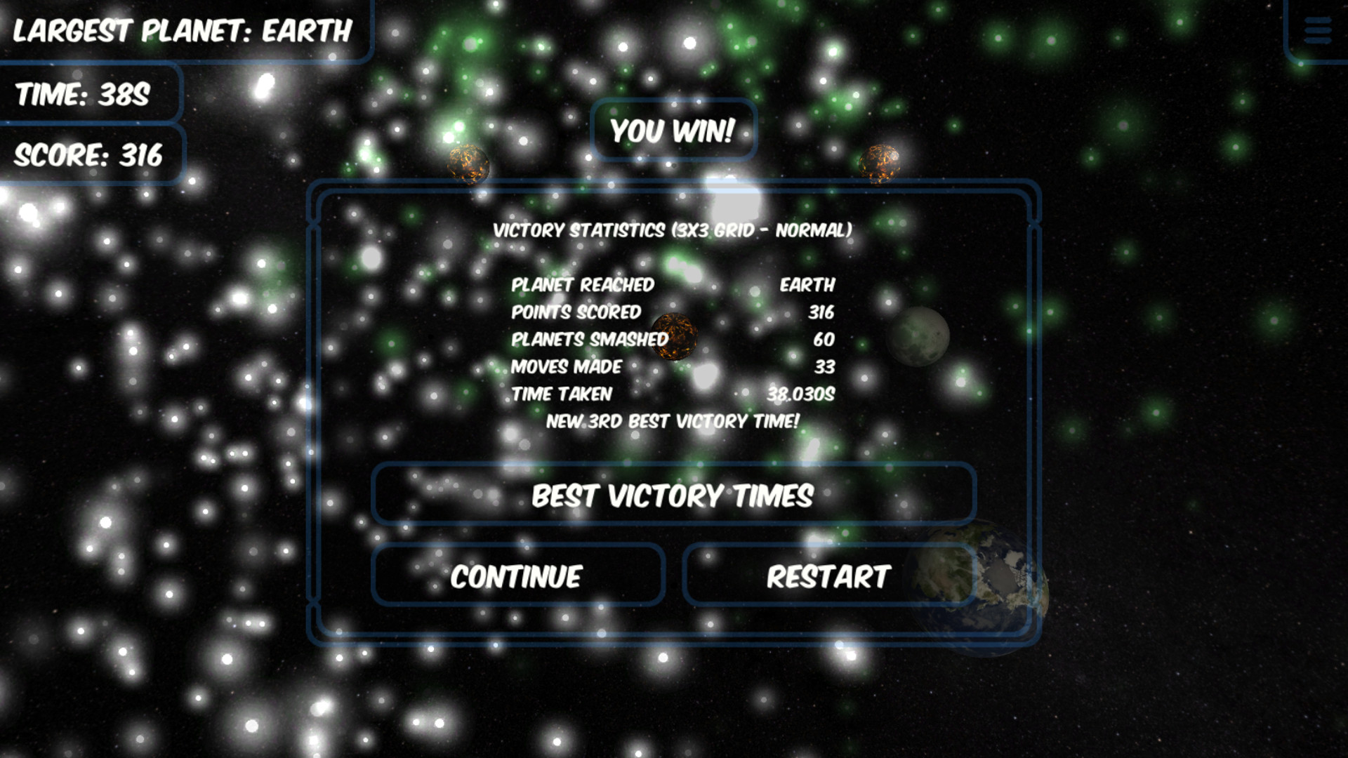 Smash planets together in this three dimensional puzzle game. Smash asteroids together to make moons, moons together to make planets, and planets together to make the stars and beyond. What can you create in your universe? How quickly can you create it?Satisfyingly addictive - the fate of the universe is in your hands..Key features: Play in 2D with keyboard and mouse, or experience fully immersive Virtual Reality and play in three dimensions with the HTC Vive or Oculus Rift. Completely unrealistic physics with outrageous explosions.Fully configurable with multiple challenges and difficulty levels.Online leaderboards and statistics.Steam achievements.Images courtesy of NASA/Goddard Space Flight Centre and NASA/JPL-Caltech. Controls: Keyboard: Fully configurable keyboard mapping - edit file "keyboard.cfg". Default mapping is to smash planets with WSAD / num-pad / arrow keys, shift and control, menu toggle with spacebar, select with WSAD / num-pad / arrow keys and return/enter, but can be easily edited to support any other mapping.Mouse: Smash planets by right clicking, moving in the desired direction and releasing. Menu toggle with the menu icon, select with point and right click.HTC Vive: Smash planets by pressing the trigger, moving in the desired direction and releasing. Menu toggle with the menu button, select with point and trigger.Controller: Fully configurable controller mapping - edit file "controller.cfg". Default mapping is for the XBox One controller, but can be easily edited to support other controllers / joysticks. Далее