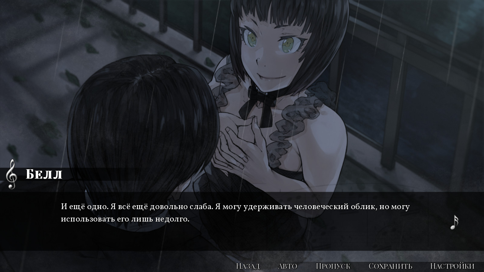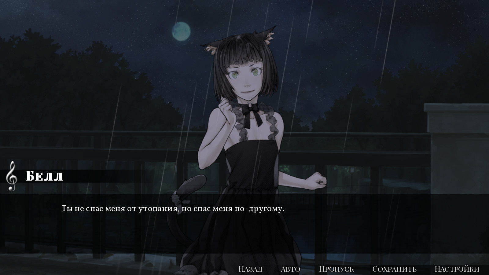 "Я люблю тебя за то, кто ты есть. Я любила тебя с того мгновения, что встретила".Жизнь отвернулась от Робина Хокинса. Его отношения с женой, Салли, застоялись, а его дочь, Мелоди, больше с ним не разговаривает.Он застрял на нелюбимой и иссушающей работе, и его жизнь - это глубокое бесконечное болото..Пока посреди ночи он не встречает таинственную девушку его мечты, Белл.Однако Белл не так проста, как кажется на первый взгляд - и прекрасный сон наяву Робина быстро грозит стать кошмаром.Это кинетическая визуальная новелла. В ней нет выборов/ветвлений.В ней около сорока тысяч слов.Содержит фансервис, сексуальное содержимое/наготу, неприличные ругательства, а также элементы психологического хоррора, которые могут обеспокоить некоторых читателей.Полностью оригинальные иллюстрации и музыка.Что самое важное, тут есть милая кошкодевочка! ❤ Далее