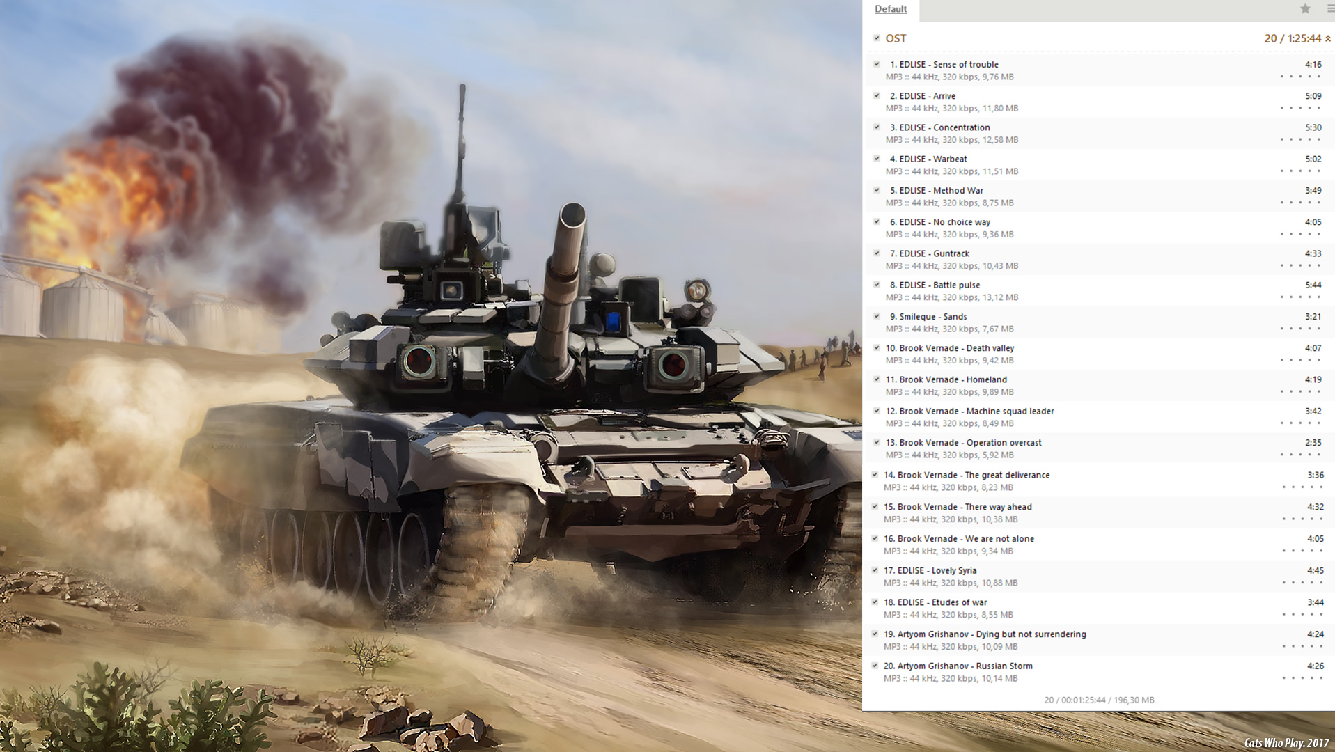 Саундтрек из игры "Сирия: Русская буря". После скачивания вы можете найти саундтрек в каталоге с игрой в подкаталоге OST или в музыкальном плеере Steam! Плейлист: 01-EDLISE-Sense of trouble - 4.16 02-EDLISE-Arrive - 5.09 03-EDLISE-Concentration - 5.30 04-EDLISE-Warbeat - 5.02 05-EDLISE-Method War - 3.49 06-EDLISE-No choice way - 4.05 07-EDLISE-Guntrack - 4.33 08-EDLISE-Battle pulse - 5.44 09-Smileque-Sands - 3.21 10-Brook Vernade - Death valley - 4.08 11-Brook Vernade - Homeland - 4.19 12-Brook Vernade - Machine squad leader - 3.42 13-Brook Vernade - Operation overcast - 2.35 14-Brook Vernade - The great deliverance - 3.36 15-Brook Vernade - There way ahead - 4.32 16-Brook Vernade - We are not alone - 4.05 17-EDLISE-Lovely Syria - 4.45 18-EDLISE-Etudes of war - 3.44 19-(BONUS) Artyom Grishanov - Dying but not surrendering (Vocal version) - 4.24 20-(BONUS) Artyom Grishanov - Russian Storm (Vocal version) - 4.26 Общее время звучания: 1ч 25м 44с Далее