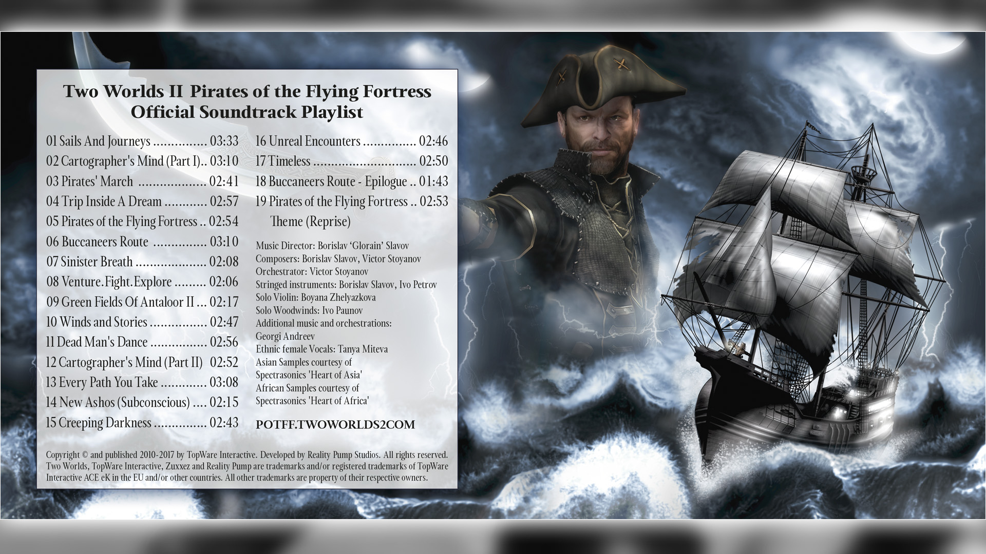 The epic Soundtrack of Two Worlds II - Pirates of the Flying Fortress full of atmospherically toned music will be a feast for your ears.Two Worlds II Pirates of the Flying Fortress - Official Soundtrack Playlist. 01 Sails And Journeys - 02 Cartographer's Mind (Part I) - 03 Pirates' March - 04 Trip Inside A Dream - 05 Pirates of the Flying Fortress - 06 Buccaneers Route - 07 Sinister Breath - 08 Venture.Fight.Explore - 09 Green Fields Of Antaloor II - 10 Winds and Stories - 11 Dead Man's Dance...The epic Soundtrack of Two Worlds II - Pirates of the Flying Fortress full of atmospherically toned music will be a feast for your ears.Two Worlds II Pirates of the Flying Fortress - Official Soundtrack Playlist. 01 Sails And Journeys - 02 Cartographer's Mind (Part I) - 03 Pirates' March - 04 Trip Inside A Dream - 05 Pirates of the Flying Fortress - 06 Buccaneers Route - 07 Sinister Breath - 08 Venture.Fight.Explore - 09 Green Fields Of Antaloor II - 10 Winds and Stories - 11 Dead Man's Dance - 12 Cartographer's Mind (Part II) - 13 Every Path You Take - 14 New Ashos (Subconscious) - 15 Creeping Darkness - 16 Unreal Encounters - 17 Timeless - 18 Buccaneers Route - Epilogue - 19 Pirates of the Flying Fortress Theme (Reprise) -Далее
