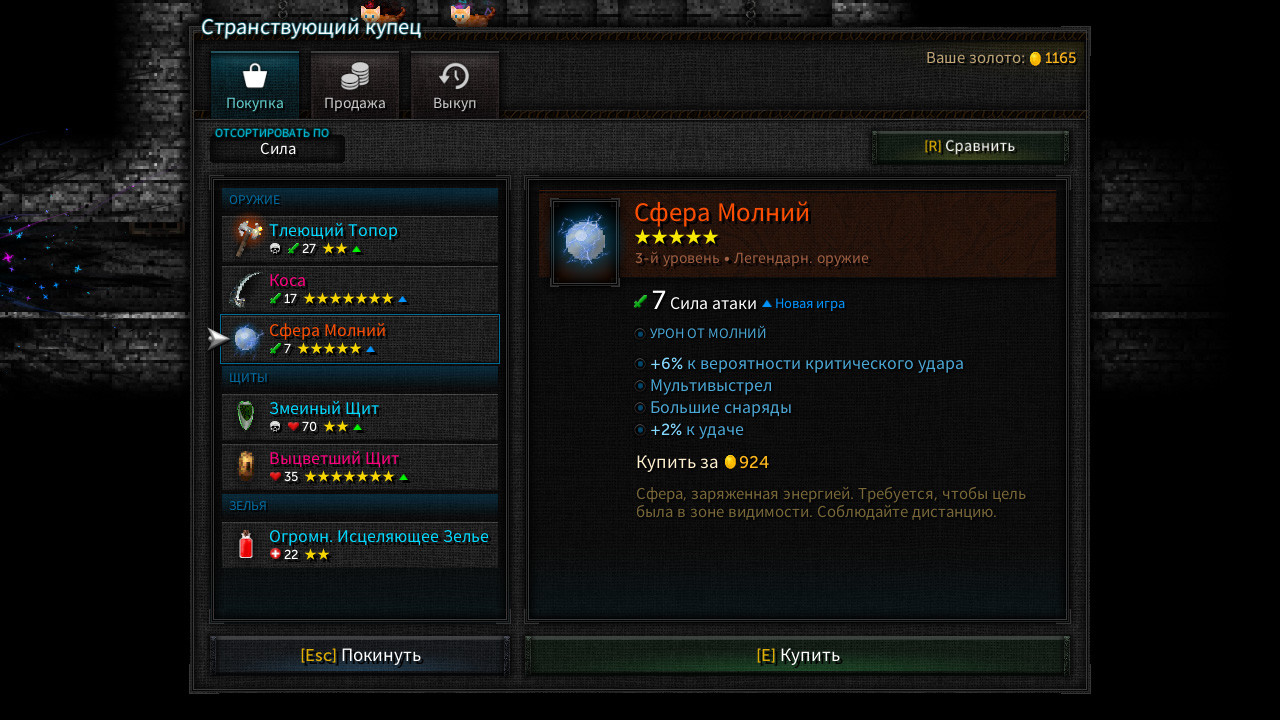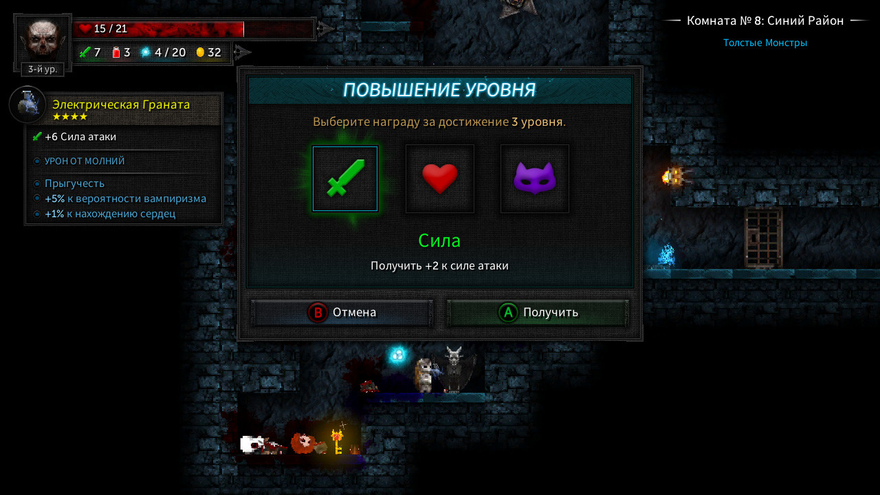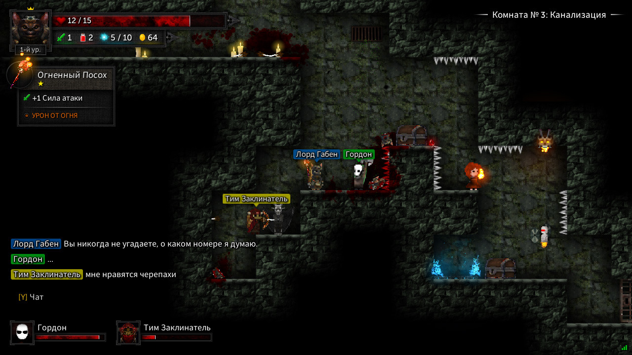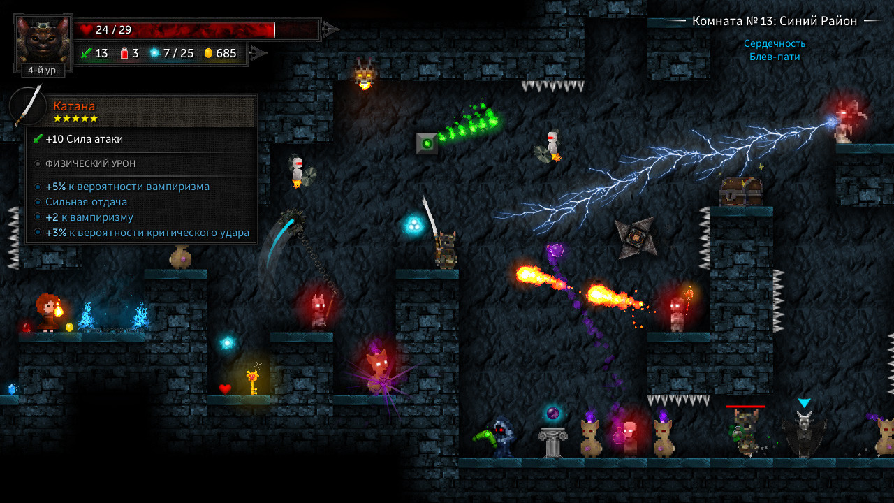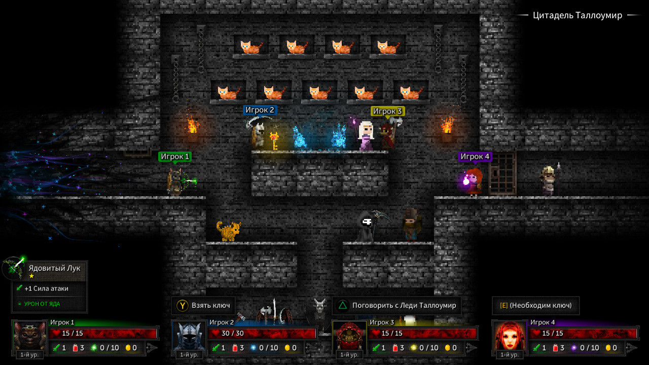 Котята Леди Таллоумир в последнее время ведут себя странно. Но проводить ритуалы все-таки нужно. Сколько комнат вам удастся зачистить, несмотря на необычные обстоятельства?Круши и покоряй: Держи щит повыше, чтобы выжить.Уничтожай врагов. Находи ключи, чтобы продвигаться по подземелью.Поднимай уровни. Получай новое вооружение, щиты, благословения и зелья, чтобы развить своего персонажа.Достигни высот таблицы лидеров, покорив как можно больше комнат.Постоянно меняющееся подземелье: ПРОЦЕДУРНОСТЬ, ПРИСУЩАЯ ЖАНРУ РОУГ-ЛАЙК. Комнаты, враги и различные модификаторы генерируются случайным образом от забега к забегу.ИГРАЙ В СОБСТВЕННОМ СТИЛЕ. Выбирай стартового персонажа и оружие перед каждым приключением.СРАЖАЙСЯ. Чем больше комнат ты проходишь, тем больше врагов появляется.ОСВОЙ ОРУЖИЕ. Используй предметы по назначению – все типы оружия ведут себя по-разному.ЛУТ. Чем глубже ты спускаешься, тем более качественные и ценные предметы будут попадаться.СЛЕДИ ЗА ЗДОРОВЬЕМ. Пей зелья, находи сердца или посещай Леди Таллоумир для лечения.ОТКРЫВАЙ. Расширяй стартовый арсенал, продвигаясь как можно дальше по подземелью. Награды достойны лишь успехи, а не провалы.Режимы игры: Одиночная играОффлайн кооператив (один экран, до 4-х игроков)Онлайн кооператив (до 4-х игроков)Технические особенности: Поддержка мыши, клавиатуры и контроллераСохранение и возобновление игры в любом местеИнтеграция с таблицей достижений Steam для оправданного бахвальстваПоддержка Steam Cloud для сохраненных игр, рекордов, достижений и настроекНастройка биндов клавиш и кнопок, масштабирования пользовательского интерфейса, тряски экрана, пост-эффектов, разрешения, частоты кадров и многого другого Далее
