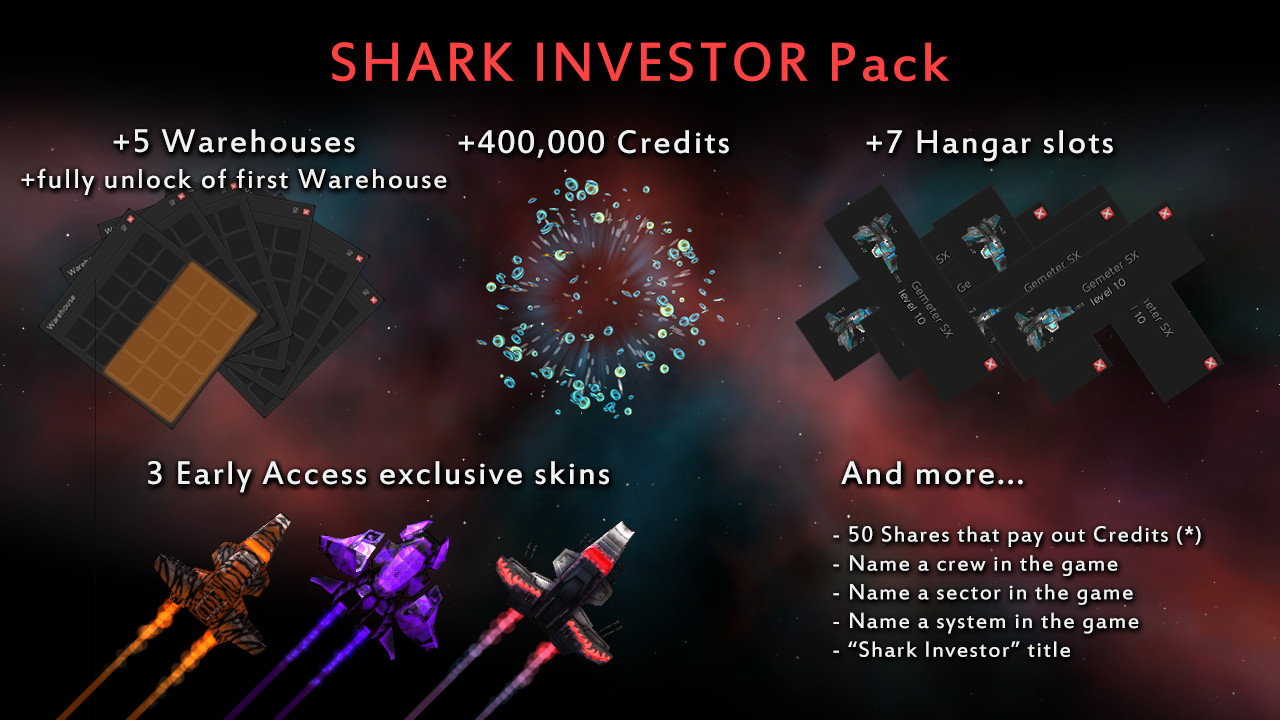 The Shark Investor Pack contains the following:unlock the remaining 15 item slots in your first Warehousean additional 5 extra Warehouses of 25 item slots each7 extra ship slots in your Hangarthe Tiger skin for Gemeter ships (Early Access exclusive)the Panther skin for Astrolax ships (Early Access exclusive)the White Shark skin for Gemeter ships (Early Access exclusive)400,000 Credits50 Shares that will keep paying out Credits (Early Access exclusive)the right to name a crew in the game (Early Access exclusive)the right to name a sector in the game (Early Access exclusive)the right to name a system in the game (Early Access exclusive)the Shark Investor titleEarly Access exclusive: Items marked as Early Access exclusive are only available if you purchase these packs while the game is in Early Access. They are immediately available, and you will get to keep them after the game release too. There will be no way to get these items after the game leaves Early Access.Credits: Credits are used to purchase advanced versions of the playable ships once you have unlocked them in the game. Credits can be earned in the game by conquering sectors; thus the Credits you obtain in the packs are just a quality-of-life improvement, and are in no way necessary to enjoy the full content of the game.Shares: Shares represent a way for you, the player, to "invest" in the success of Gangs of Space. At the end of the conquest of every Galaxy, we will compute all Credits spent by all players during the conquest, and give back 10% of this sum as "dividends" to players with Shares. Thus, the more players play Gangs of Space, the more Credits you will earn regularly.Obtaining Shares is only possible during Early Access, but they will continue to produce Credits after the release of the game. It is an original way for us to reward the players that believe in us before anyone else!IMPORTANT: Shares work like real-world shares for publicly-traded companies, but they are only a gameplay element. We are *not* giving back real-world money, and these Shares do *not* give you any legal right on the company that produces the game.Multiple packs: If you purchase multiple packs, please note that the "remaining 15 item slots in your first Warehouse" will be unlocked only once. All the other rewards will be added up to your account properly. Далее